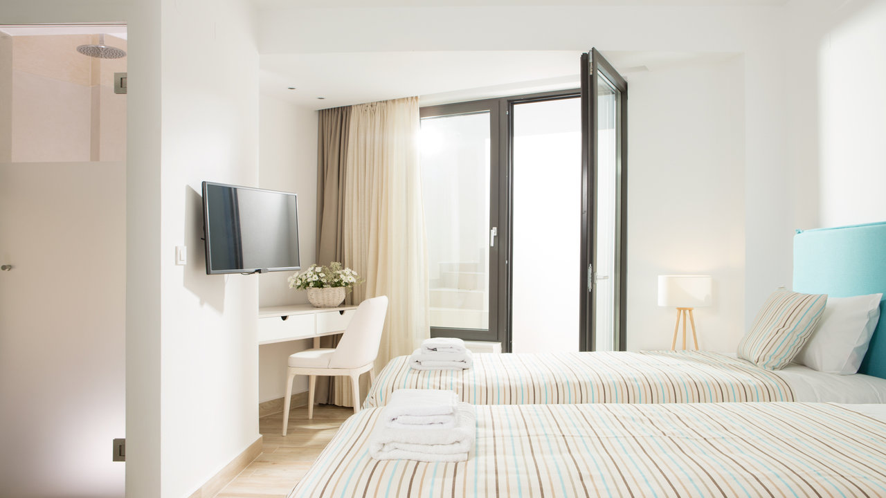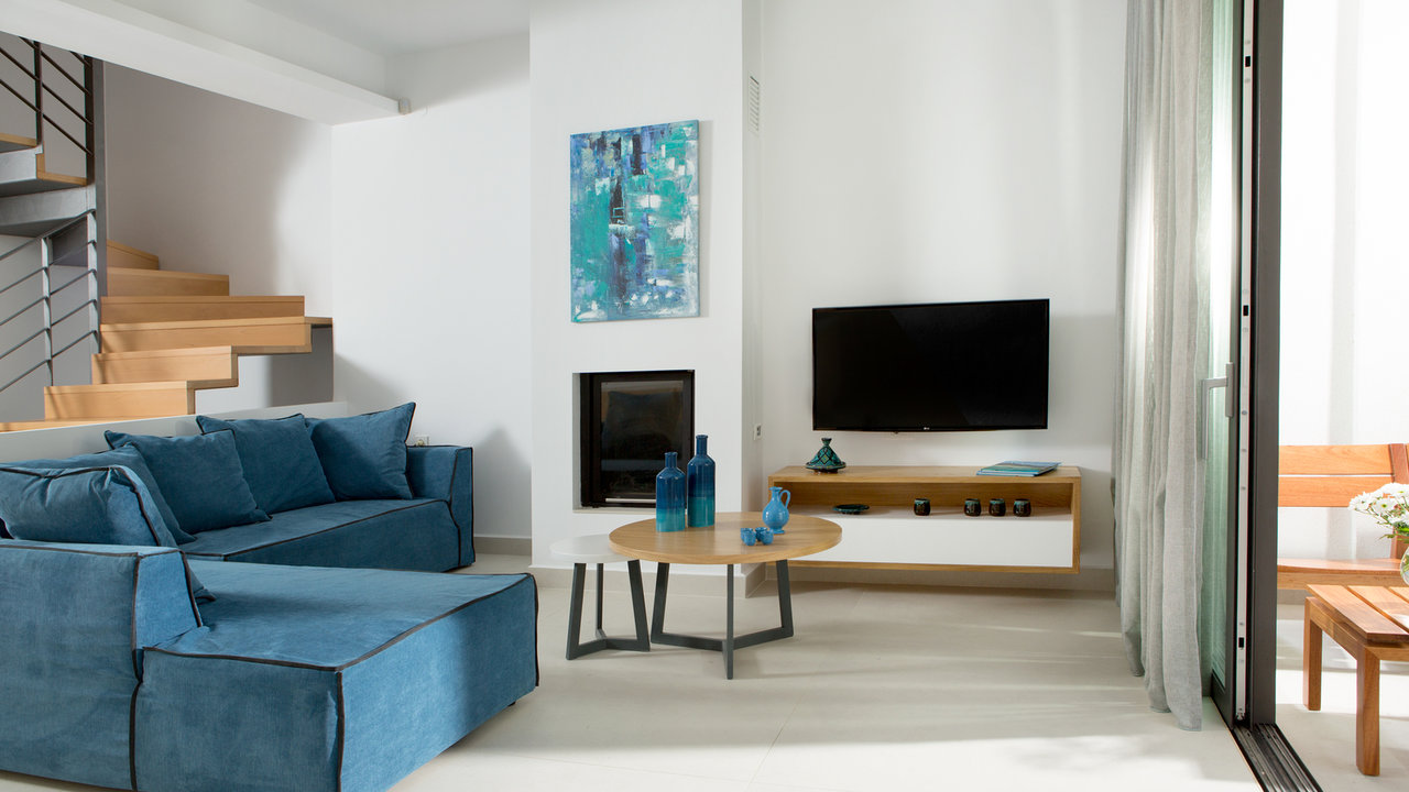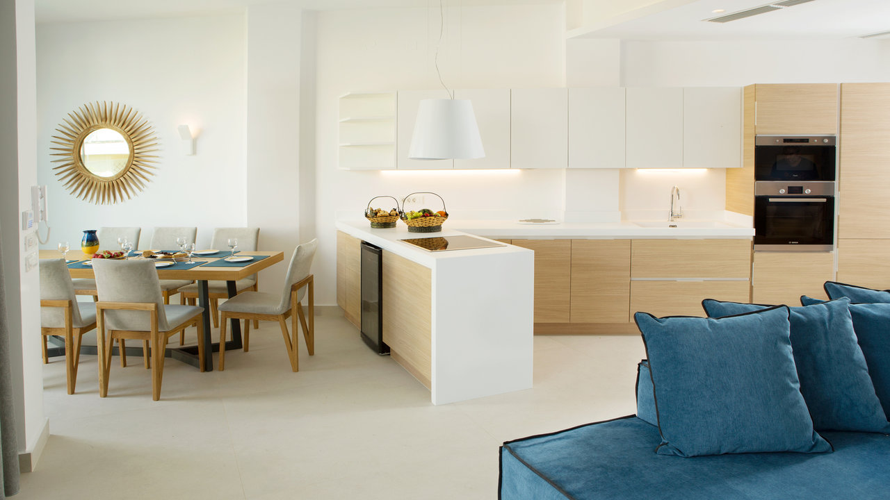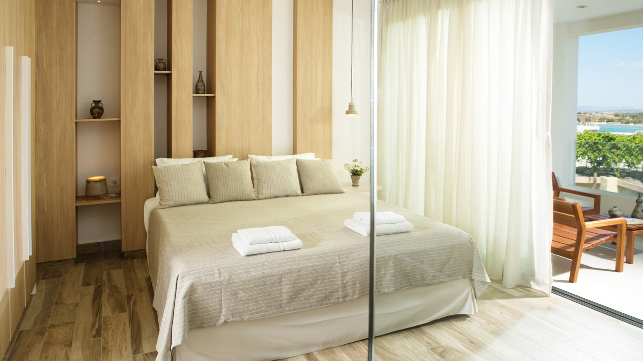 Guests will enjoy a wide range of amenities including a welcome hamper, a minibar, smart and satellite TV, free Wi-Fi, 24/7 e-concierge services and a wide range of extra services upon your request. There is also a kitchenette and a separate dining area that seats eight adults. You even get a private garden by the plunge pool with sun beds and a shaded outdoor lounge. Each bedroom also has access to a balcony with sweeping views of the Cretan Sea and the distant islands.
