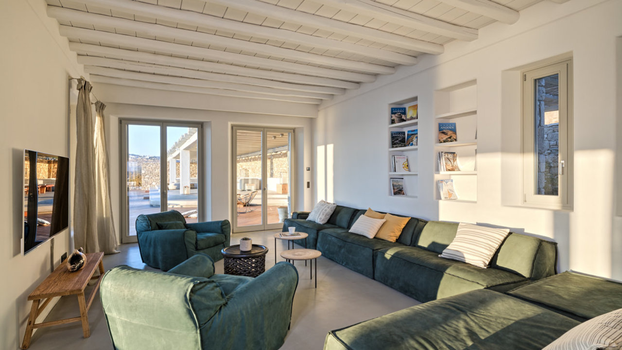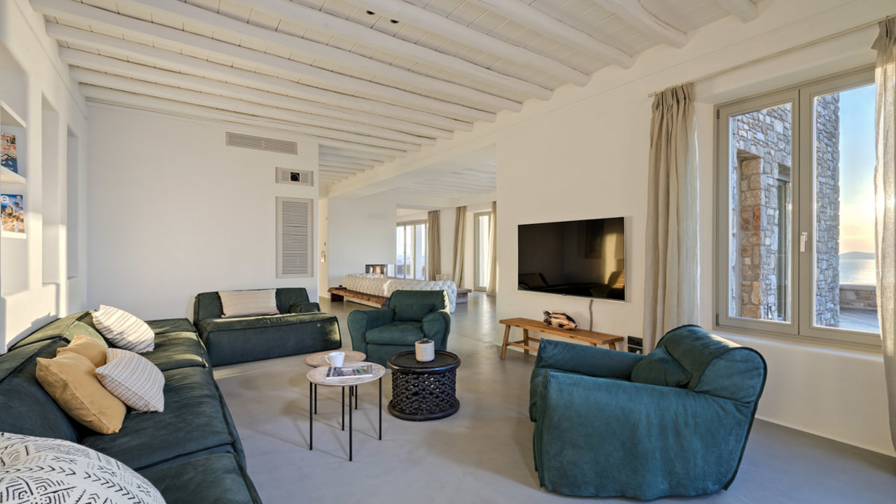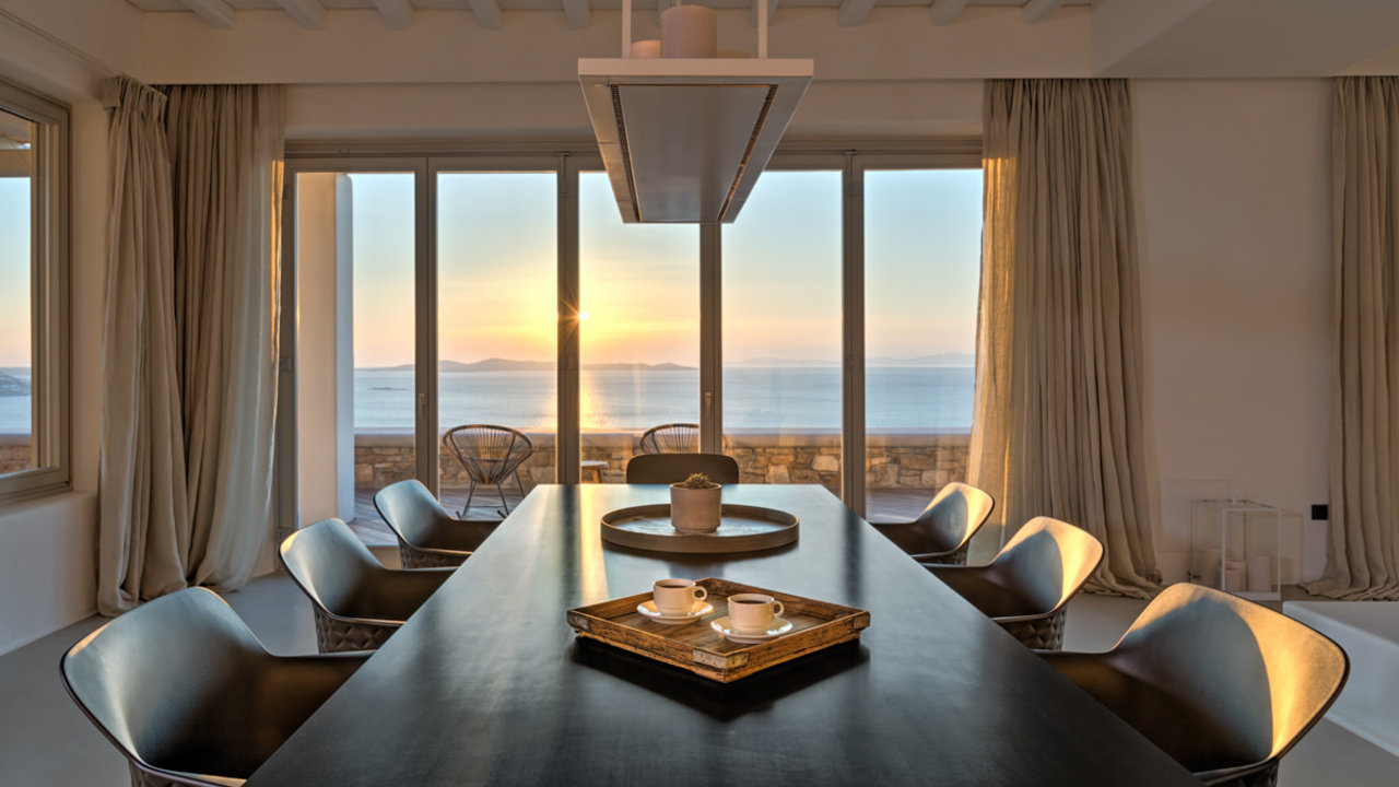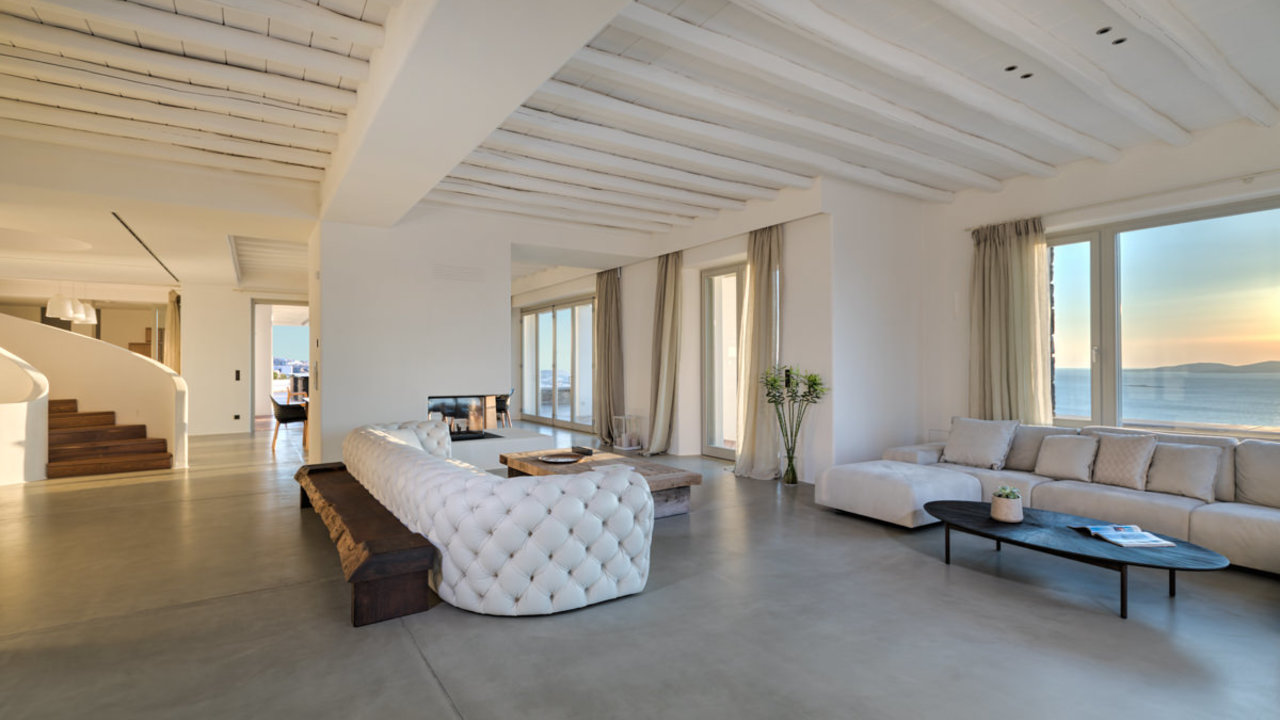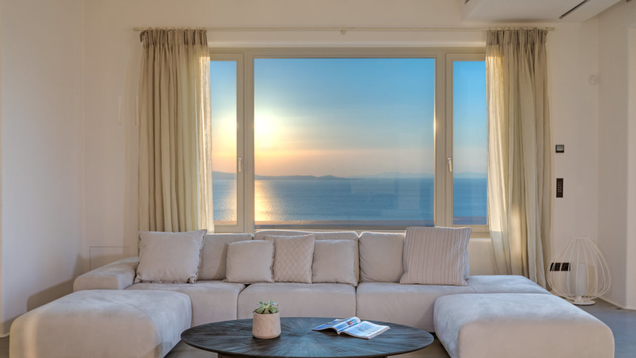 Ideally located in Tourlos, villa Absolute is the epitomy of opulence and celestial living. In this 1000 squared meters area, there is an enormous infinity pool and a Jacuzzi, surrounded by greenery and shaded by wonderful palm trees. This marvelous ocean-front estate is built in the most privilleged areas in Mykonos, offering a Cycladic ambience of high end luxury with marvelous crystal vista of the Aegean sea.