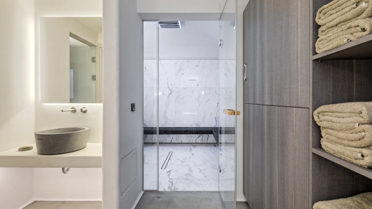 The villa can spoil even the most discrete guests. Absolute can accommodate 16 people into 7 VIP and 1 VVIP suites with ample space and en suited bathrooms. The bedrooms offer azure astonishing views of the ocean through large windows that welcomes the sunlight in. The interior area of the villa is a Mykonian gem which will guide your vacation through the essence of comfortable living. This majestic retreat has more than every features that you may need. It provides you a massage room, a cinema room, a fully equipped gym and a huge parking. The rooms of the house are elegantly decorated and the mood is sumptuous and cozy.