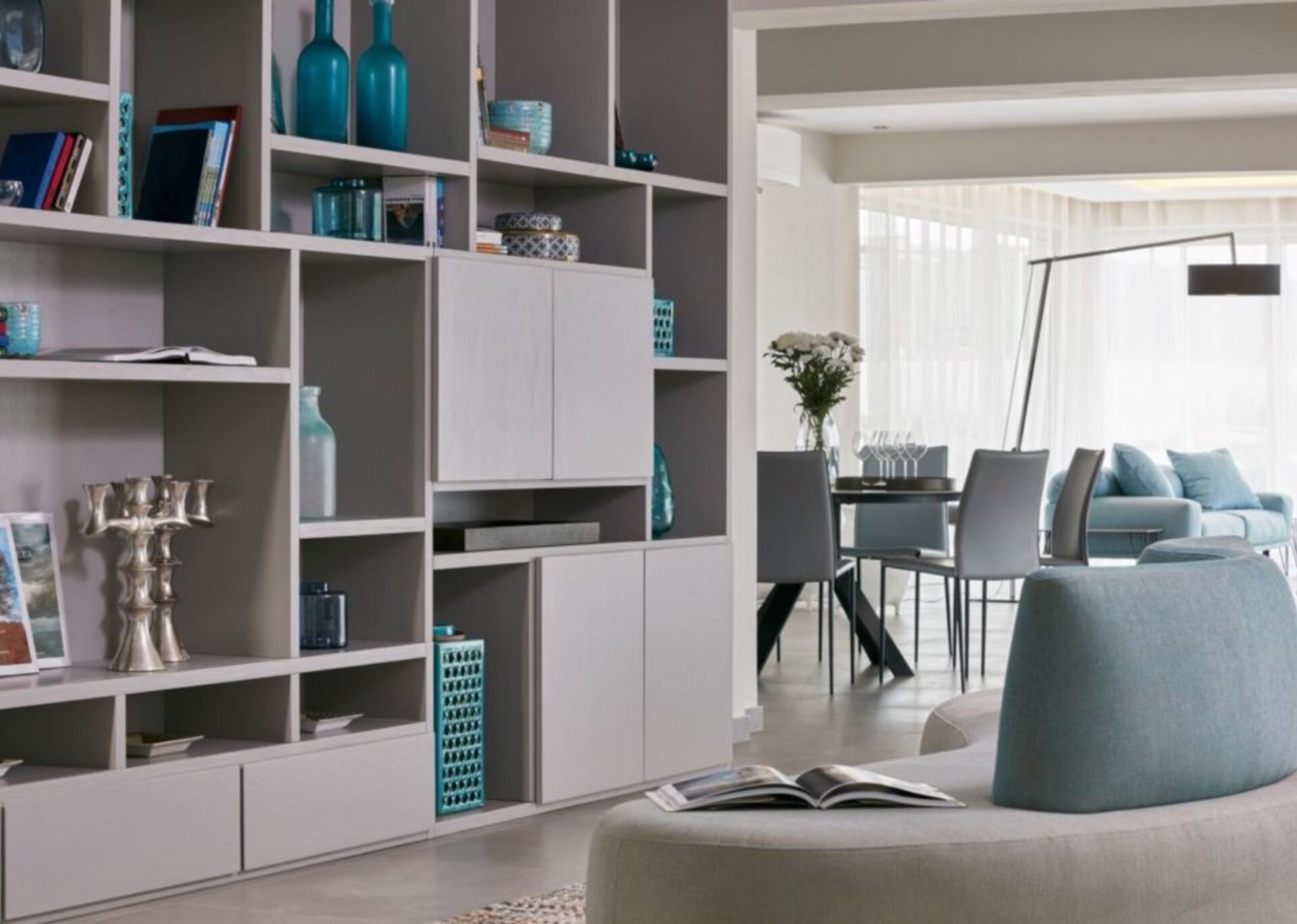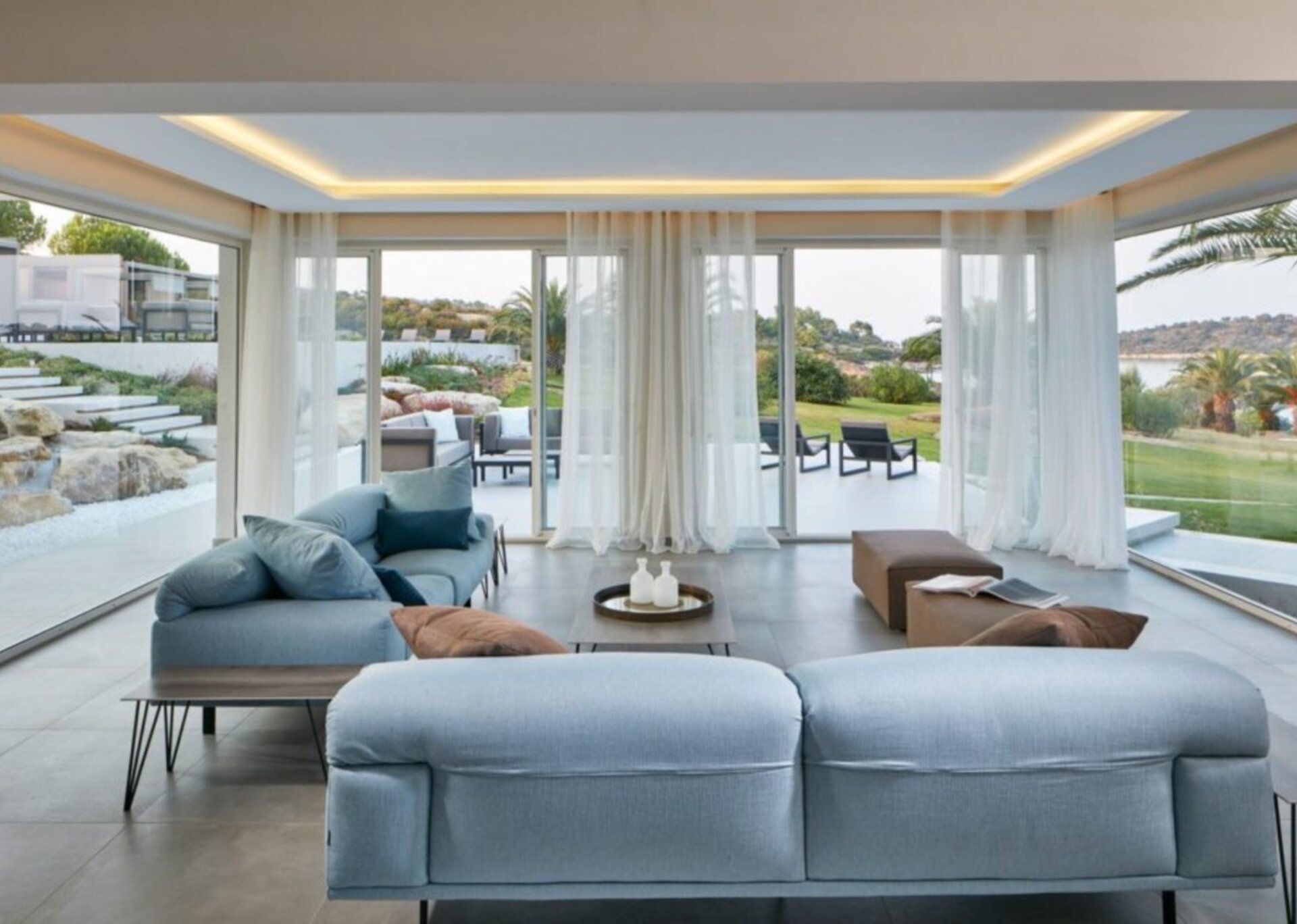 The indoor space of this impeccable villa is elegantly designed and meticulously decorated to capture the essence of luxurious living. The living room is furnished with high-end, luxury pieces, creating a sumptuous and cozy atmosphere. There is also a charming inner dining area, perfect for hosting family and friends and creating lasting memories. For those who need to work, the interior terrace includes a quiet office and meeting room.