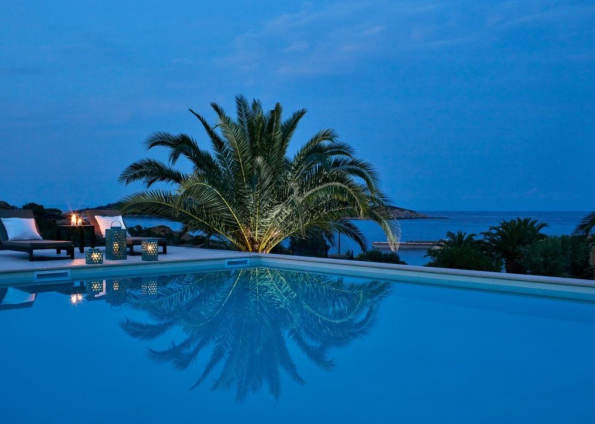Take in the breathtaking sea and sunset views from your very own private property, featuring plentiful outdoor lounging and dining areas, a lush garden filled with greenery and trees, and an inviting swimming pool.