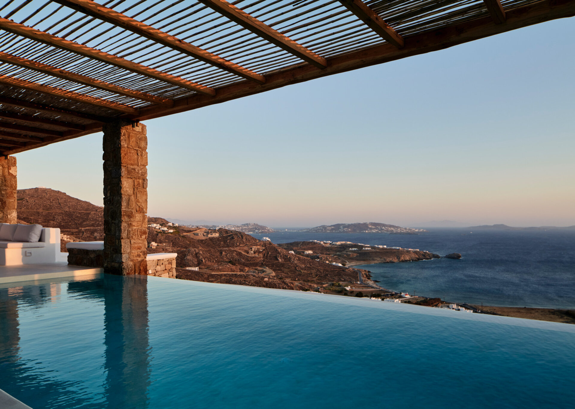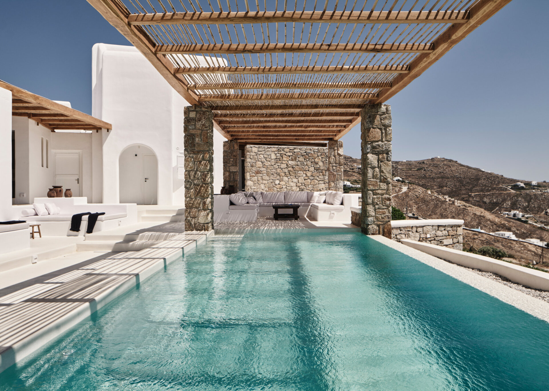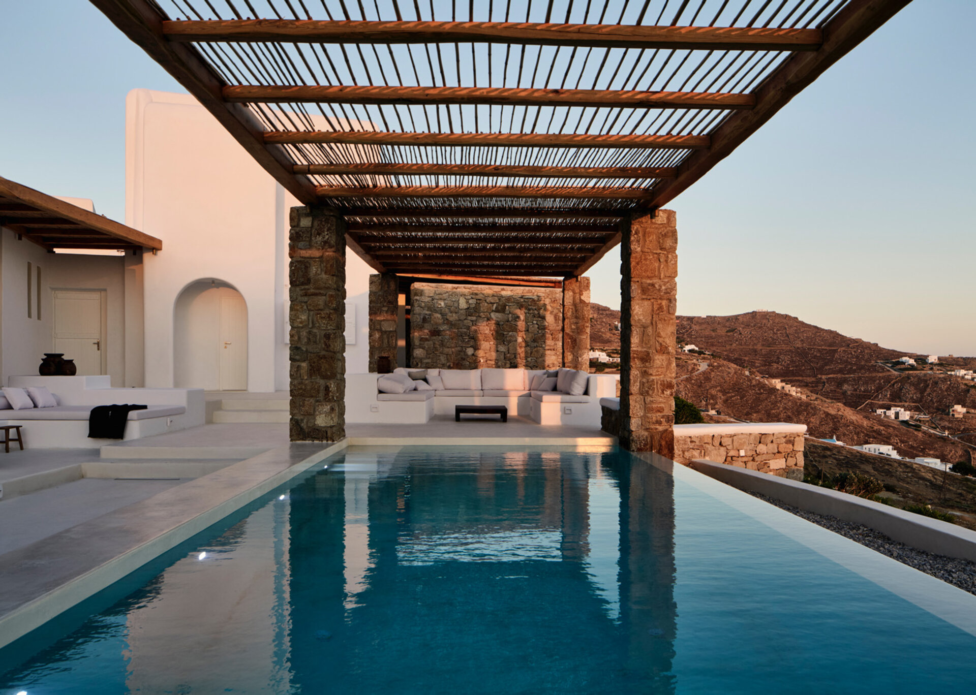 The villa's allure is further enhanced by the breathtaking panoramic views it offers, encompassing the azure sea and picturesque sunsets over the islands of Delos, Rhenia, and Tinos. The indoor spaces are designed to provide a welcoming retreat, complemented by the infinity swimming pool, heated plunge pool, al fresco dining area, and pergola-shaded verandas that beckon guests to unwind and embrace the serenity of their surroundings.
