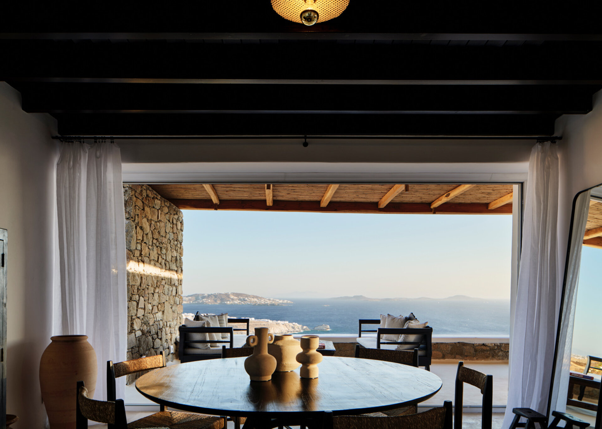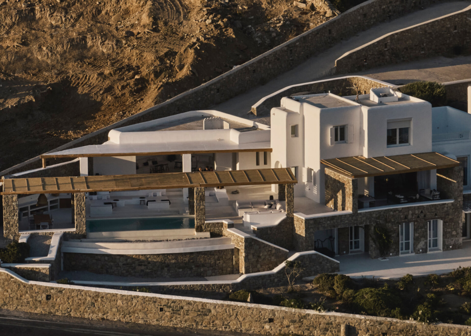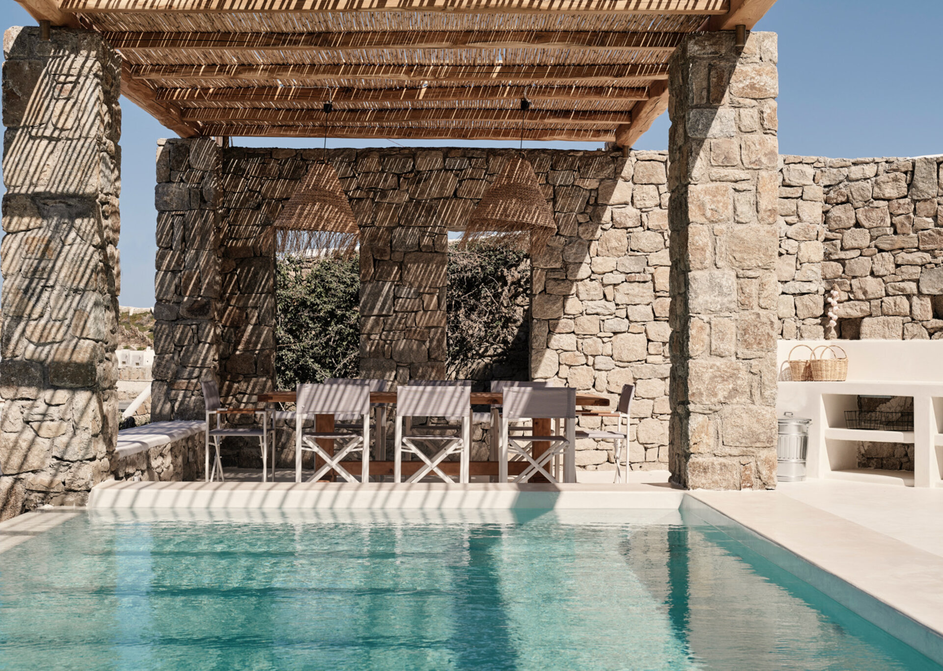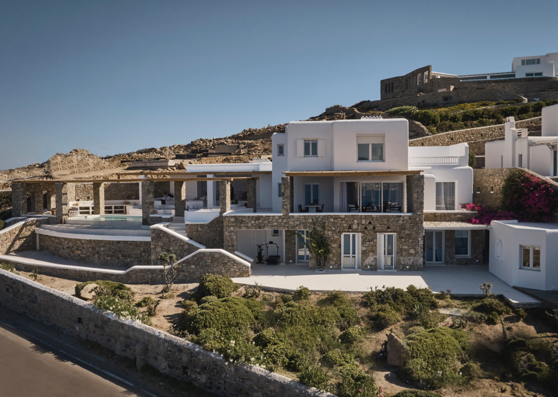 The villa's allure is further enhanced by the breathtaking panoramic views it offers, encompassing the azure sea and picturesque sunsets over the islands of Delos, Rhenia, and Tinos. The indoor spaces are designed to provide a welcoming retreat, complemented by the infinity swimming pool, heated plunge pool, al fresco dining area, and pergola-shaded verandas that beckon guests to unwind and embrace the serenity of their surroundings.