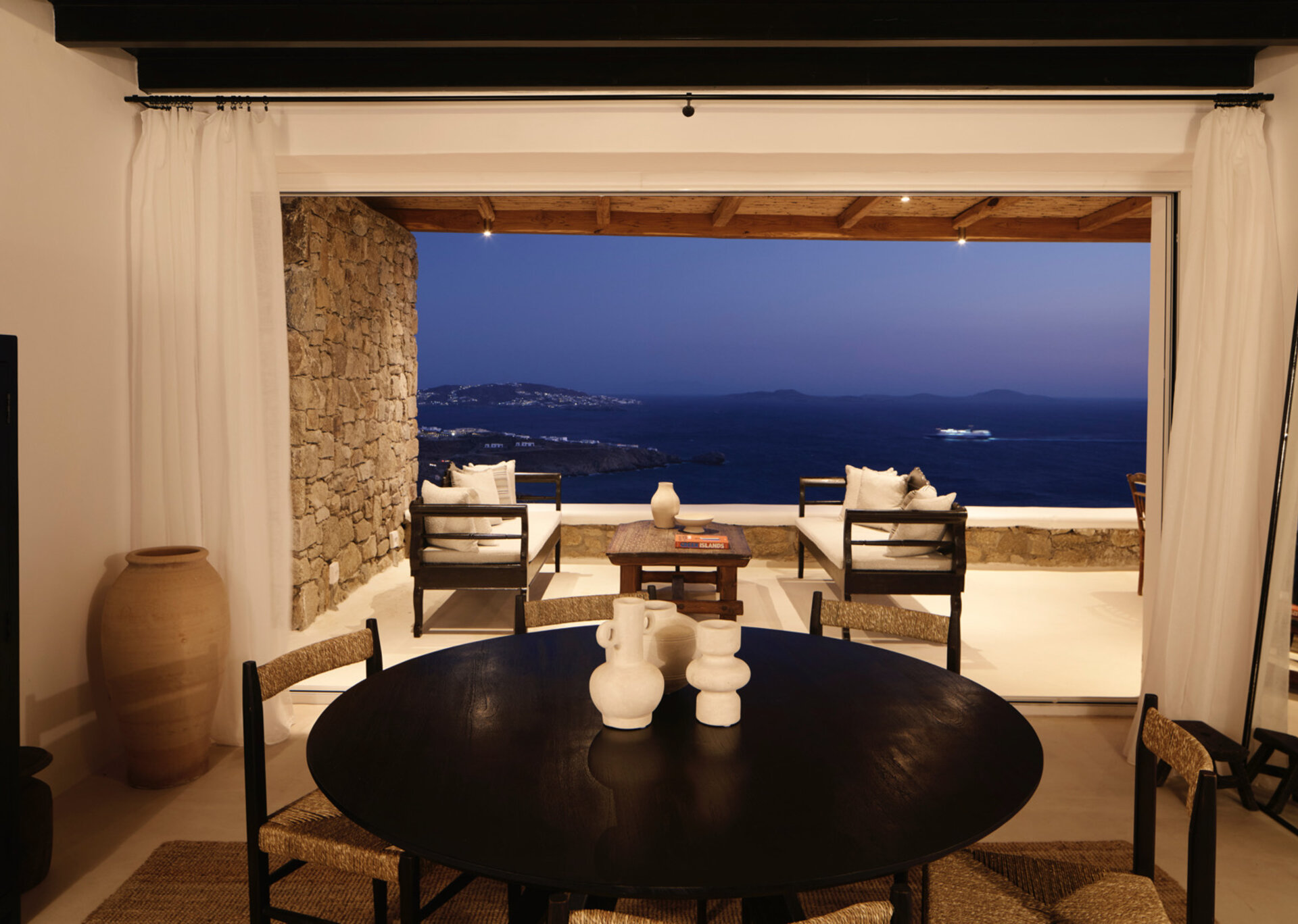 sizeable pi-shaped built-in sofa and a tall glass opening with sea and sunset view