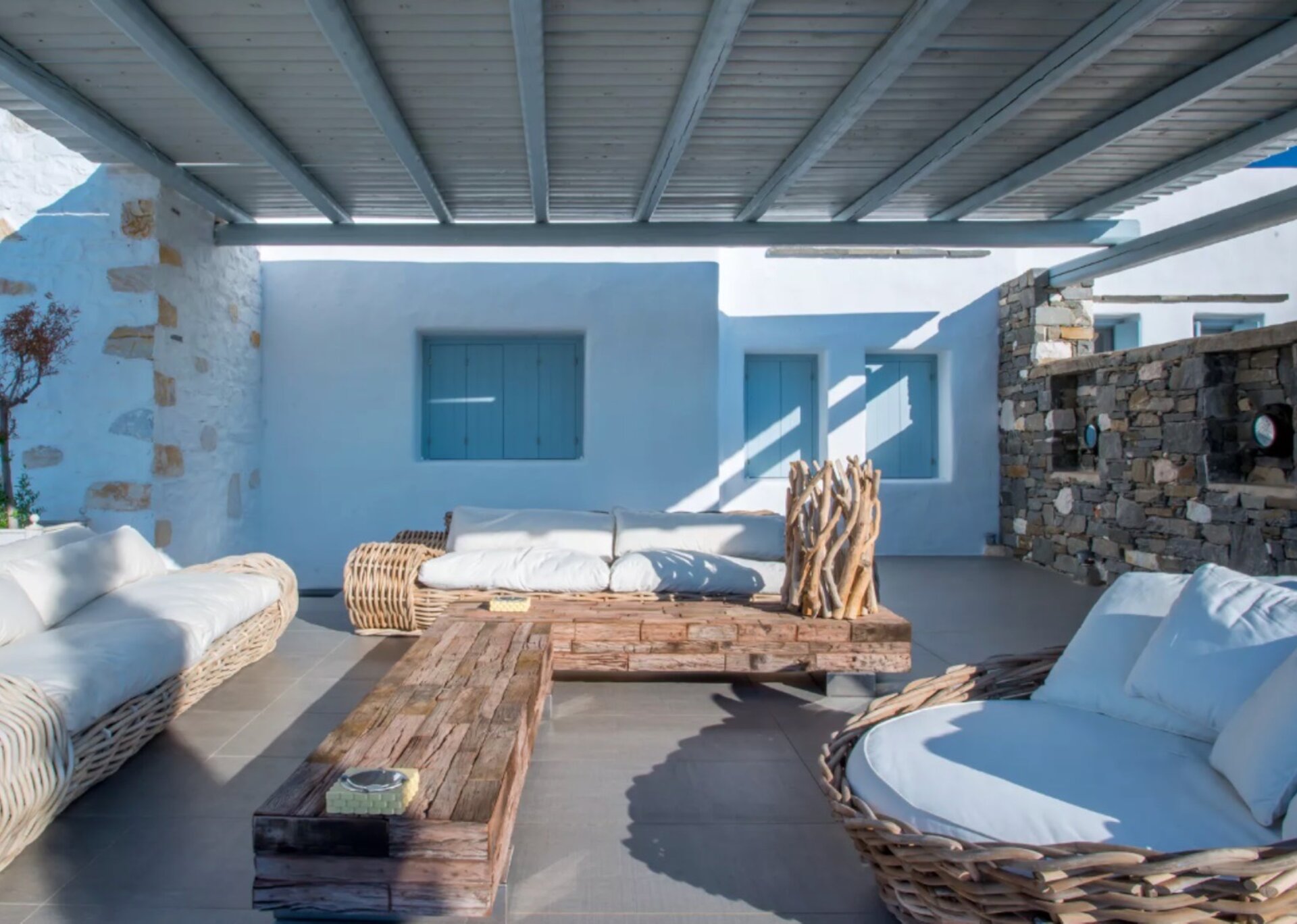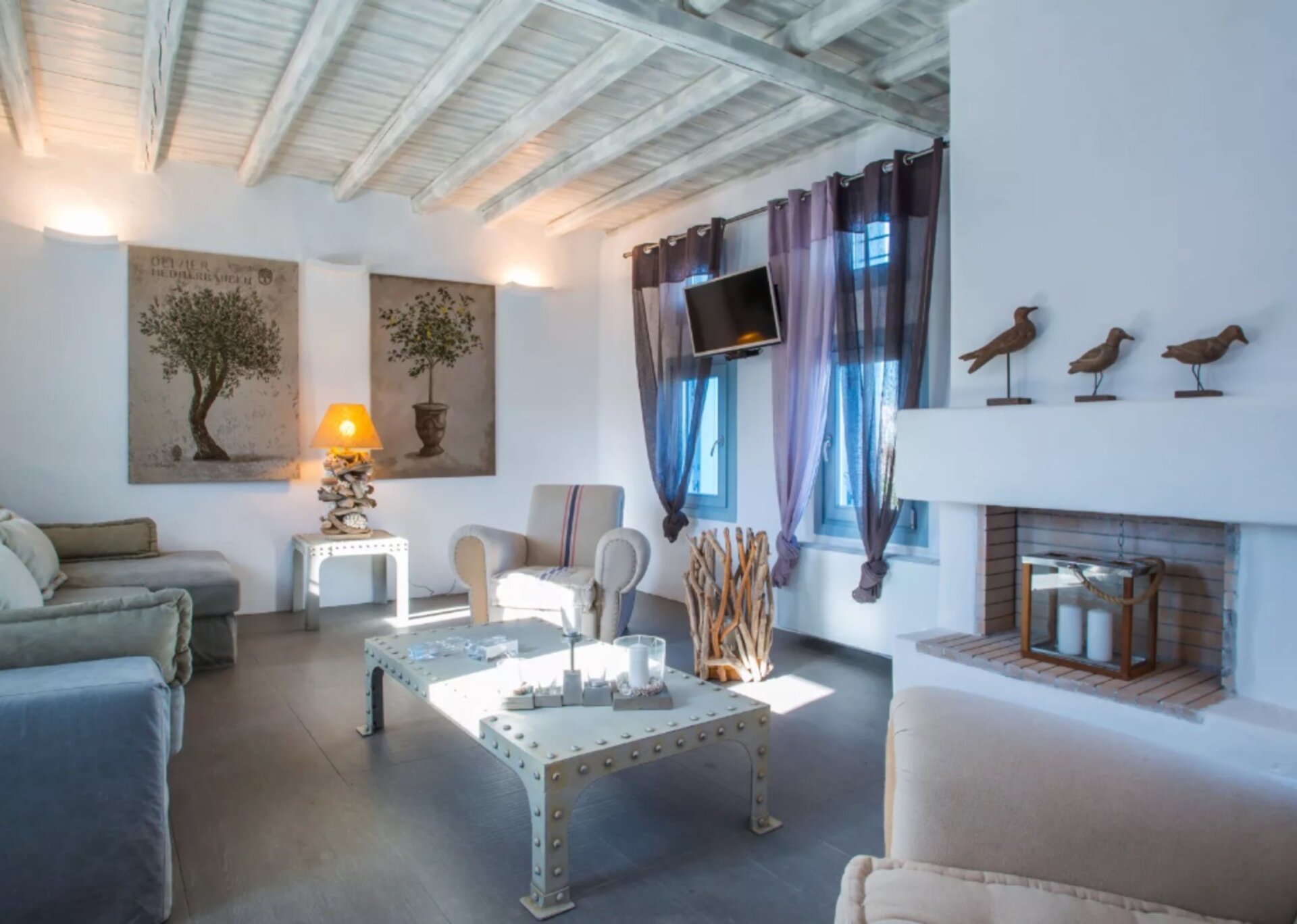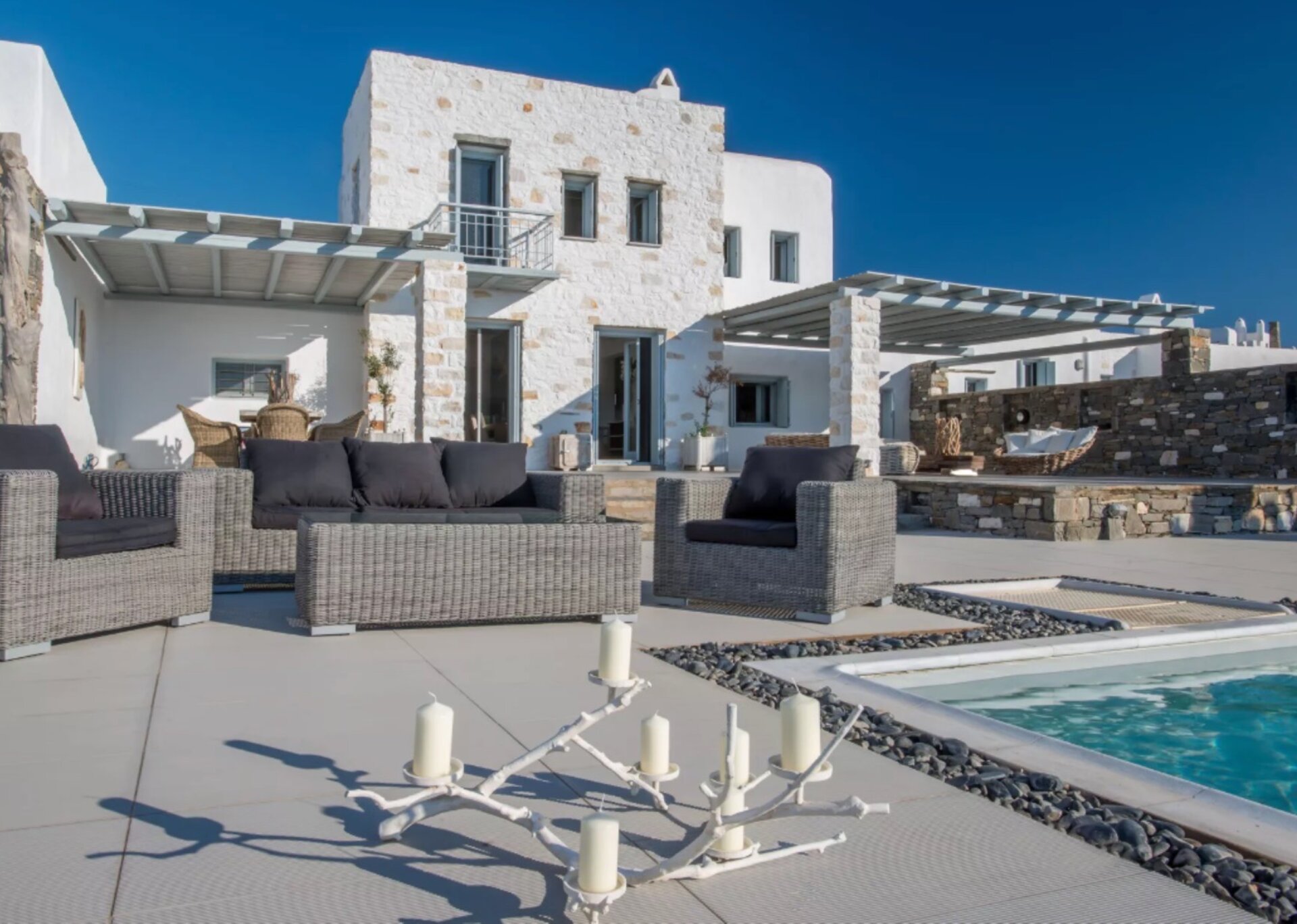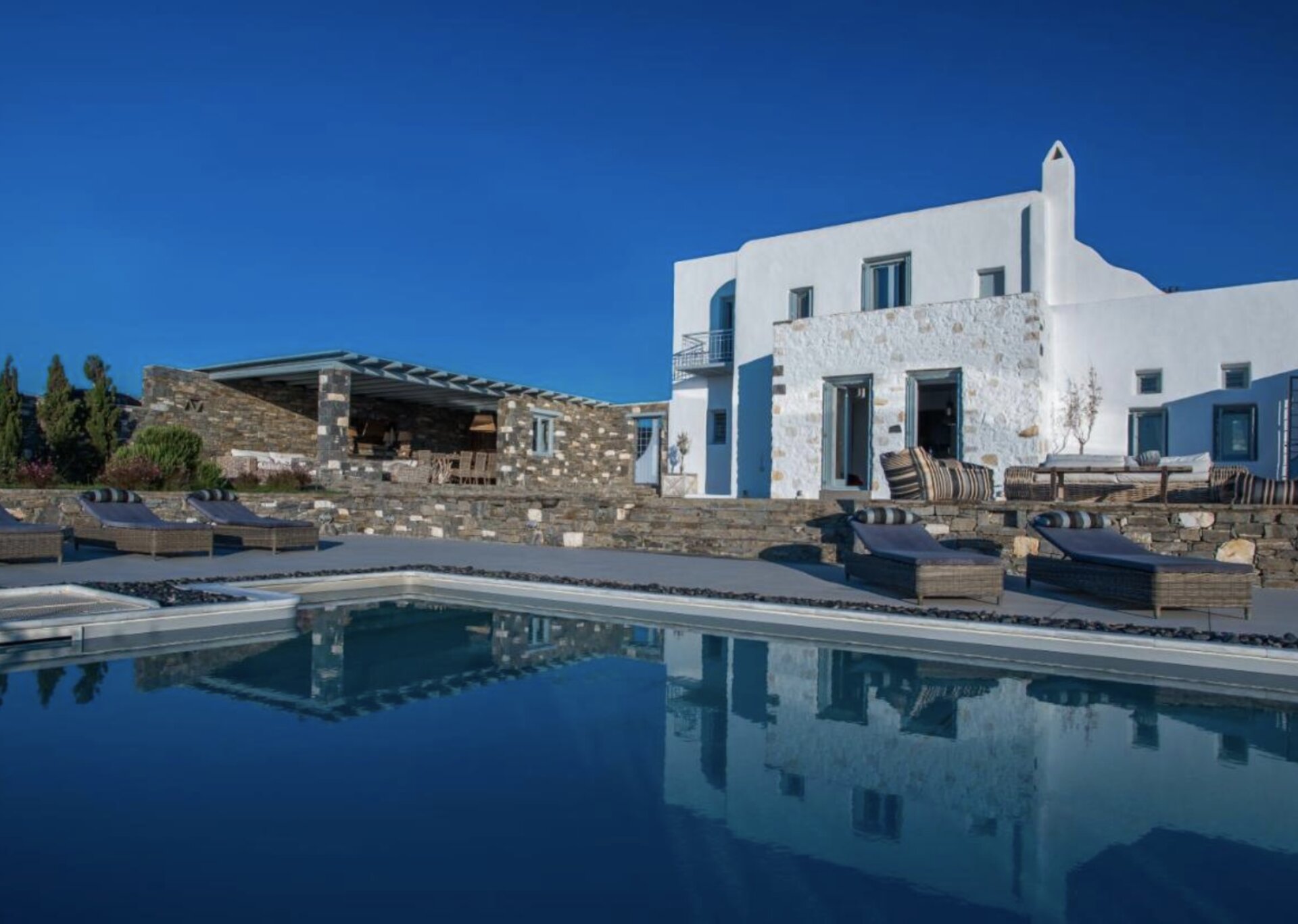 From its upper-level bedroom balconies, one can enjoy the breathtaking sunset views of the Aegean Sea. A ceramic-tiled patio, located at pool level, offers the ideal setting for al-fresco dining. Located in fashionable Golden Beach area, the villa offers quiet and relaxed surroundings.