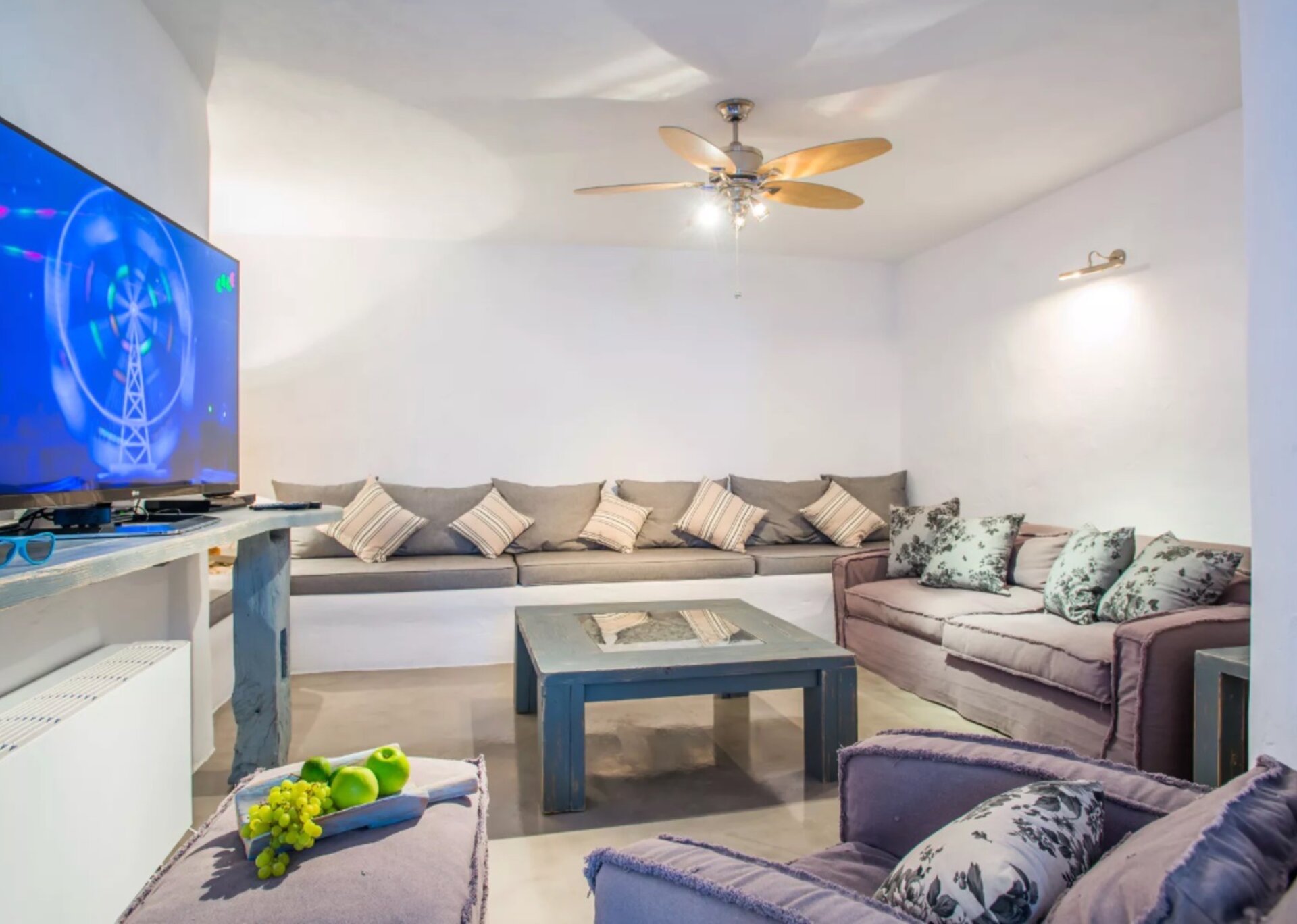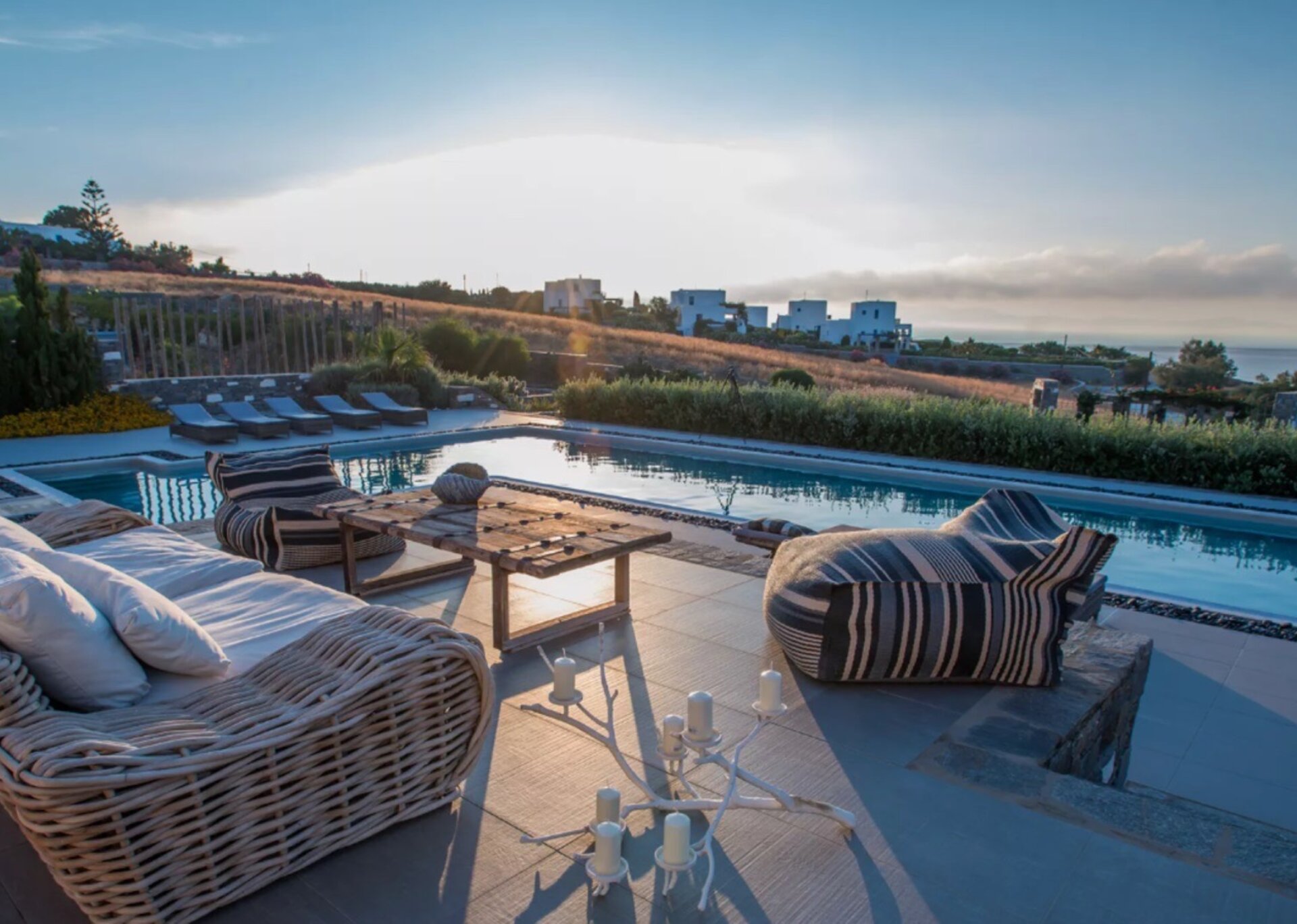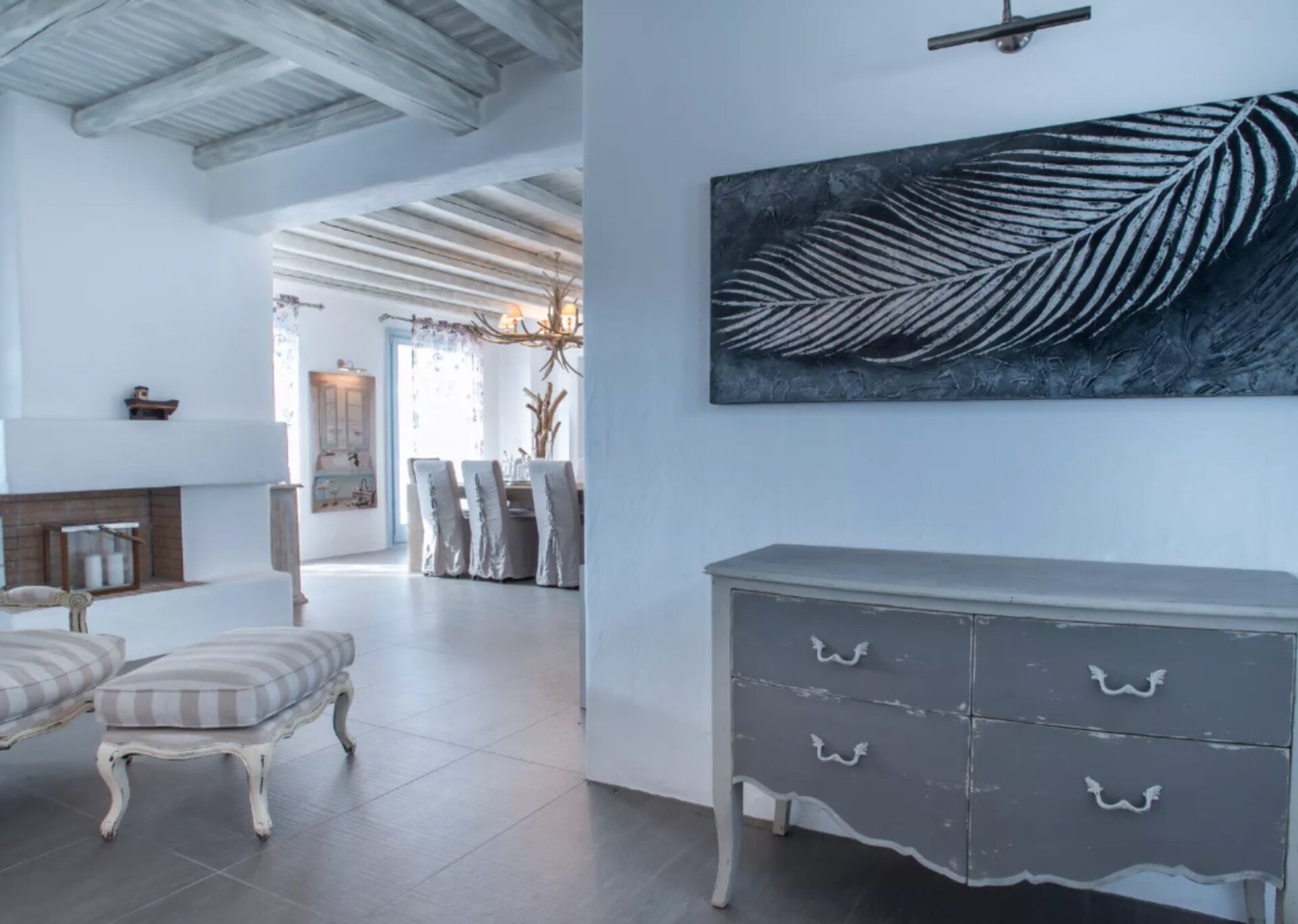From its upper-level bedroom balconies, one can enjoy the breathtaking sunset views of the Aegean Sea. A ceramic-tiled patio, located at pool level, offers the ideal setting for al-fresco dining. Located in fashionable Golden Beach area, the villa offers quiet and relaxed surroundings.