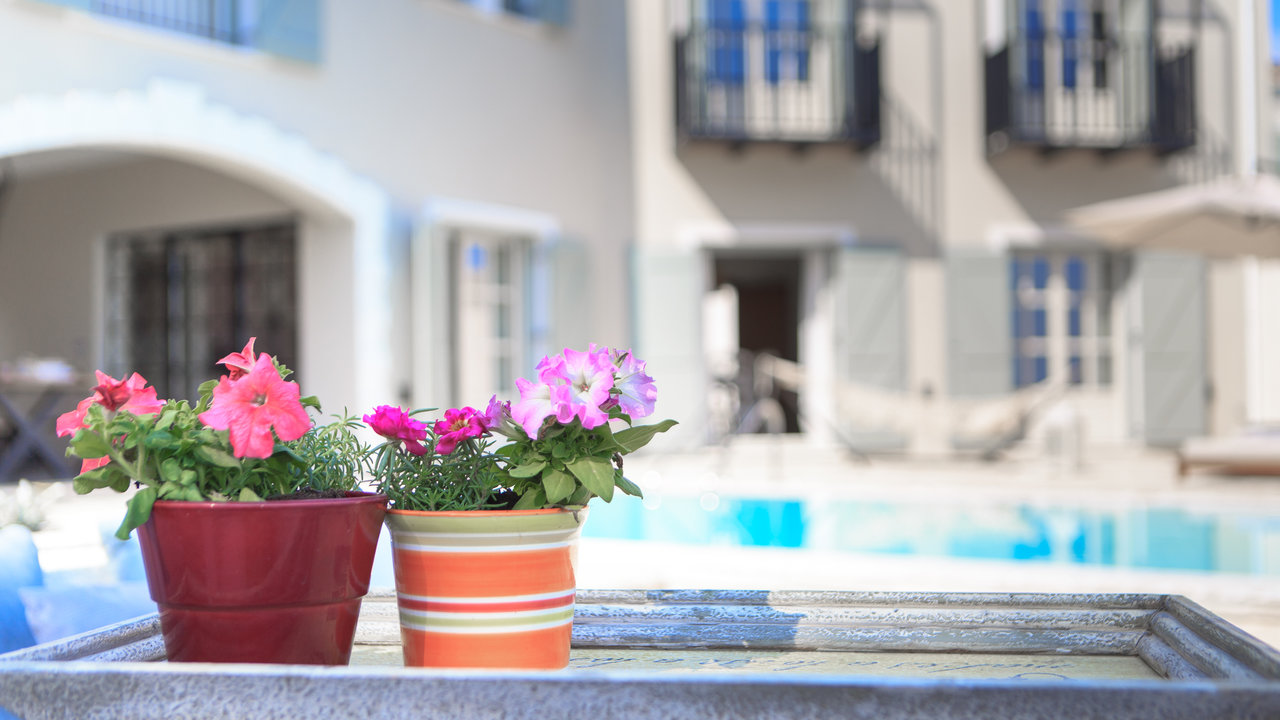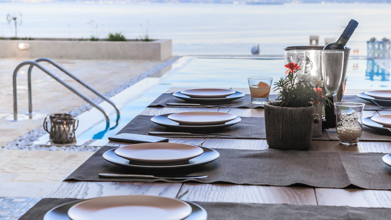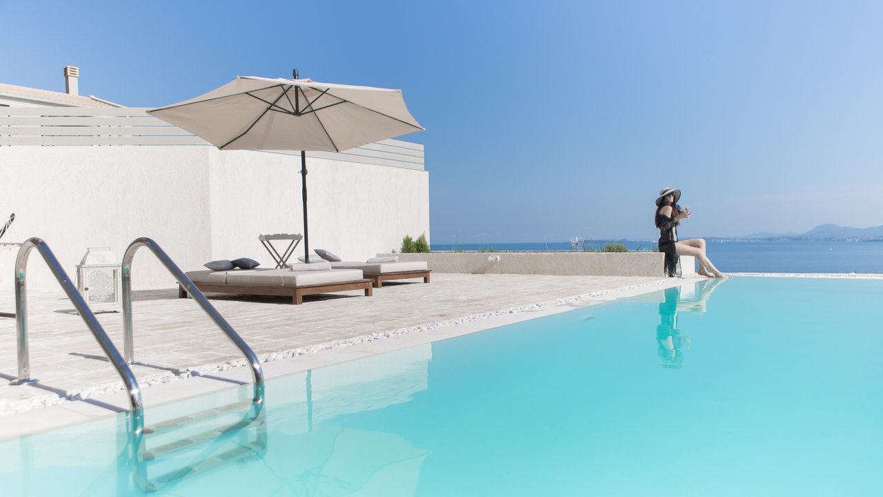 Around the pool area, you can relax on the comfortable sunbeds, have a drink in the sitting area overlooking the sea or have a meal in the covered dining area which is equipped with a traditional wood-fire BBQ.