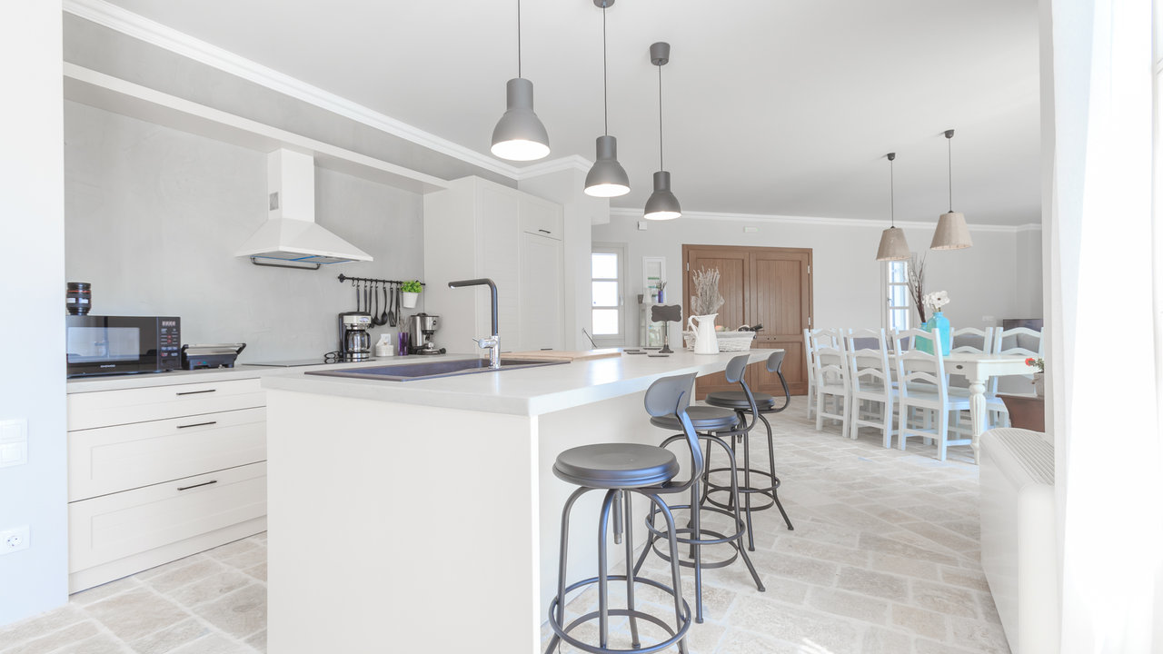 On the ground floor guests can enjoy a fully-fitted kitchen with modern appliances, a large living room and dining area which flow out to the pool area.