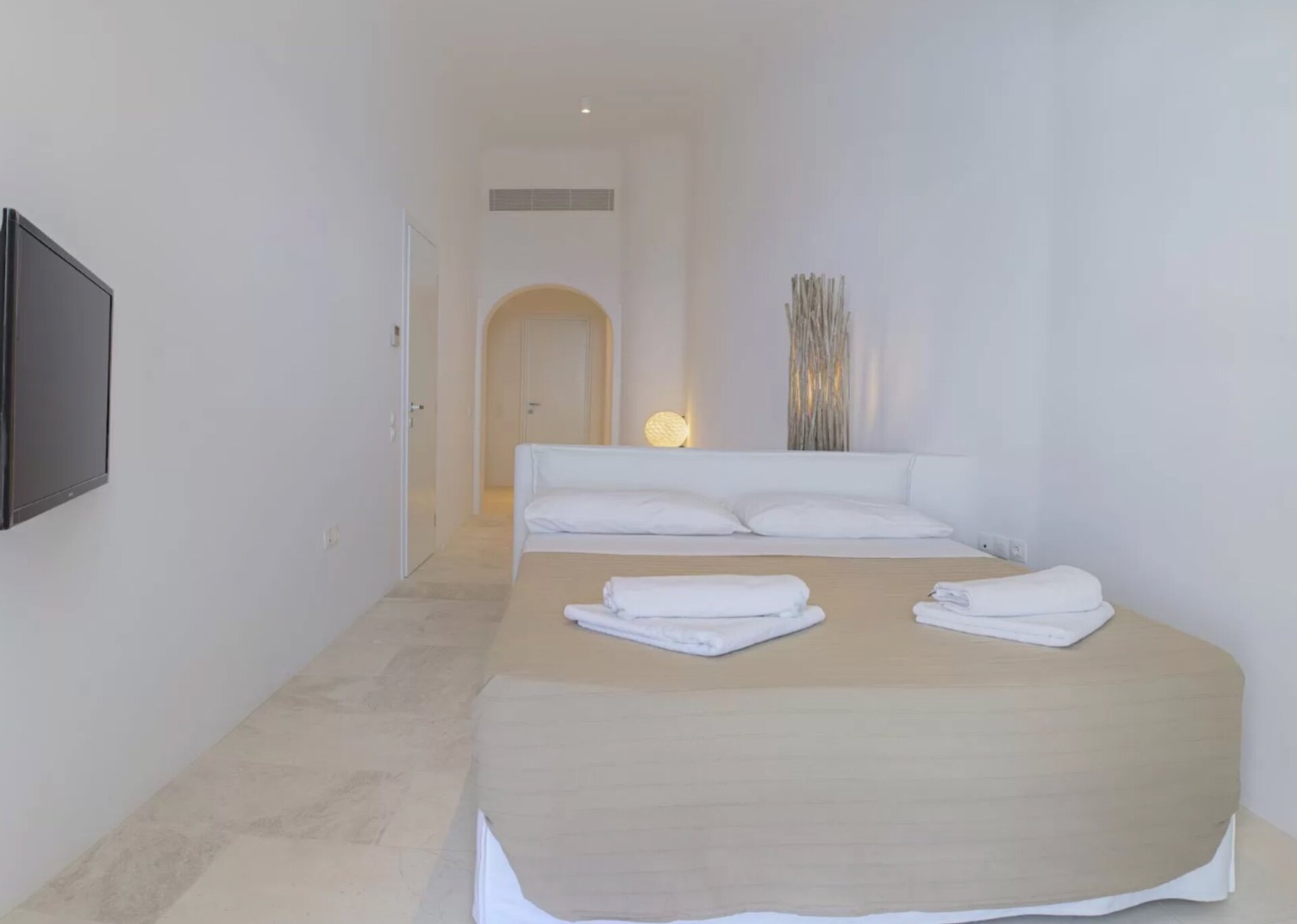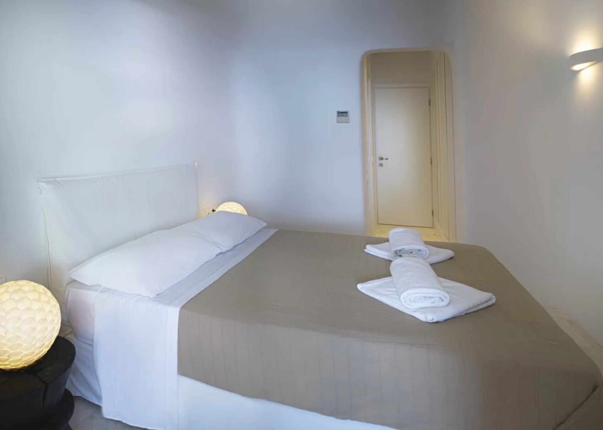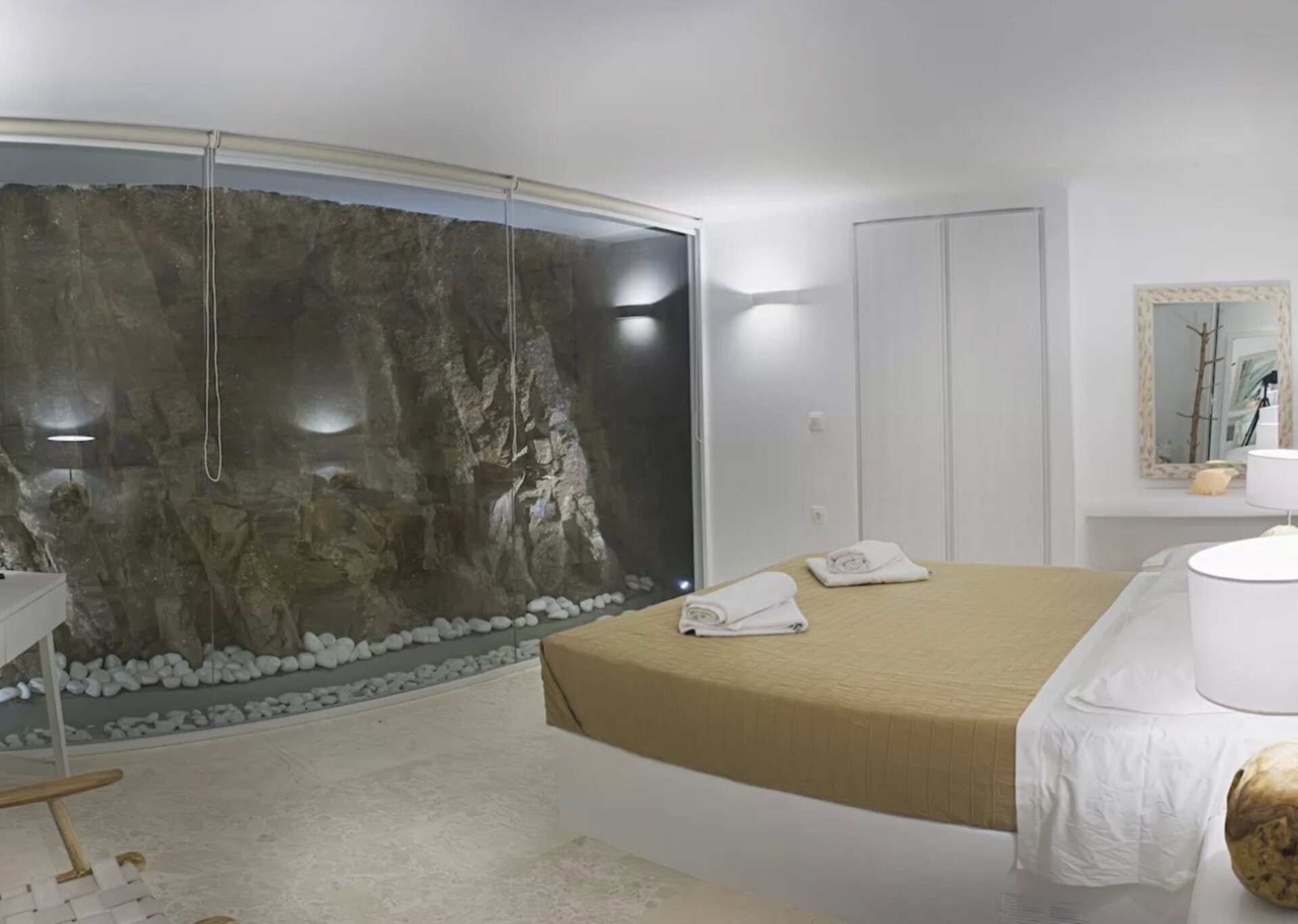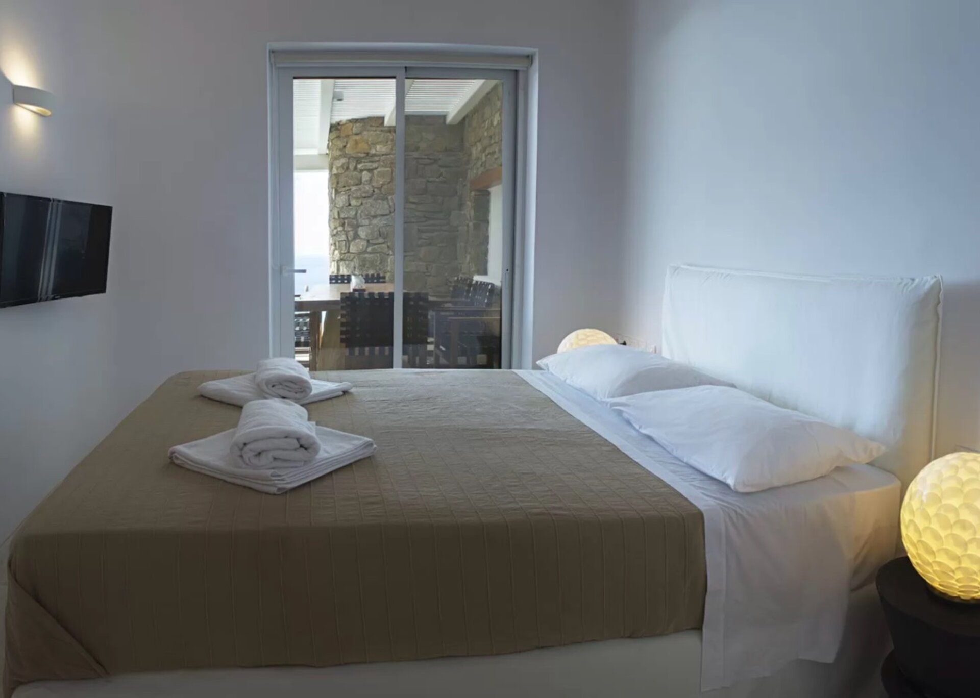 Additionally, the villa features a cozy double bed guest house, which is located at the lower level of the complex. The guest house is designed to connect seamlessly with the villa's outdoor space through a traditional stone staircase, offering guests the perfect escape to enjoy the Mykonos atmosphere in privacy and comfort.