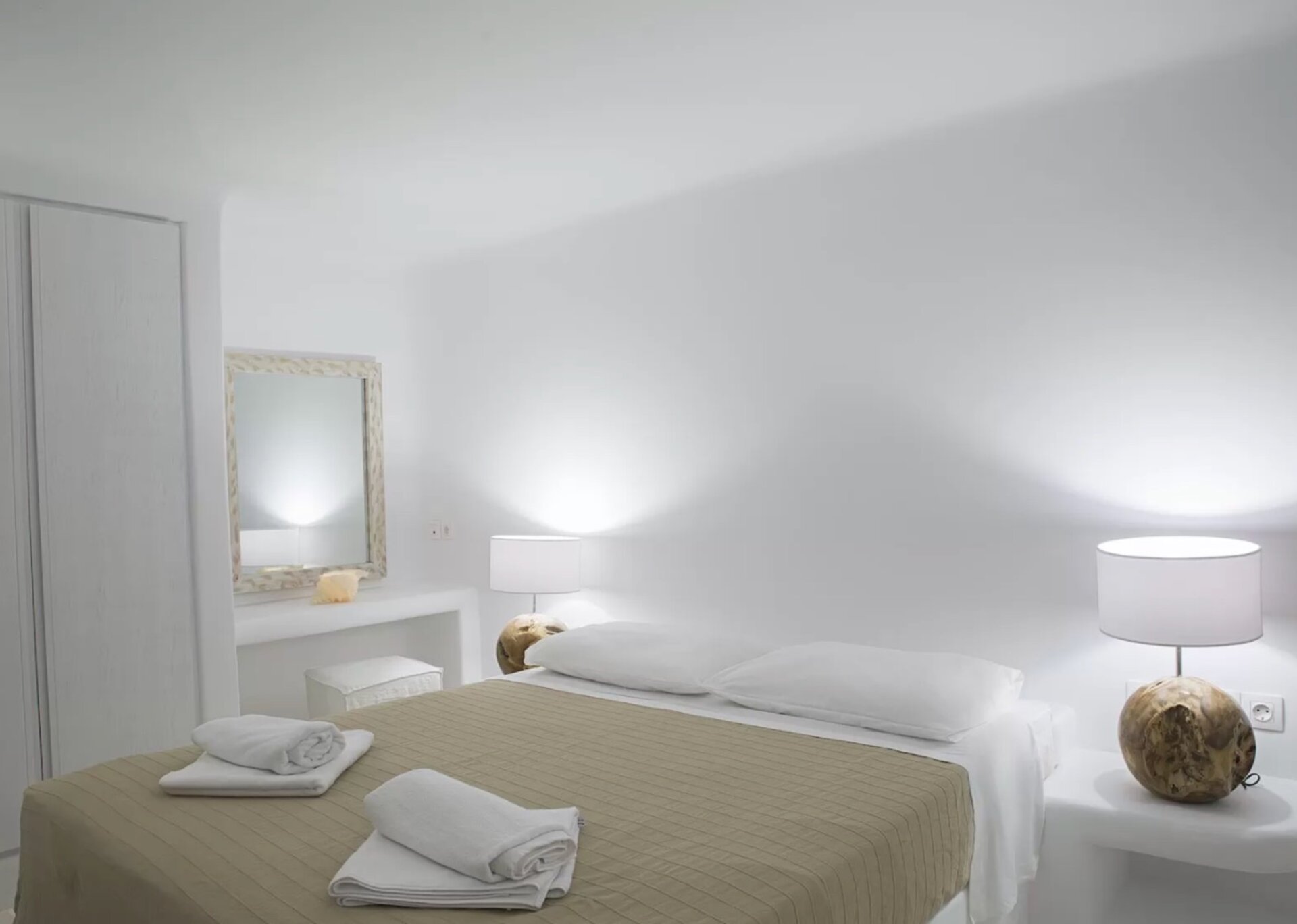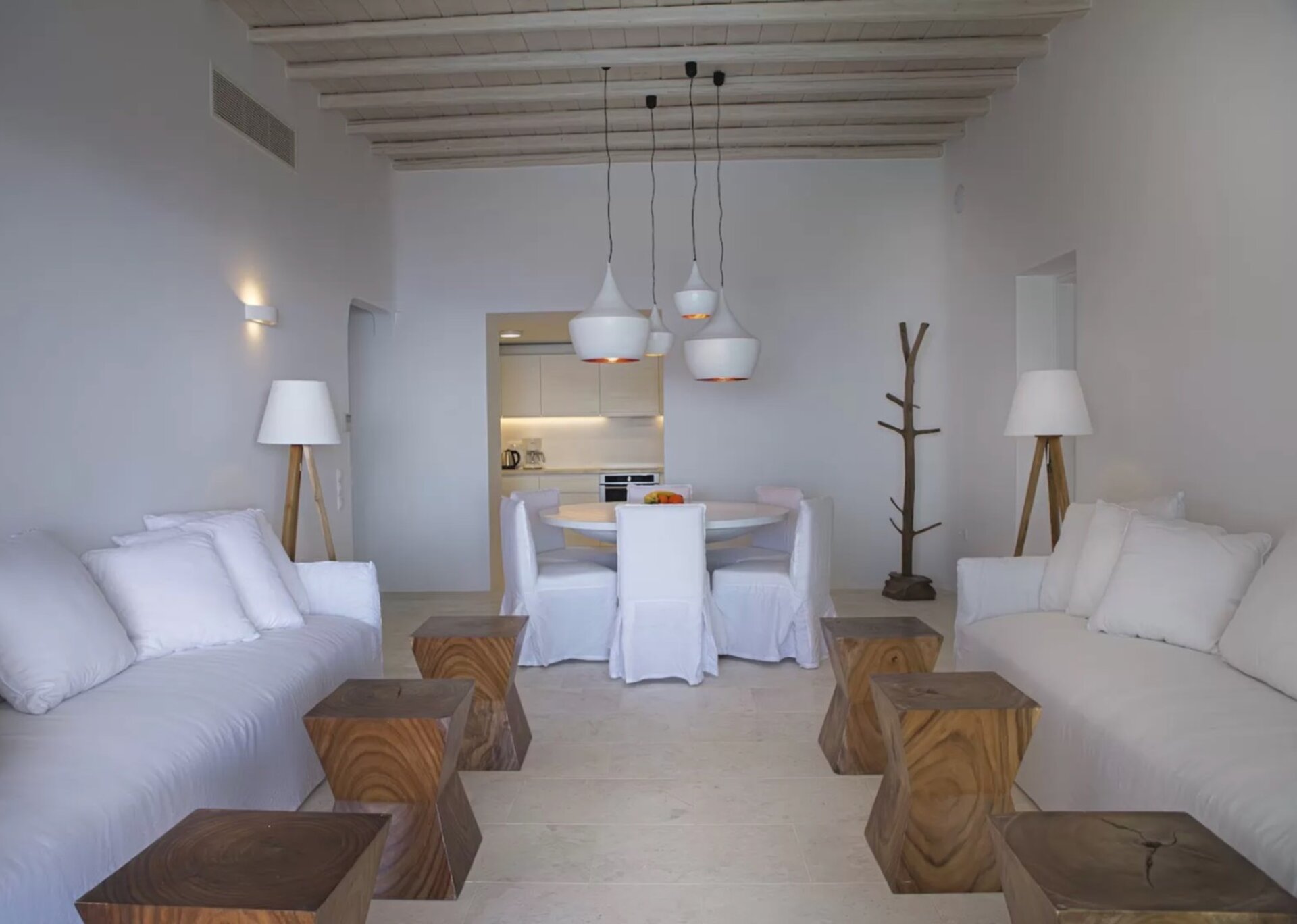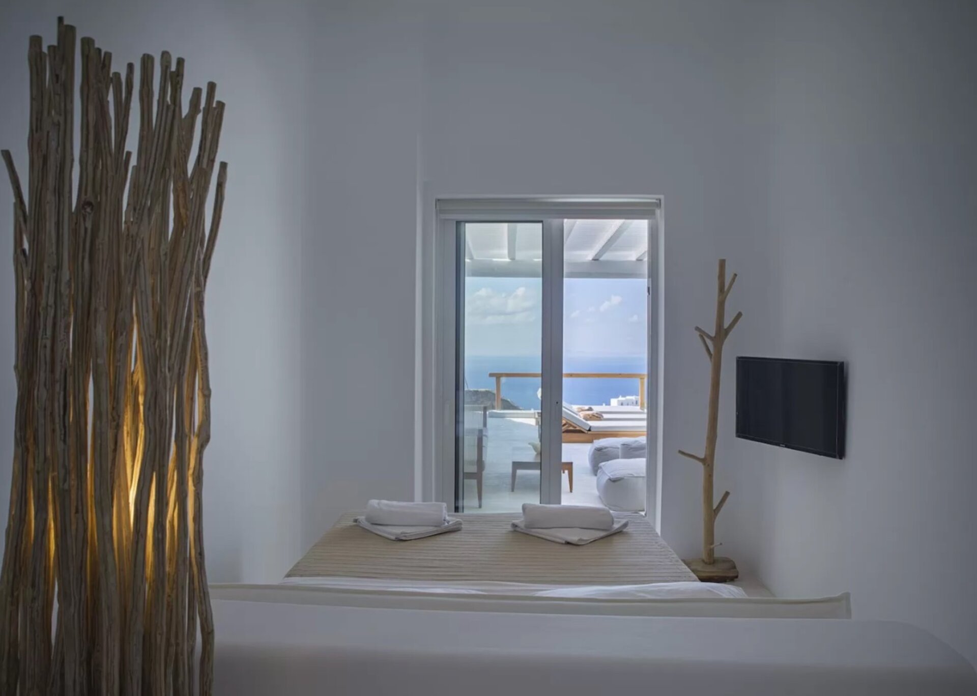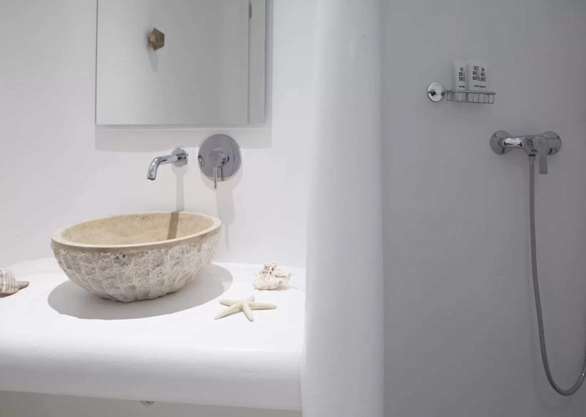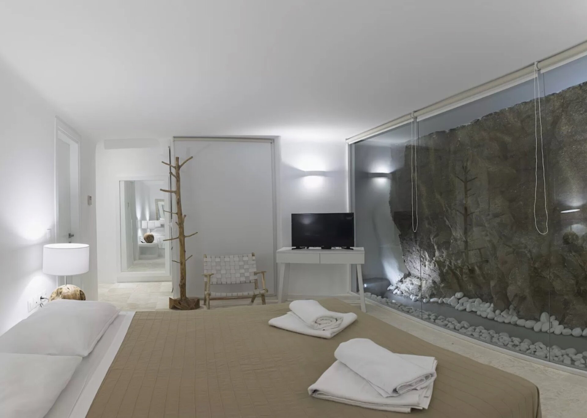 Additionally, the villa features a cozy double bed guest house, which is located at the lower level of the complex. The guest house is designed to connect seamlessly with the villa's outdoor space through a traditional stone staircase, offering guests the perfect escape to enjoy the Mykonos atmosphere in privacy and comfort.