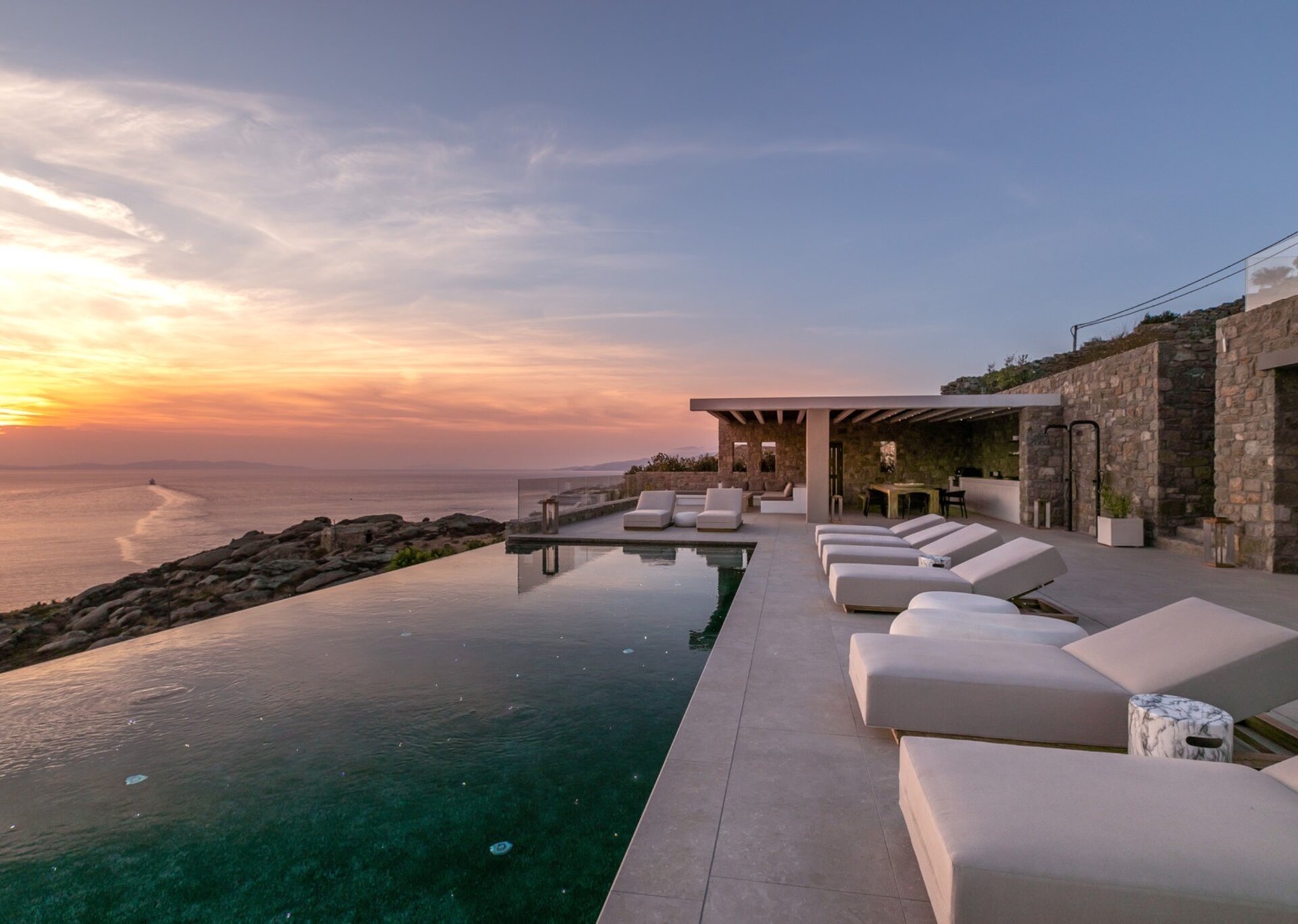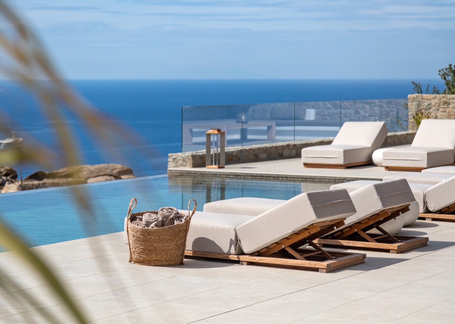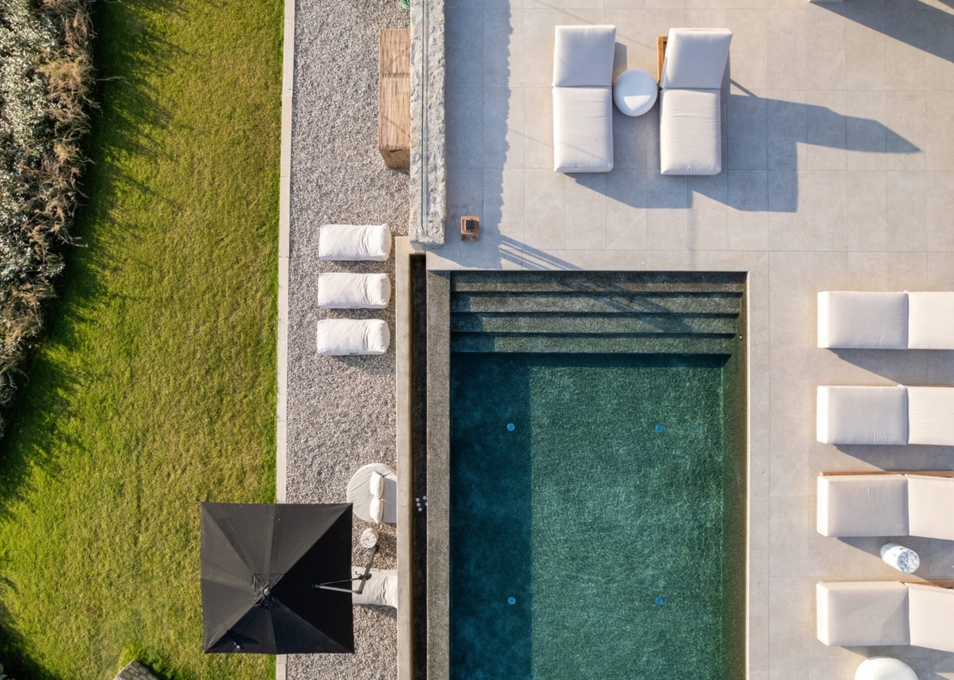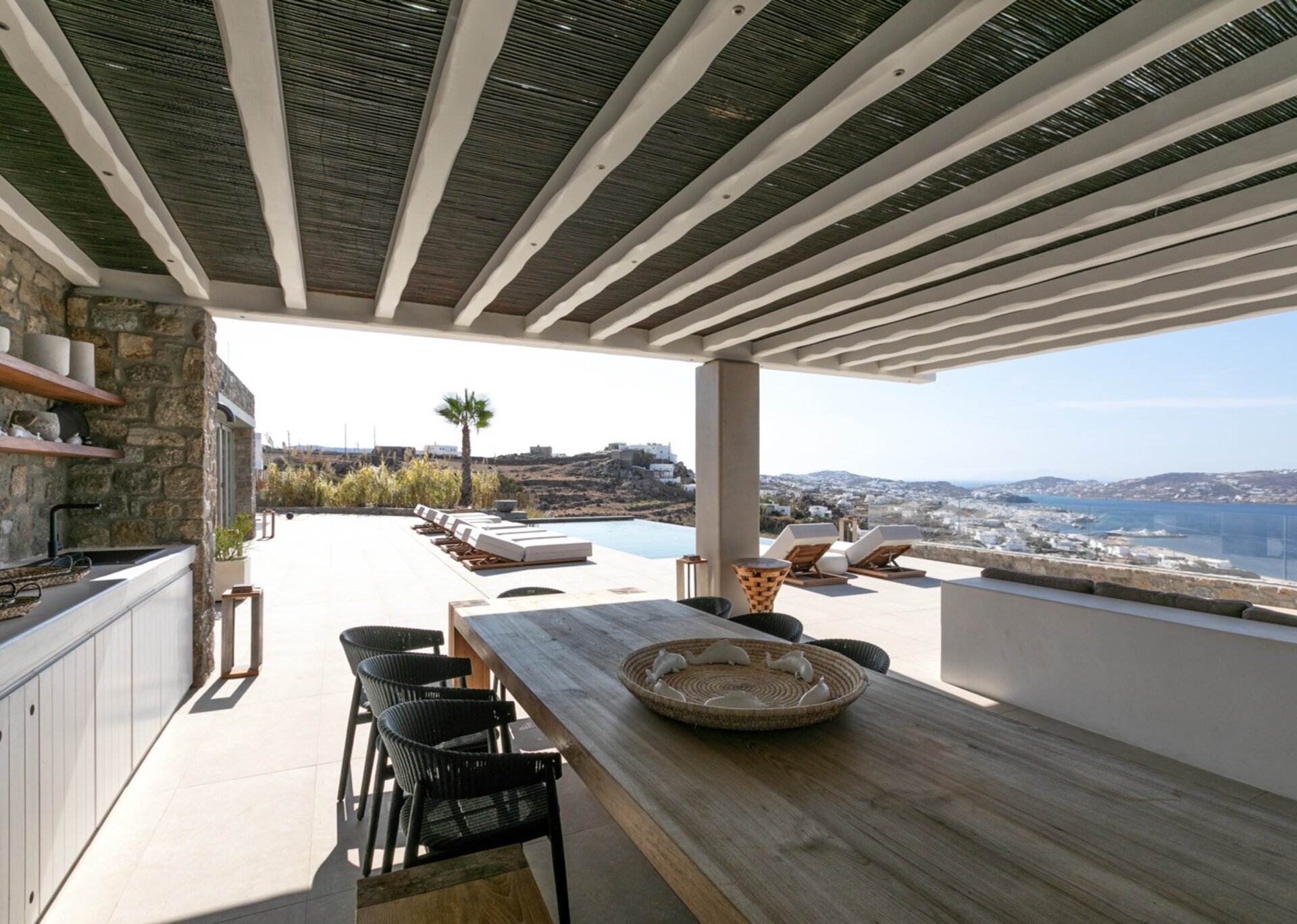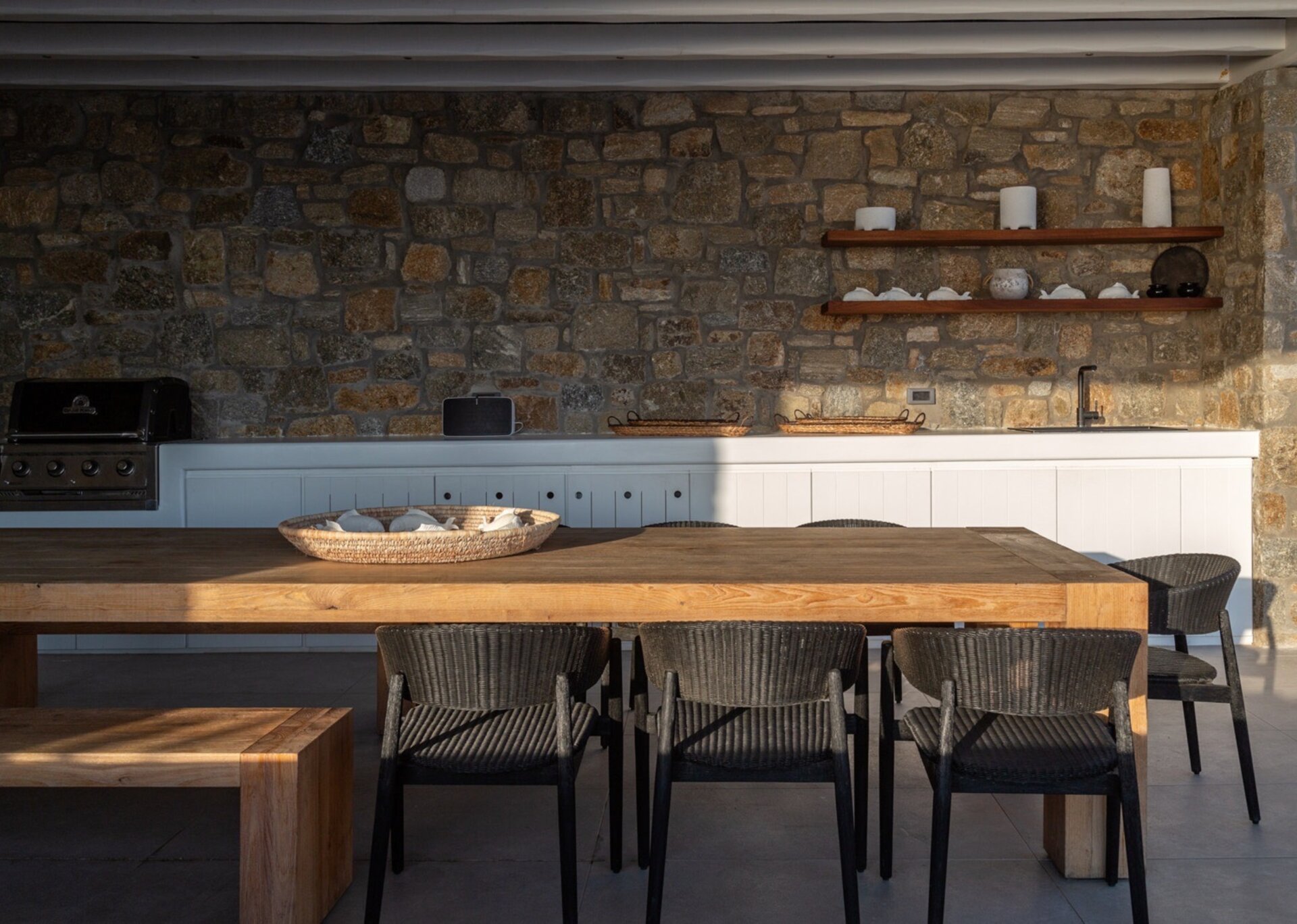 Outside the house, there is a large swimmimng pool surrounded by sunbeds to relax and enjoy a glass of wine while sunbathing. Near the swimming pool there is a dining spot and an outer BBQ area for family gatherings and joyful moments. The exterior of Ambrette offers unobstructed panoramic views of the Aegean sea.