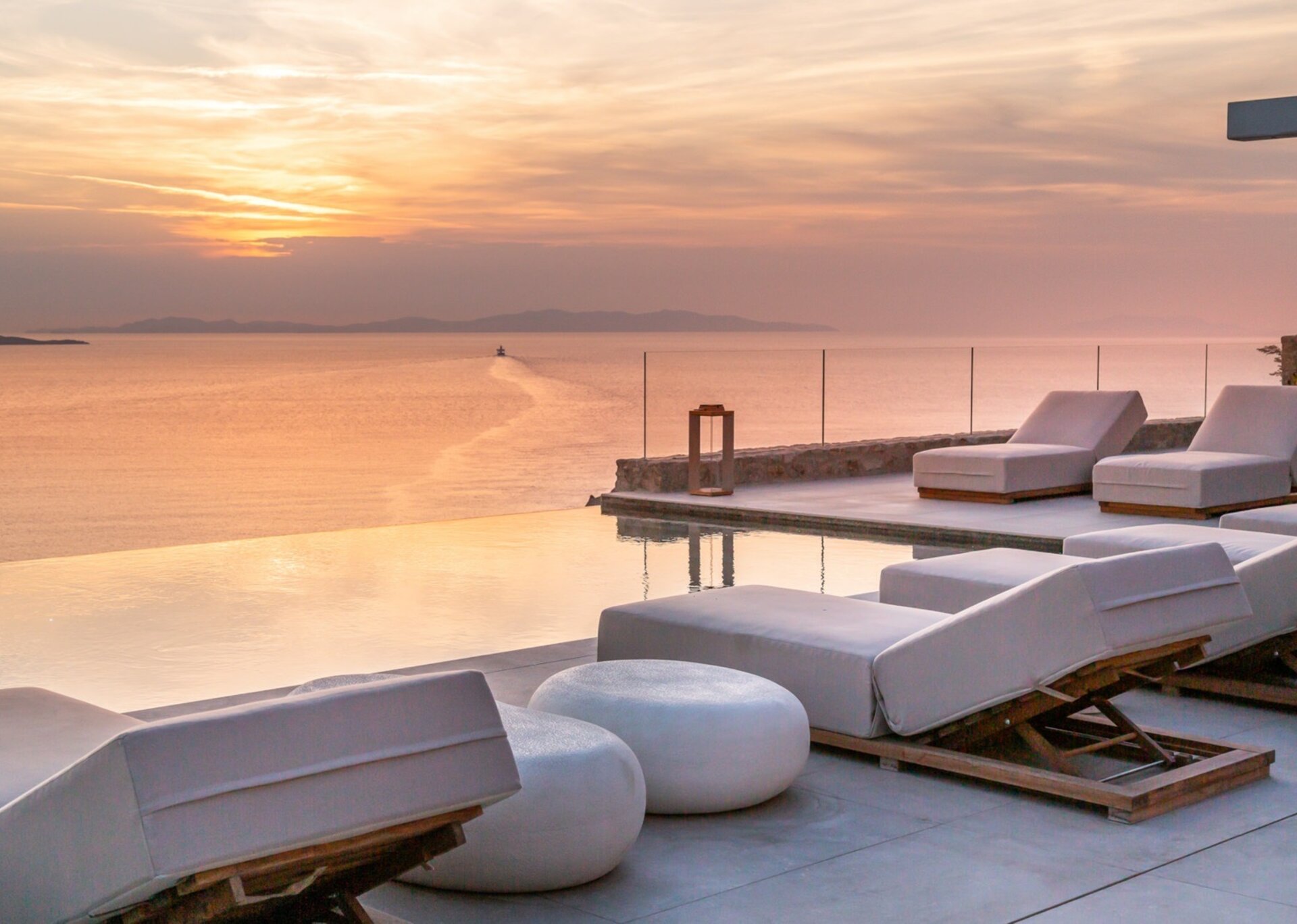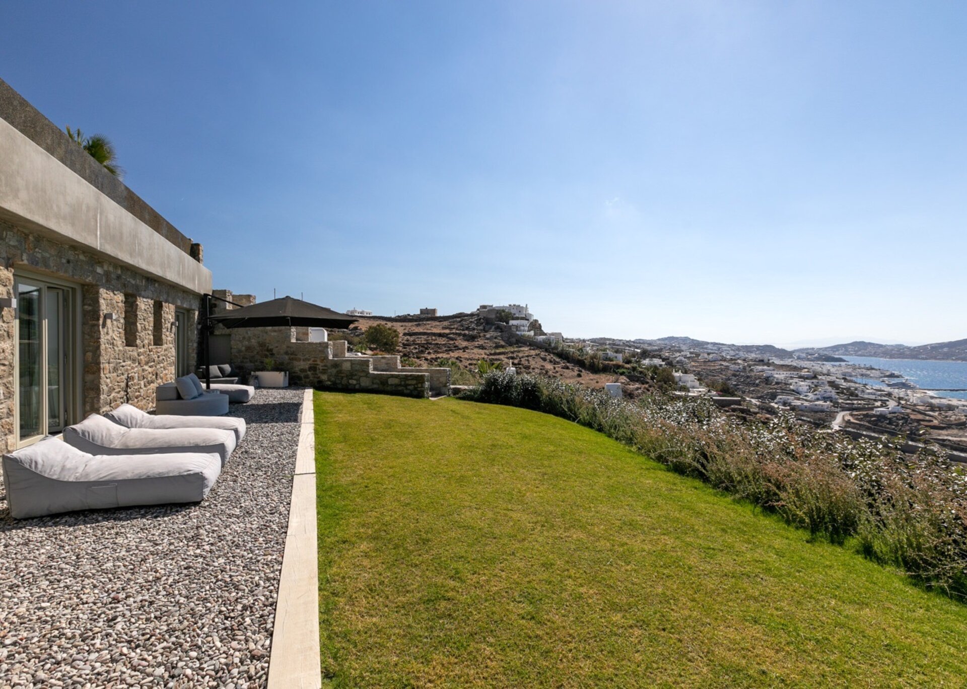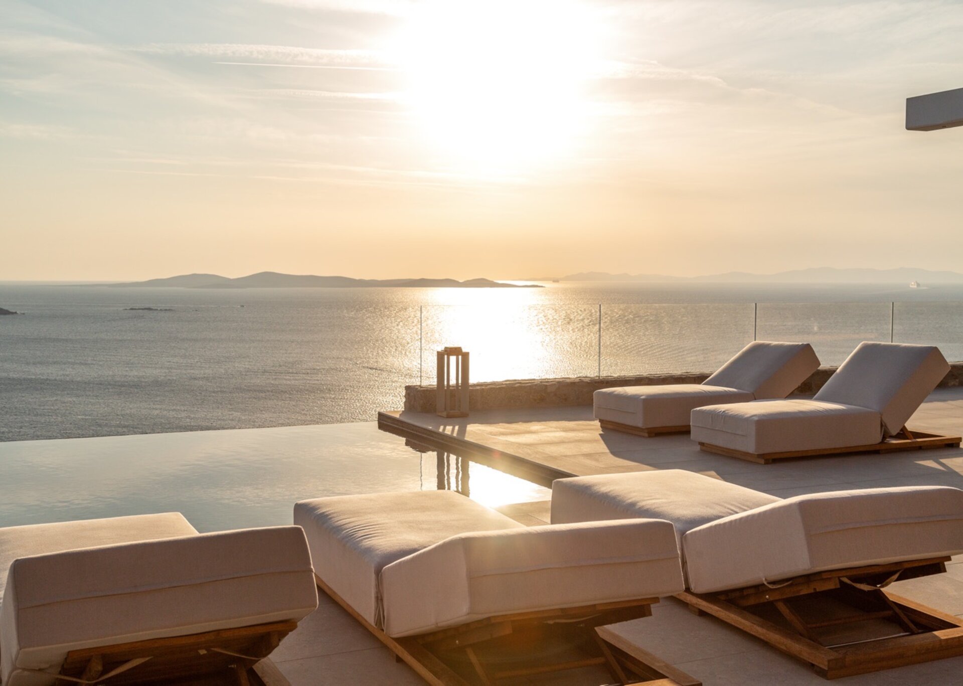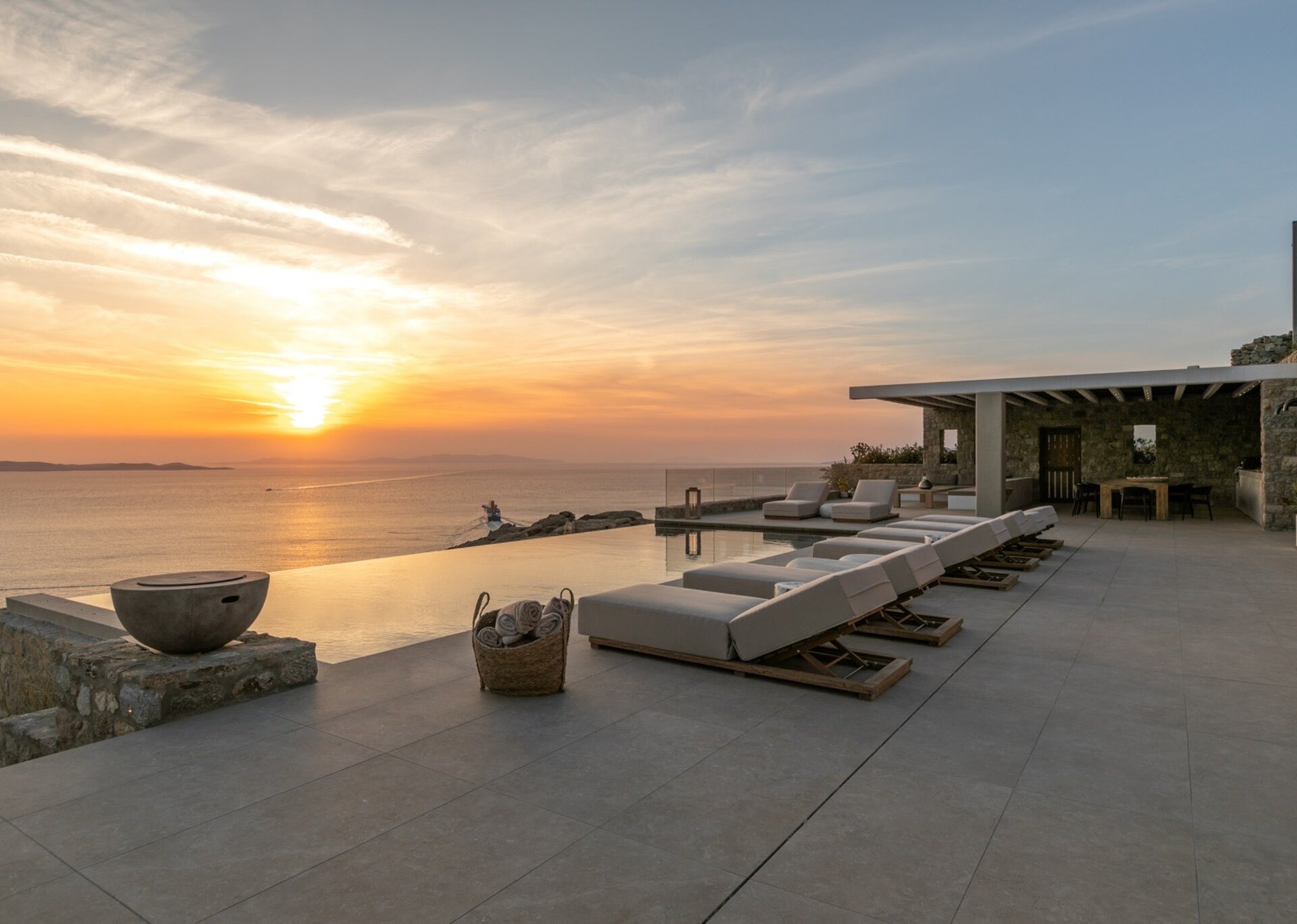 Outside the house, there is a large swimmimng pool surrounded by sunbeds to relax and enjoy a glass of wine while sunbathing. Near the swimming pool there is a dining spot and an outer BBQ area for family gatherings and joyful moments. The exterior of Ambrette offers unobstructed panoramic views of the Aegean sea.