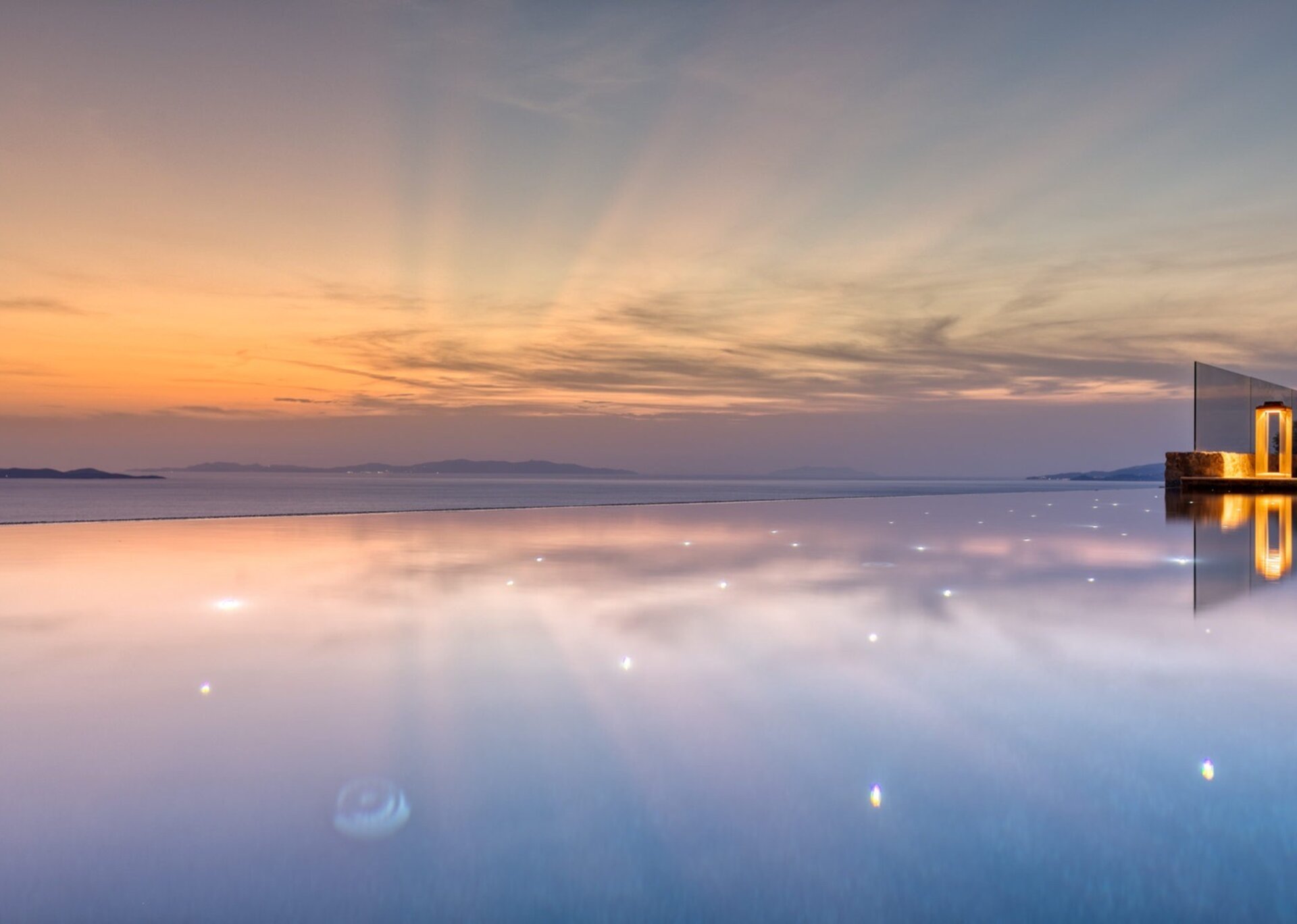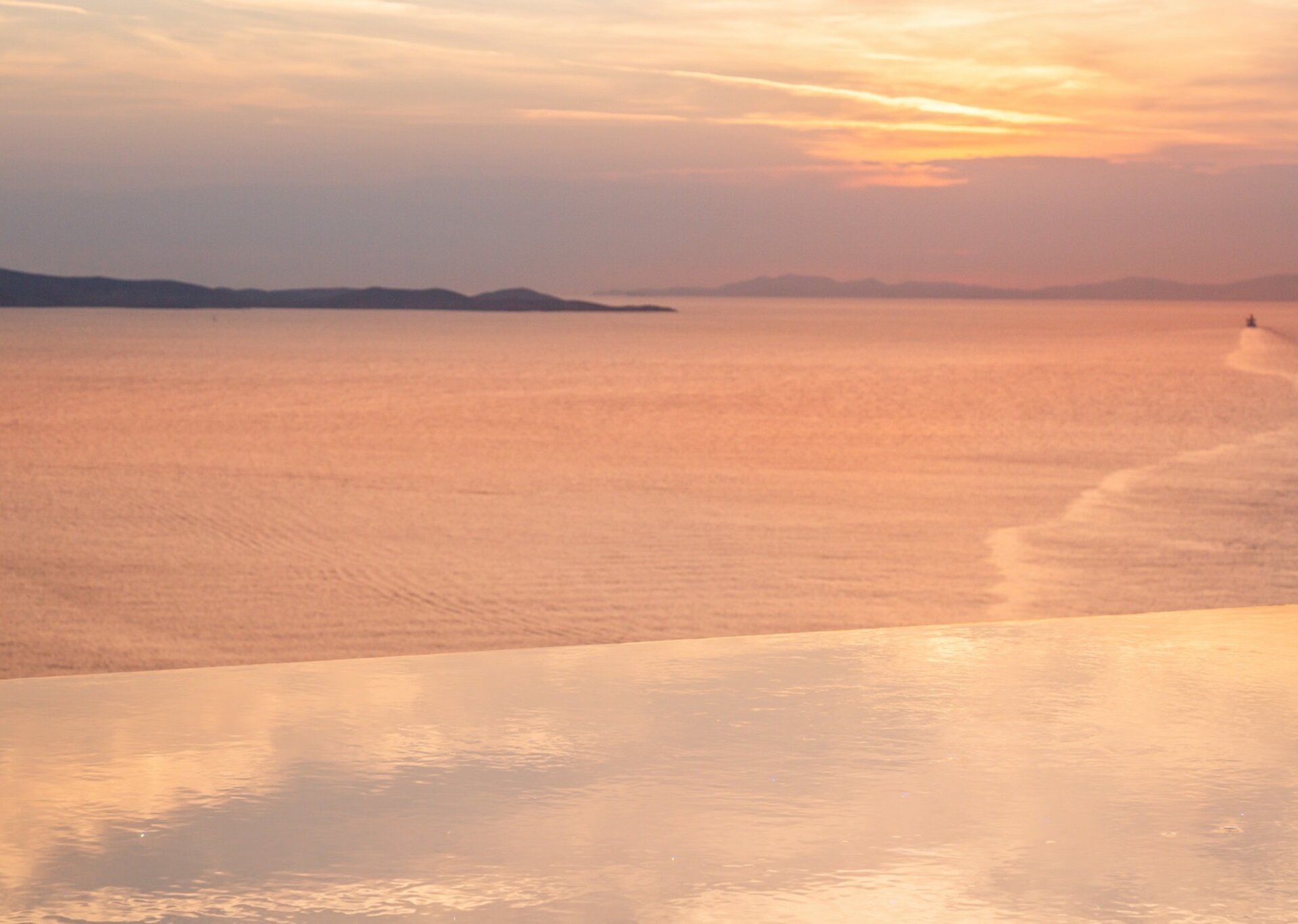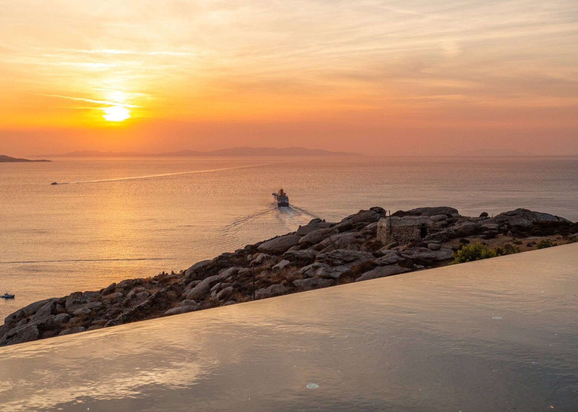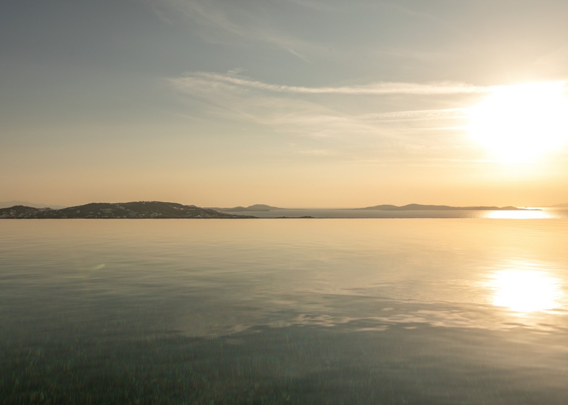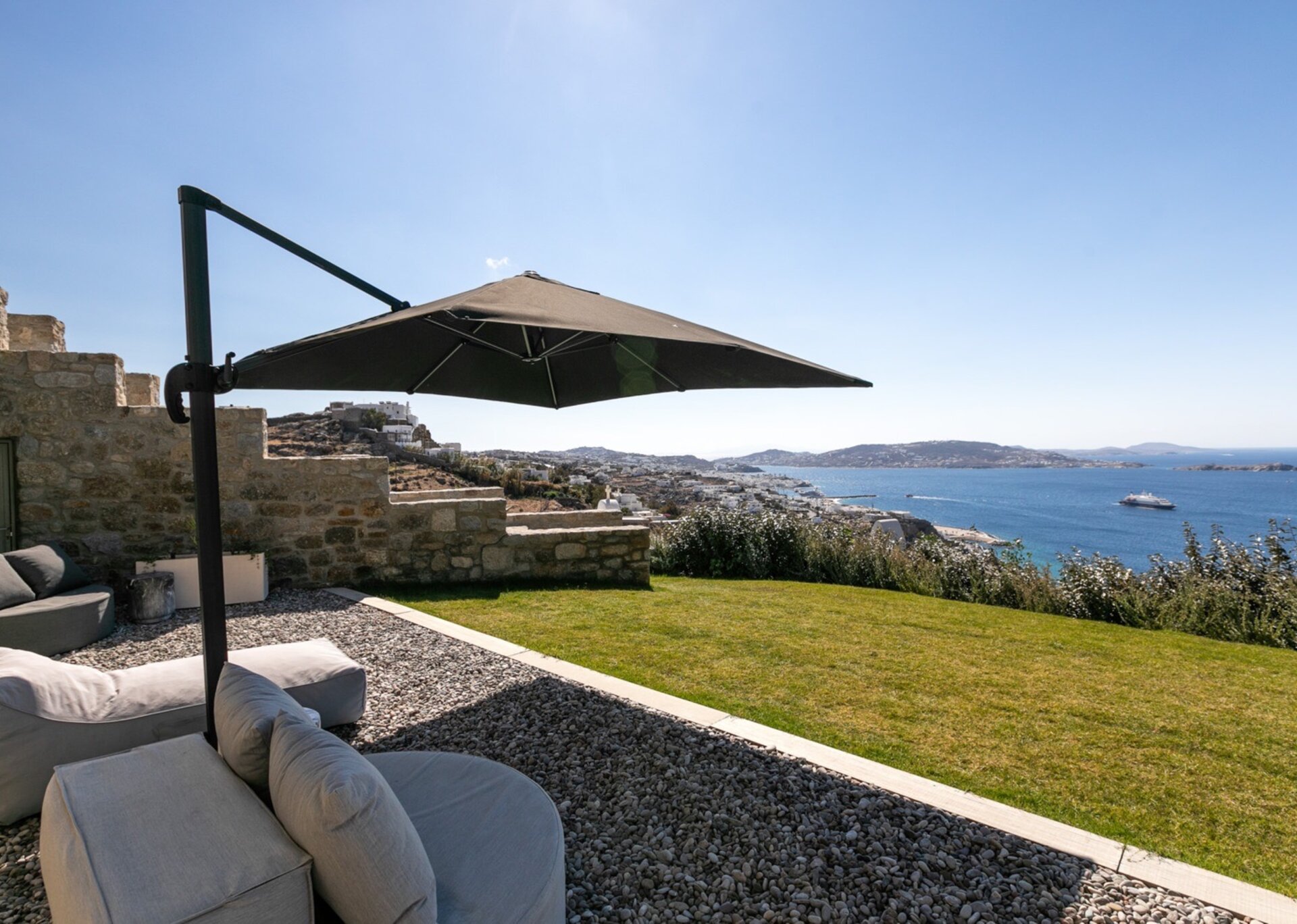 Outside the house, there is a large swimmimng pool surrounded by sunbeds to relax and enjoy a glass of wine while sunbathing. Near the swimming pool there is a dining spot and an outer BBQ area for family gatherings and joyful moments. The exterior of Ambrette offers unobstructed panoramic views of the Aegean sea.