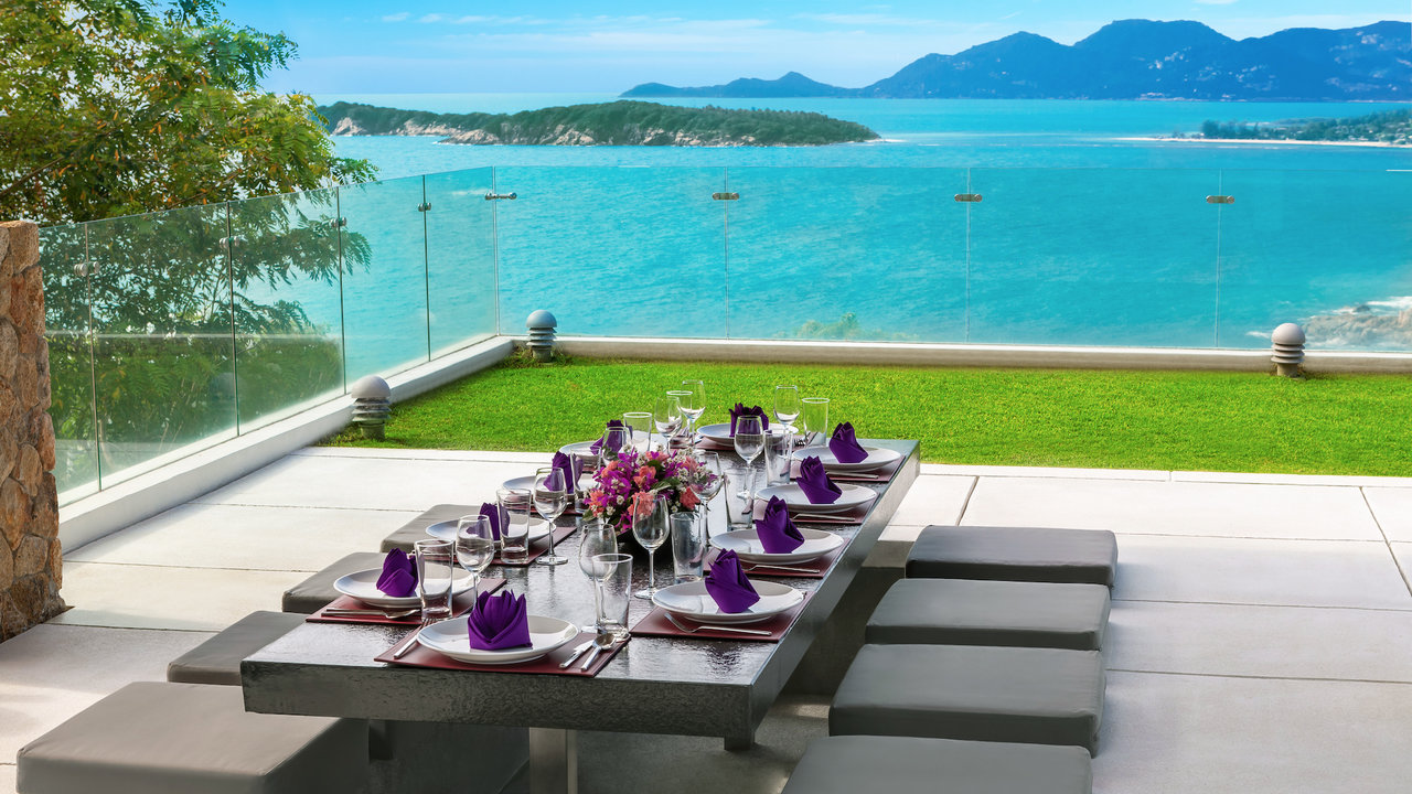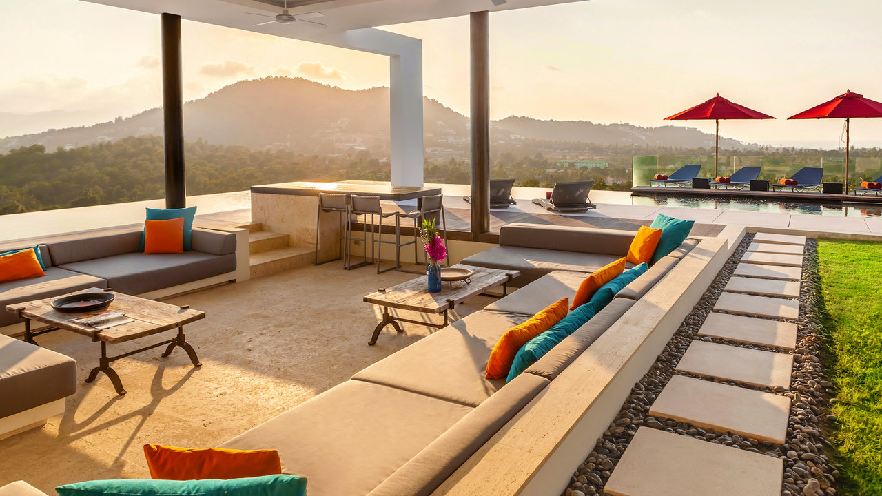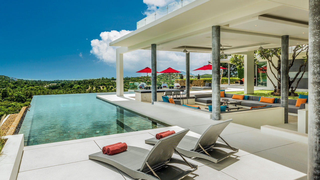 Villa Amelia is a spacious, luxury 4-bedroom villa in Koh Samui, one of Thailand’s most picturesque islands. It can comfortably accommodate up to eight guests and is the perfect choice for a fun-filled family vacation or a romantic getaway. Each of the Villa’s four sophisticated suites is tastefully decorated in a clean, contemporary style and are furnished with king sized beds, high-quality linen, a flat screen television and ceiling fans.The suites’ sleek, modern bathrooms also feature deep soaking tubs, separate showers and his and her vanities. Each suite also backs onto a wrap around terrace which offers phenomenal sea and pool views.