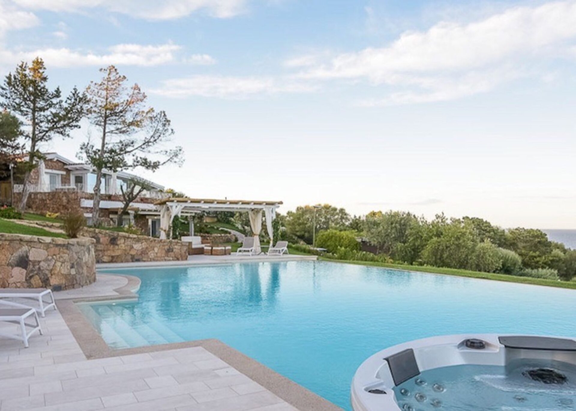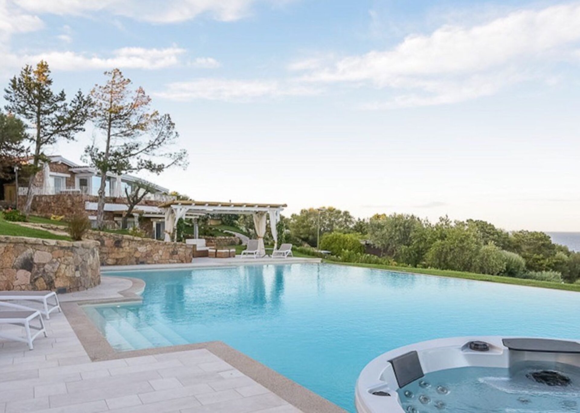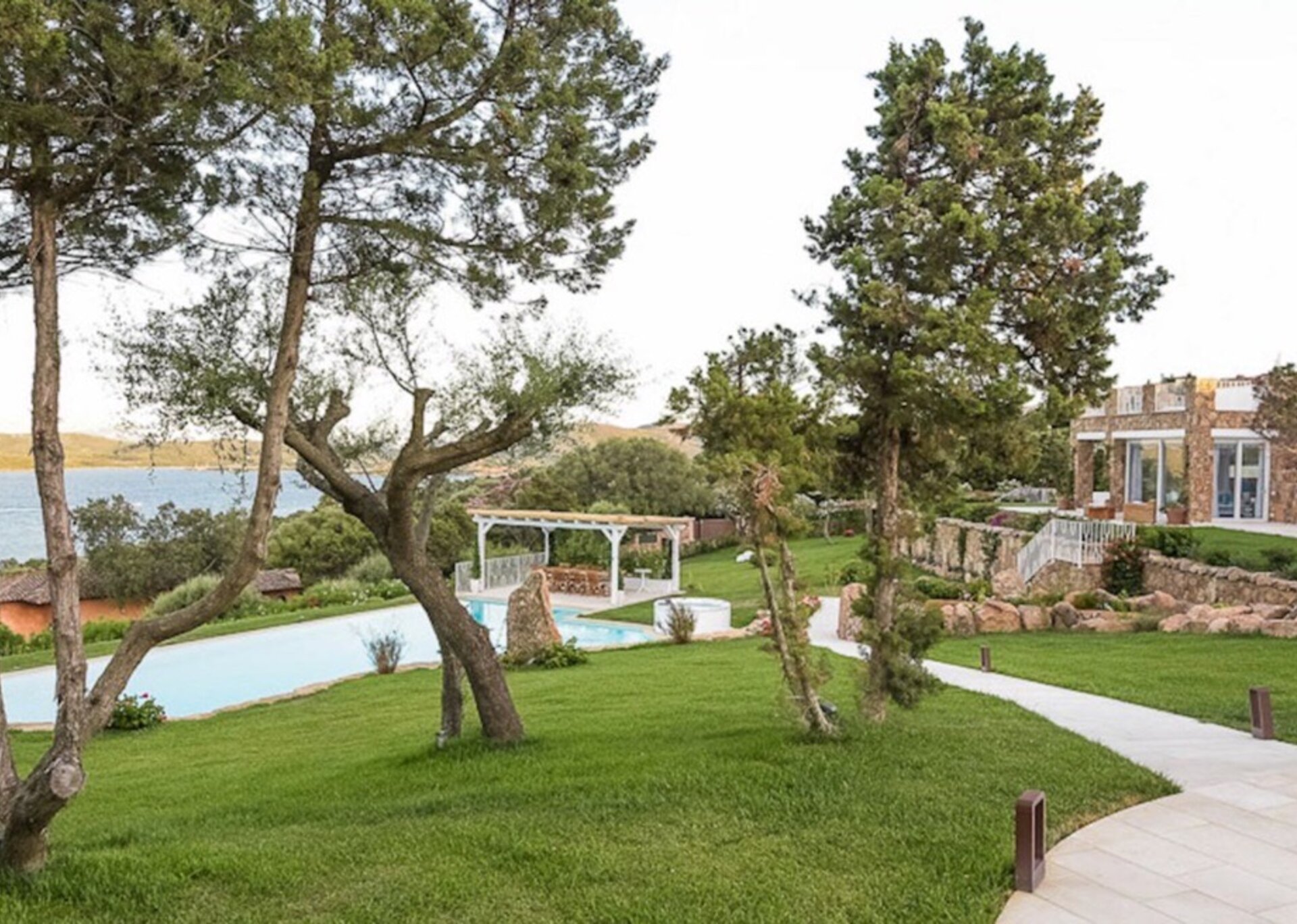Villa Anna is located in the exclusive resort of Punta Lada in Porto Rotondo, about 250 meters from the sea. The complex enjoys an elevated position that allows you to admire the beautiful view of the entire gulf promontory, and to mitigate the hot Sardinian summers thanks to the gentle breeze due to the height. The property lays on an area of about 6,000 sqm of beautifully planted park, which includes a large main villa, a secondary villa, an annexe, a swimming pool, two jacuzzis, terraces, patios and several relax areas. The renovation work only saw the use of high quality materials, with the aim of achieving a luxurious Mediterranean property. The project has deliberately privileged independence and privacy as a primary concept, which is easily reflected by the total autonomy enjoyed by not just every property body, but every single room.