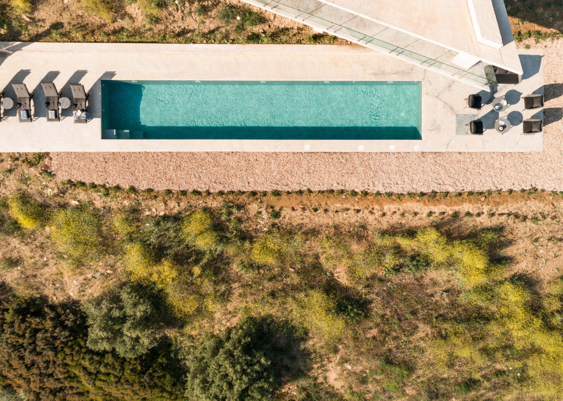 The villa's expansive 20x4 swimming pool offers a revitalizing oasis, complemented by an outdoor seating area for four, six sun loungers, and two umbrellas.