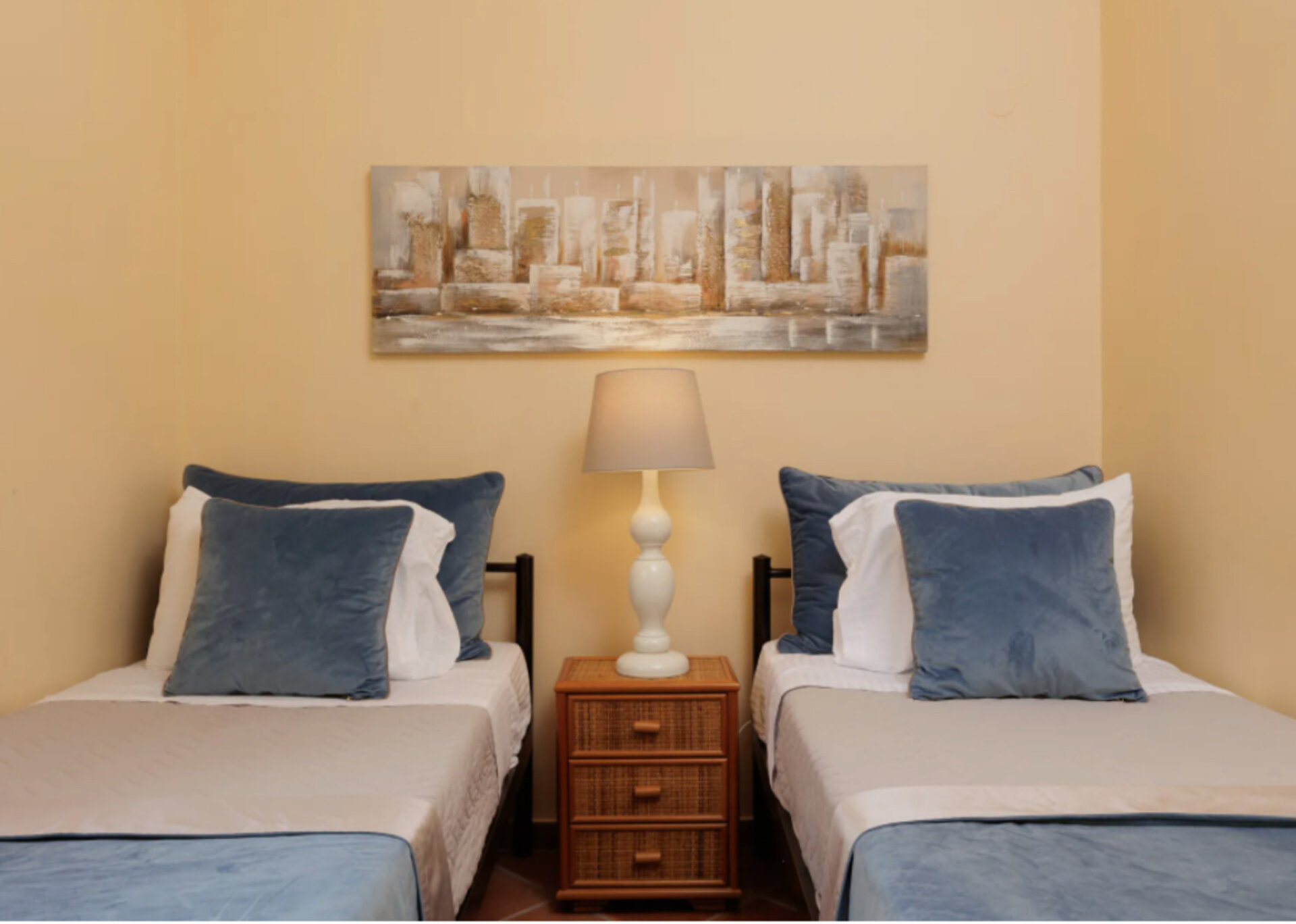 - 2 twin bedrooms (90cm x 200cm beds) with en suite bathrooms with shared large balcony