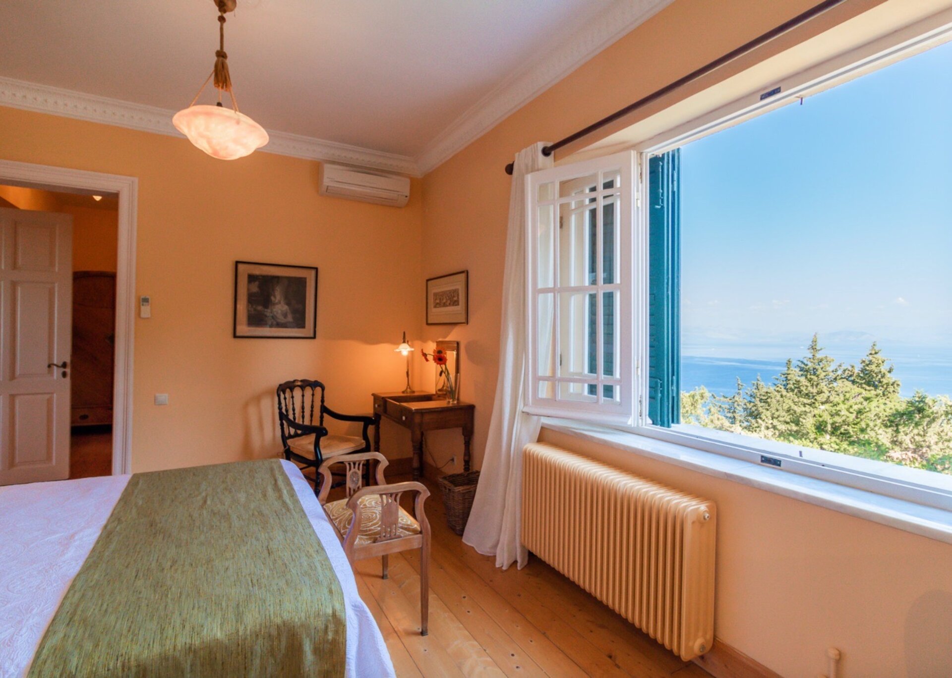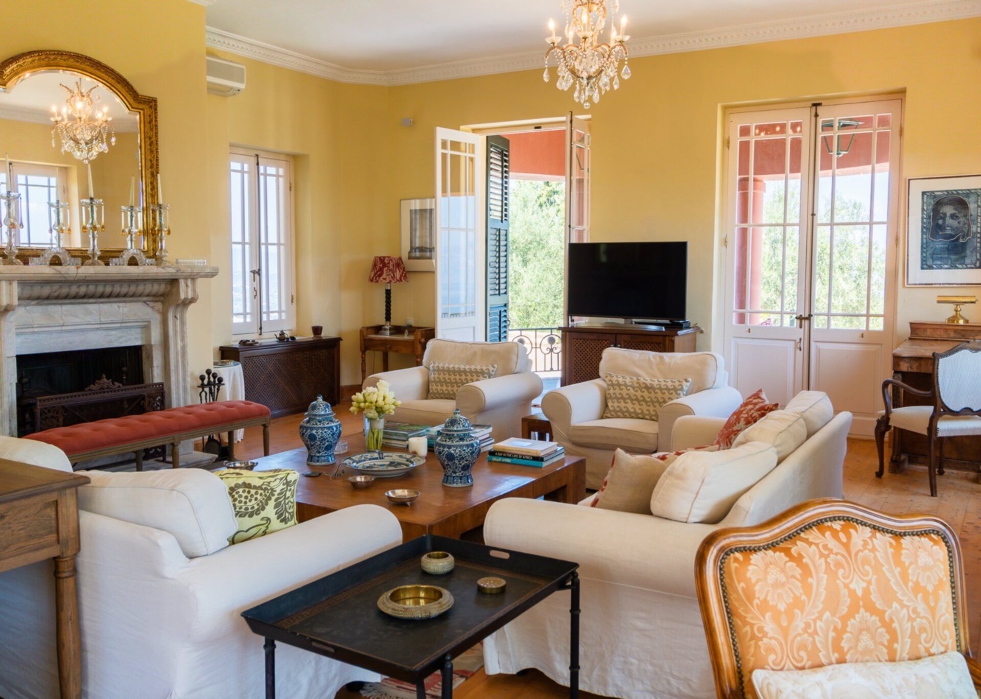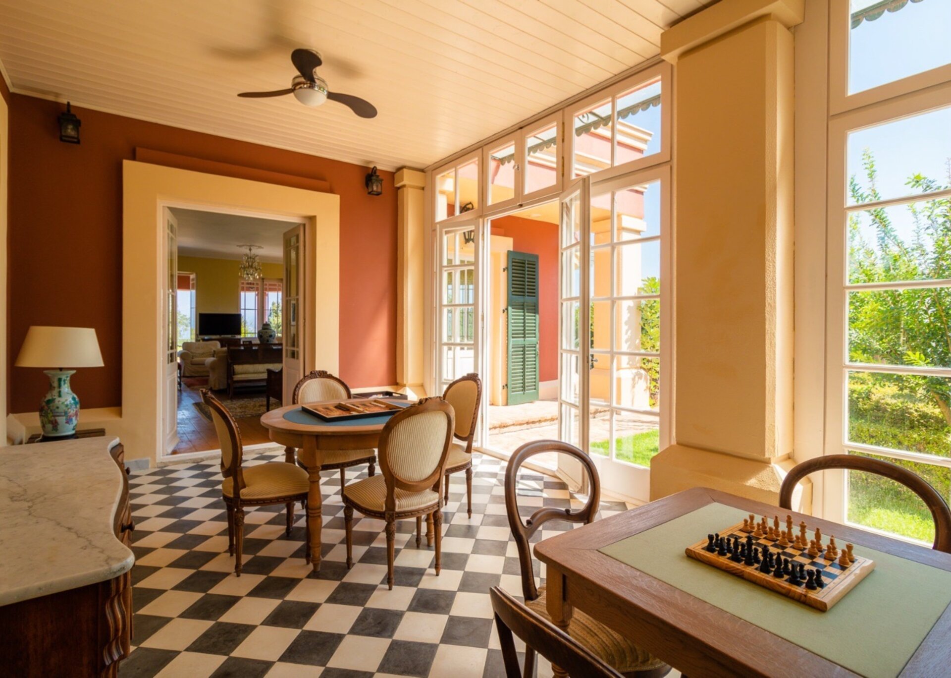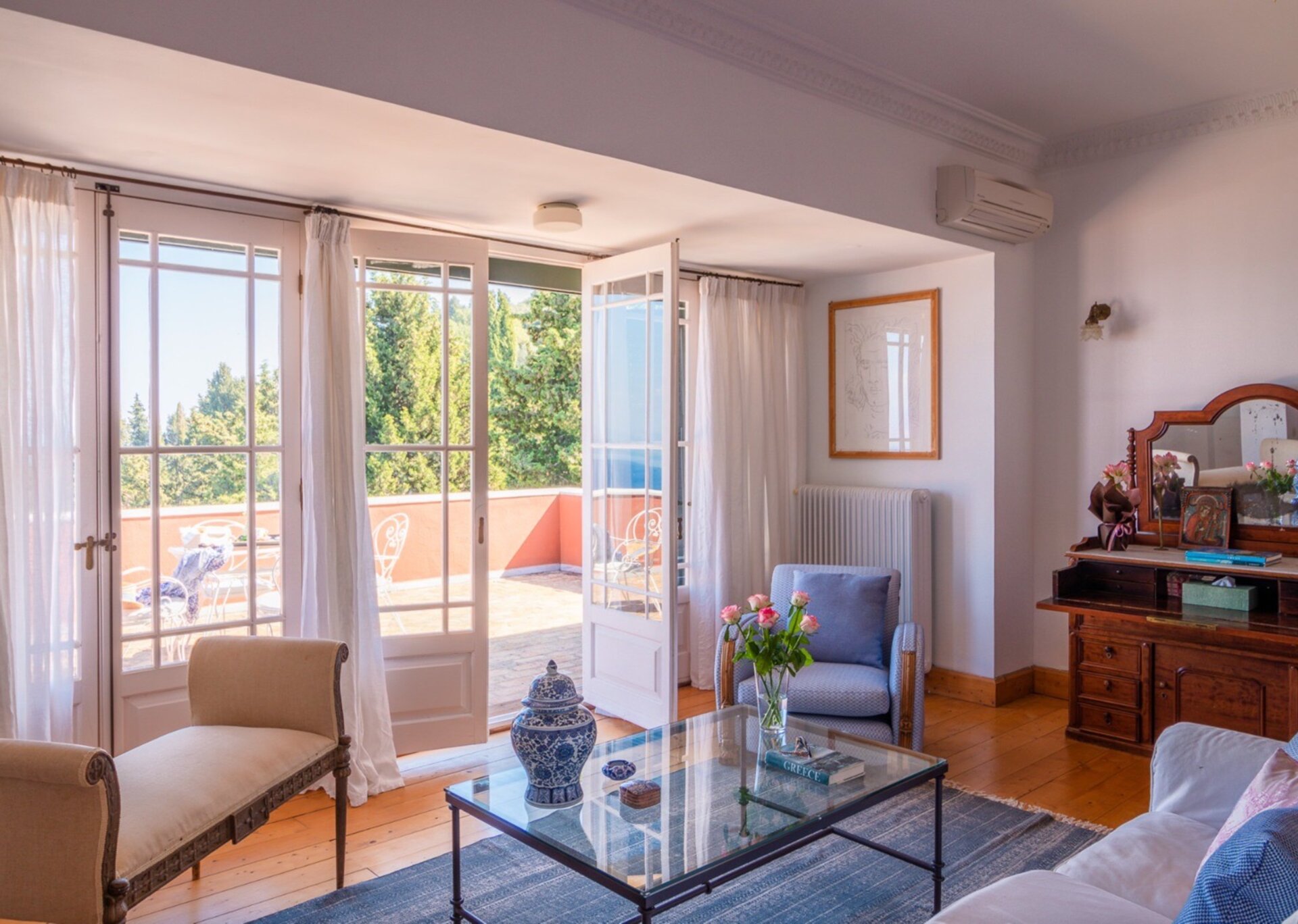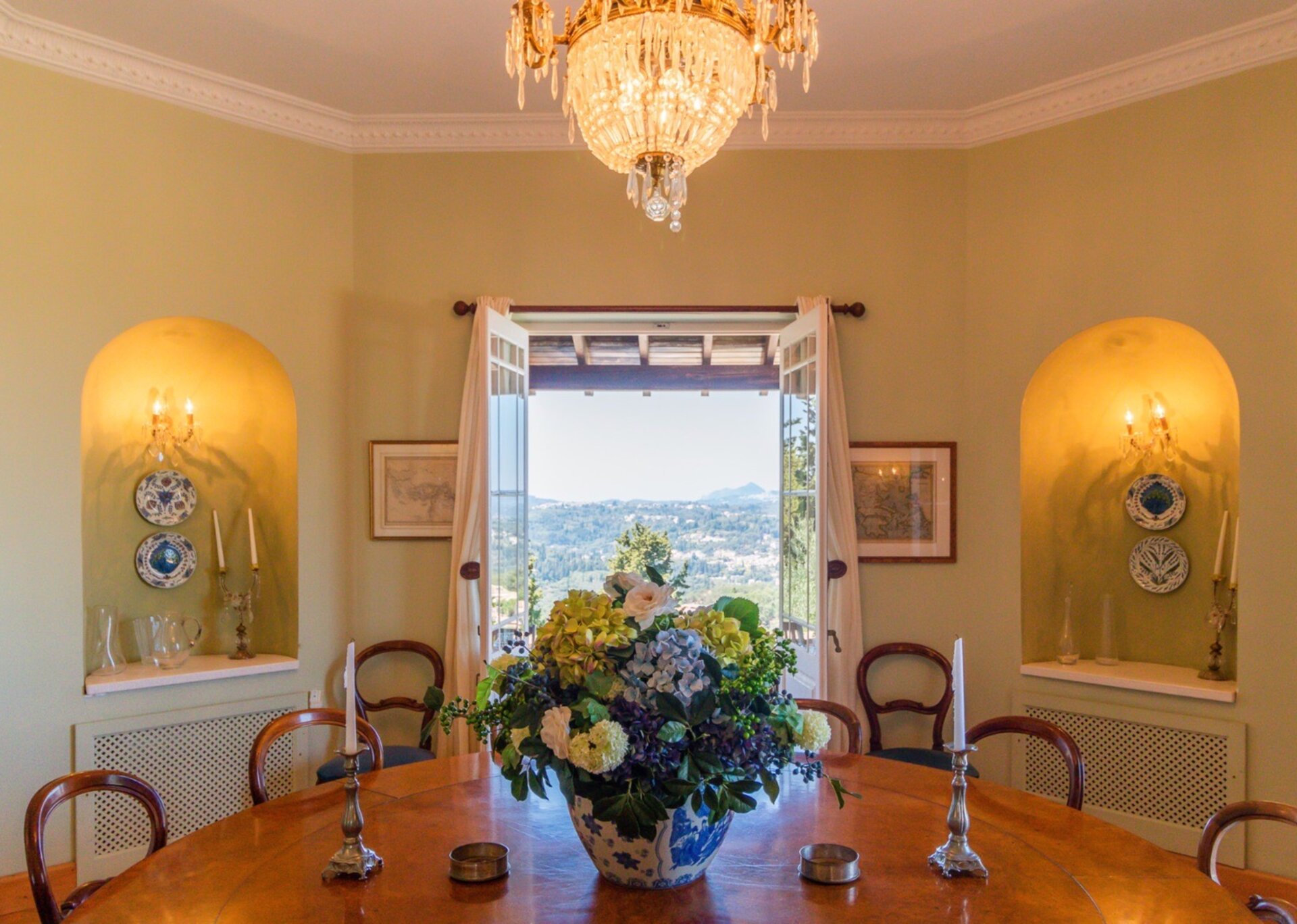 On the ground floor, you'll find a generously spacious drawing room adorned with an impressive marble fireplace, an elegant octagonal dining room, and a delightful card and sitting room, all showcasing remarkable artwork from the family's collection. The expansive terrace, accessible from the drawing and dining rooms, offers breathtaking views, inviting you to relish in sunset drinks amidst the tranquil evening breeze and savor dinner under the starlit sky.
