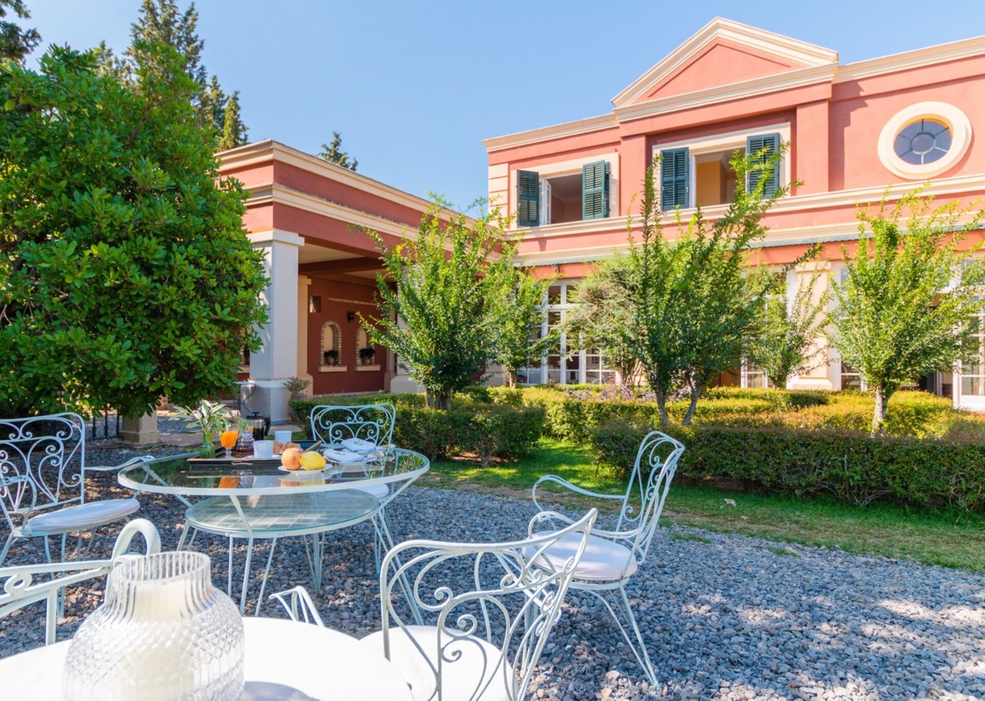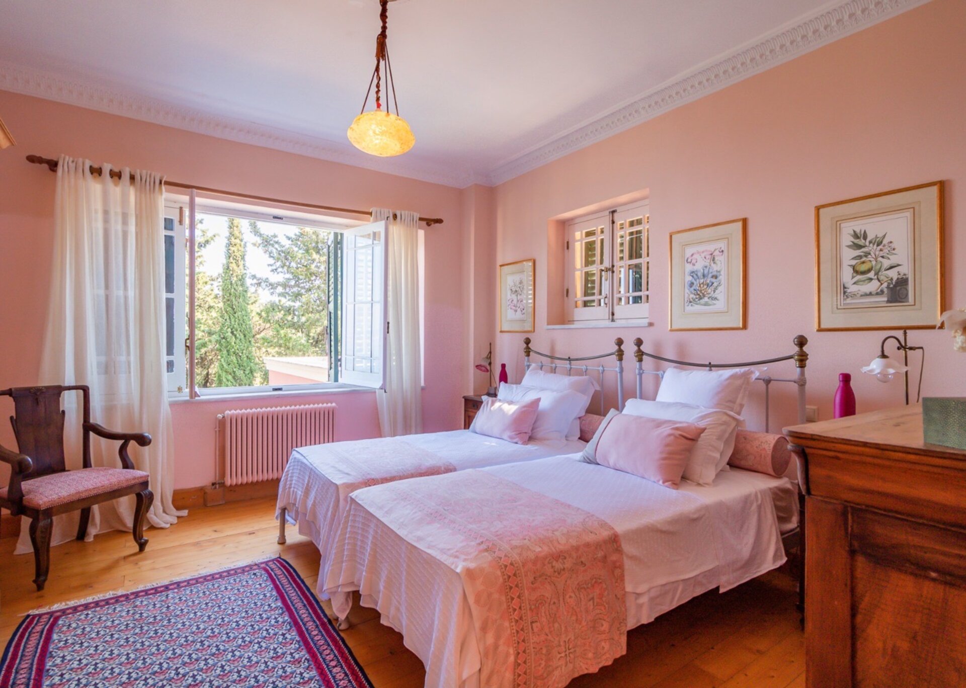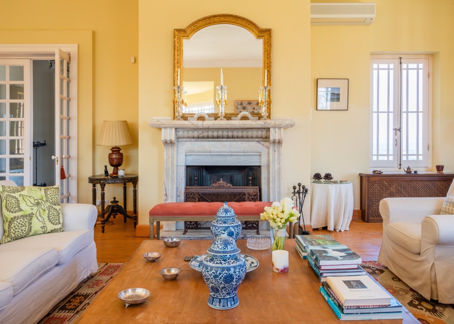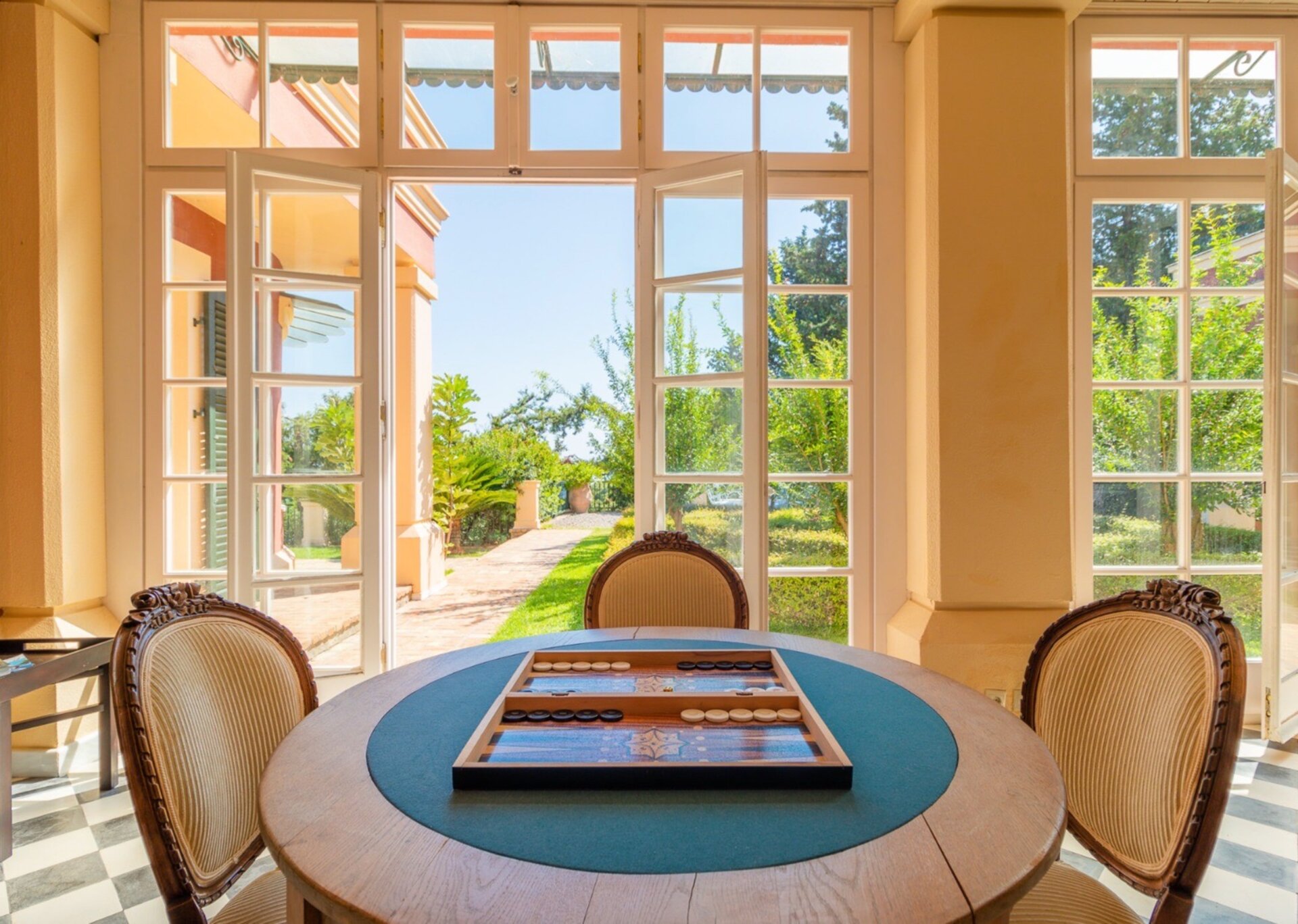 On the ground floor, you'll find a generously spacious drawing room adorned with an impressive marble fireplace, an elegant octagonal dining room, and a delightful card and sitting room, all showcasing remarkable artwork from the family's collection. The expansive terrace, accessible from the drawing and dining rooms, offers breathtaking views, inviting you to relish in sunset drinks amidst the tranquil evening breeze and savor dinner under the starlit sky.