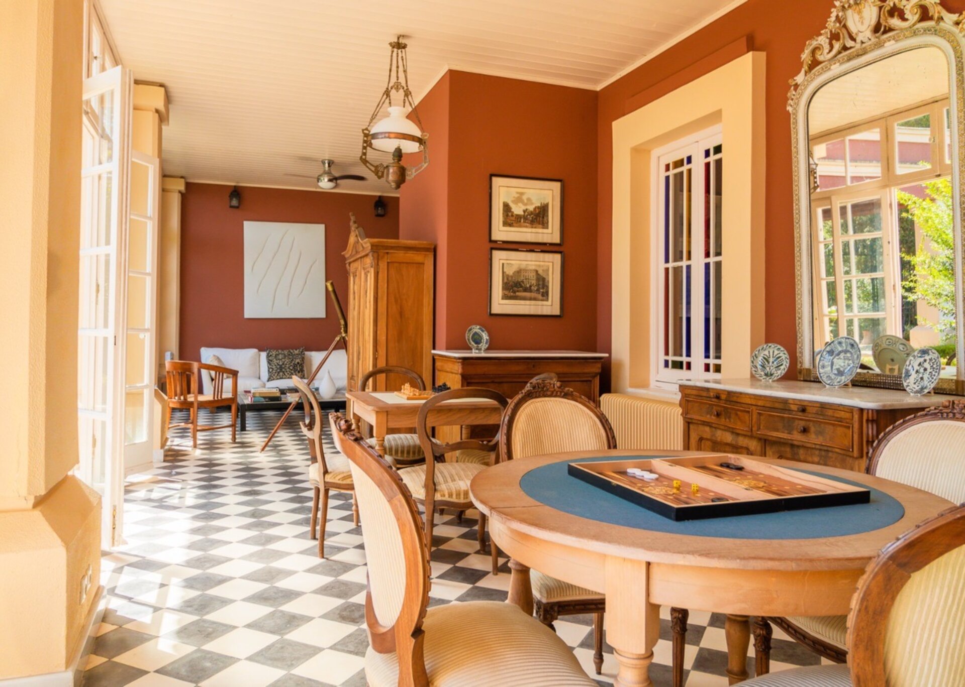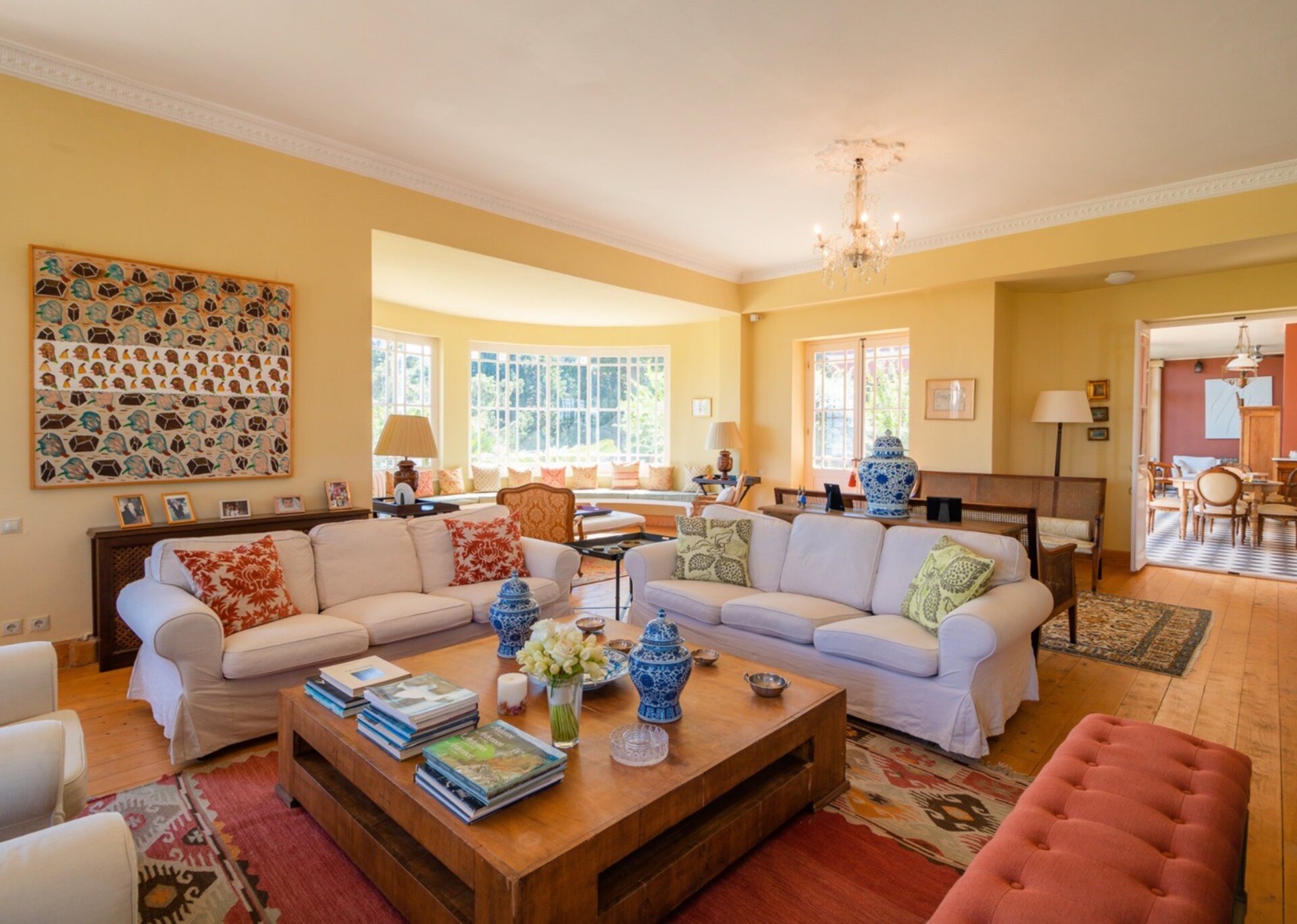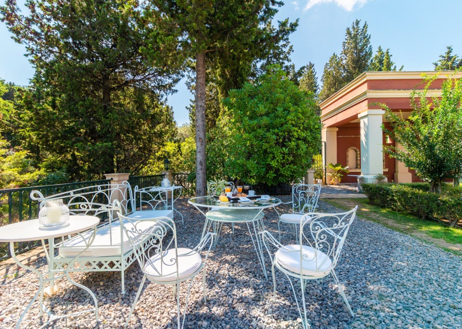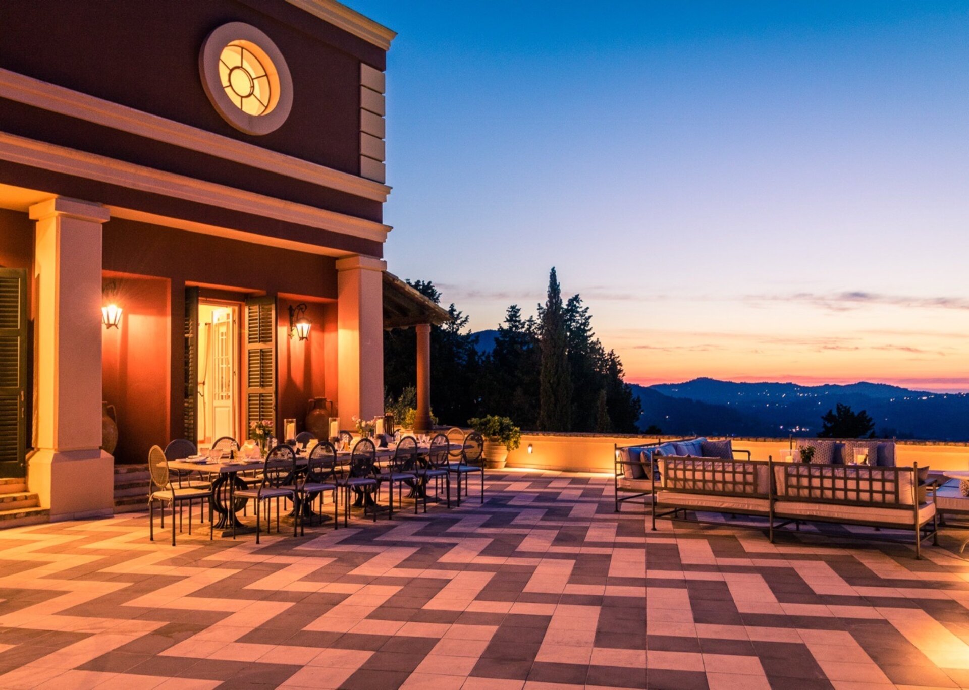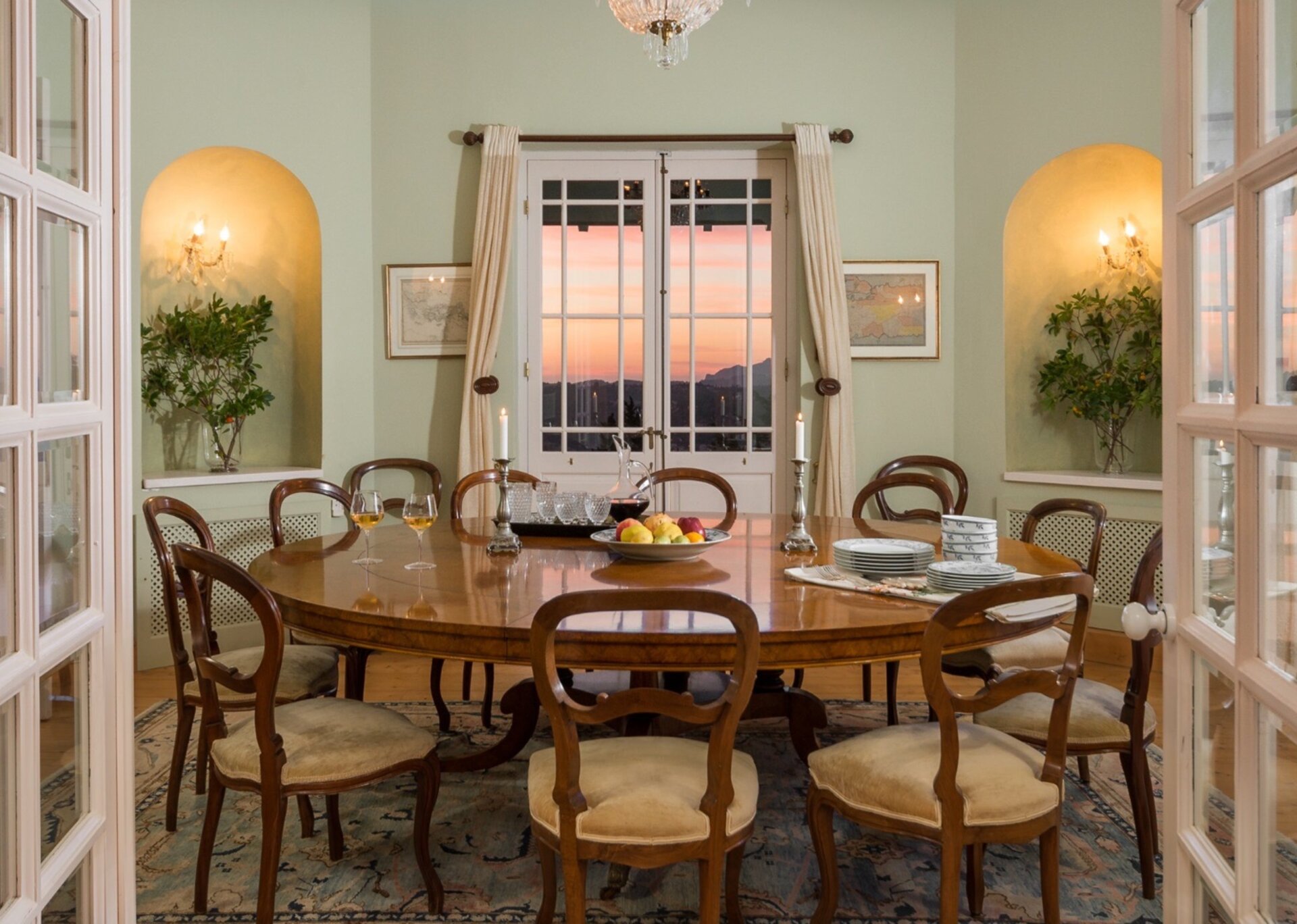 On the ground floor, you'll find a generously spacious drawing room adorned with an impressive marble fireplace, an elegant octagonal dining room, and a delightful card and sitting room, all showcasing remarkable artwork from the family's collection. The expansive terrace, accessible from the drawing and dining rooms, offers breathtaking views, inviting you to relish in sunset drinks amidst the tranquil evening breeze and savor dinner under the starlit sky.