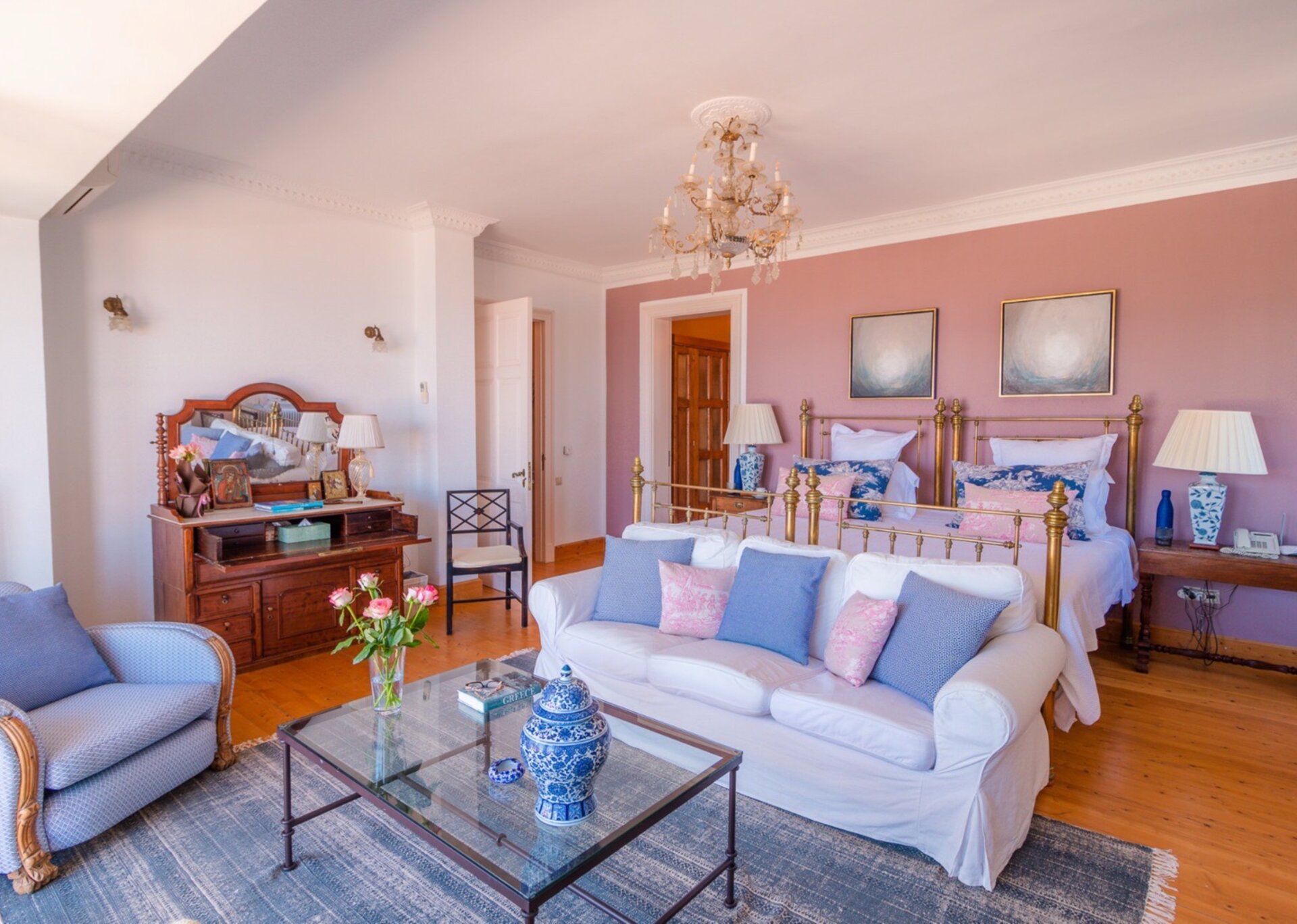 Ascending to the first floor, a truly opulent master bedroom suite awaits, featuring a beautifully designed bathroom with a rare 19th-century marble bath, a dressing room, a study, and two glorious terraces. Additionally, there are two more double bedrooms and a twin bedroom, each boasting en suite bathrooms and adorned in an elegant traditional style.