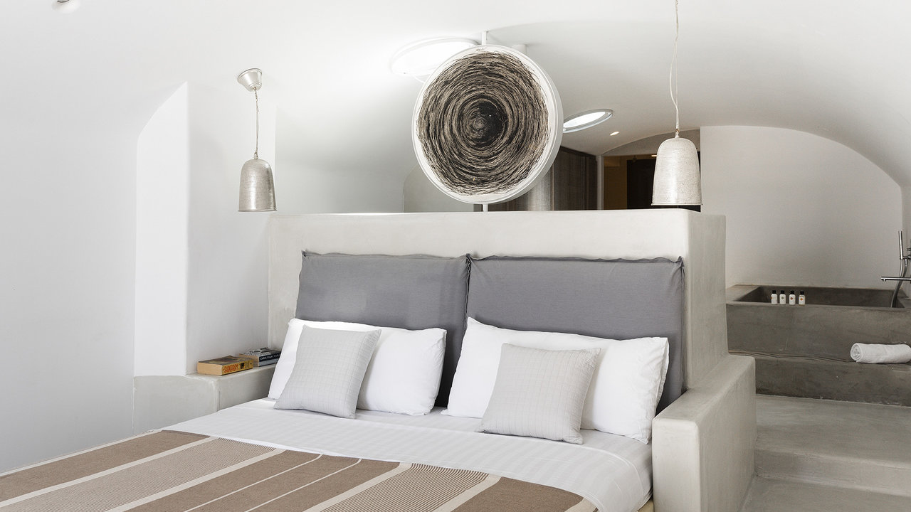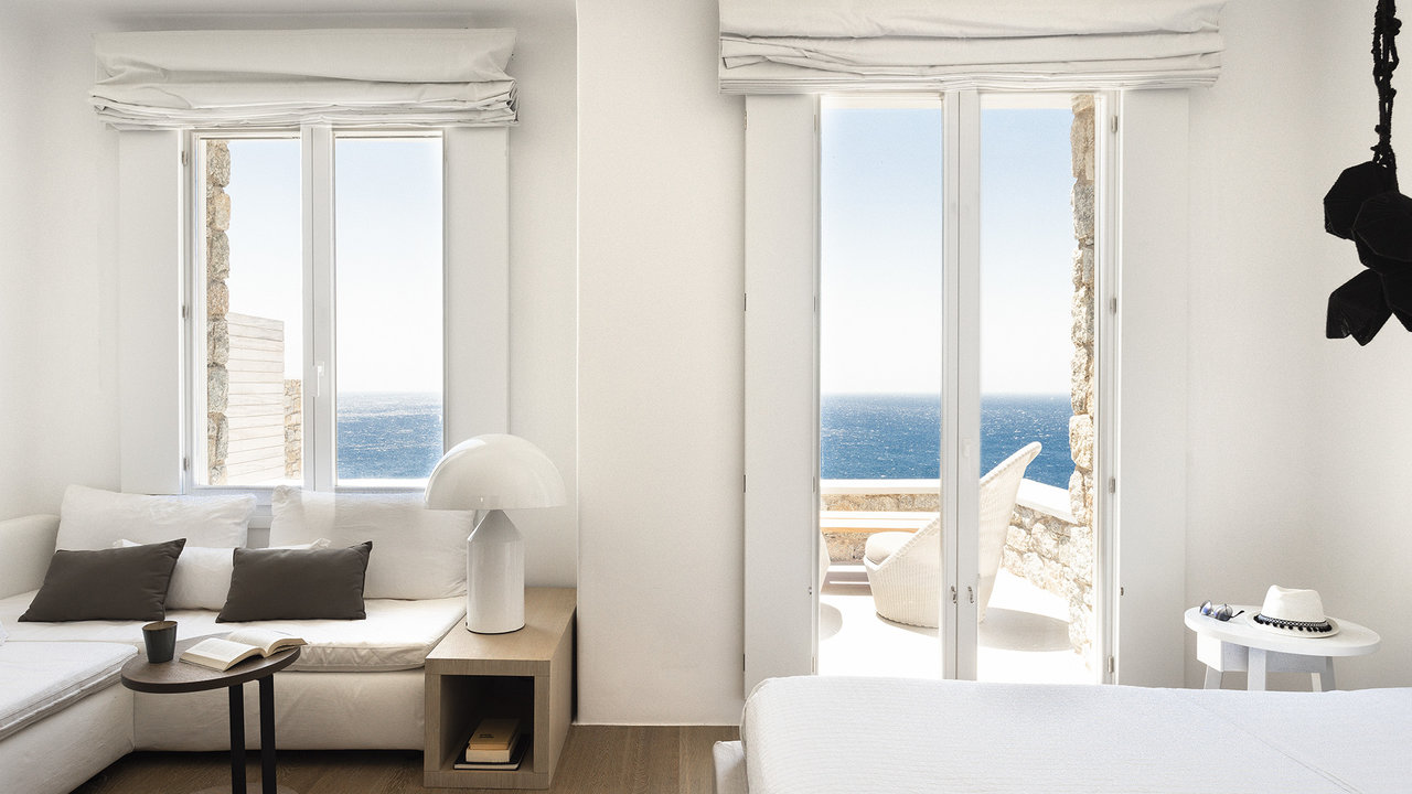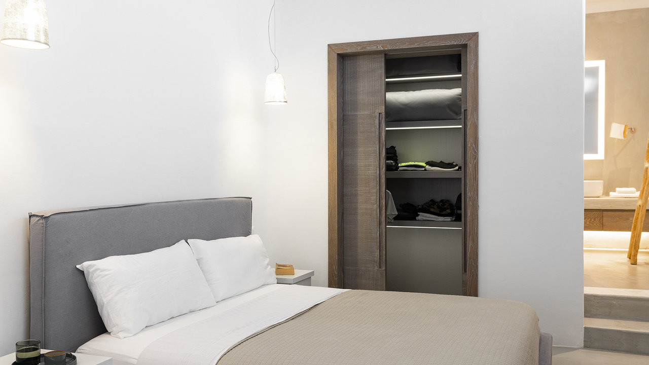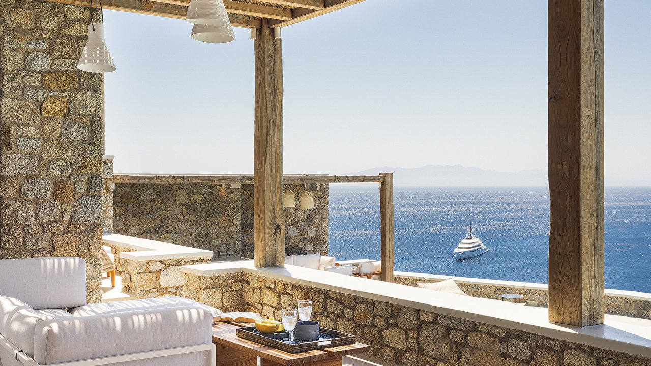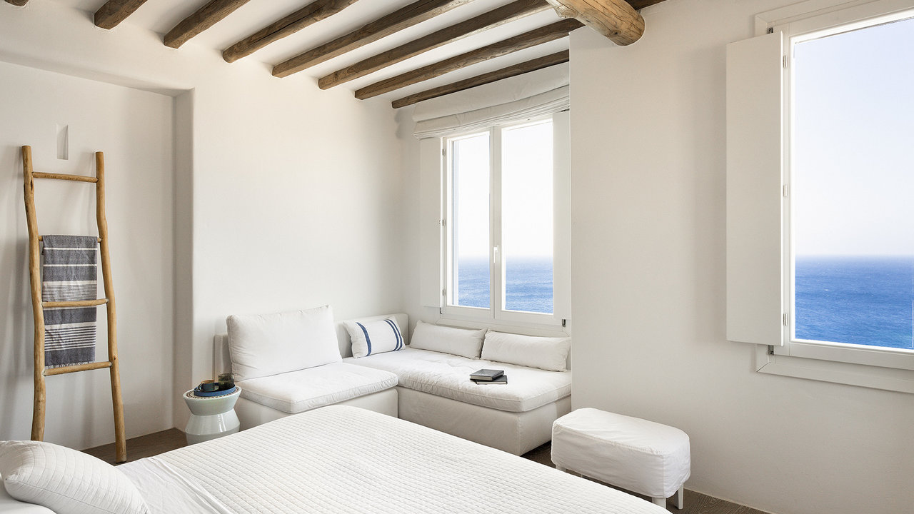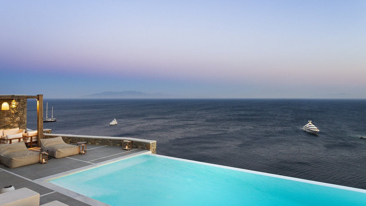 In the large outdoor area, stars sparkle from the bottom of the refreshing private infinity pool while in the clear sky the moon lights the iridescent nights. The Master Bedrooms' private terrace invites guests to an exciting spoiling experience while the custom sun beds and loungers offers infinite moments of relaxation under the warm sun. The unique location of the villa provides perfect shelter from the famous Mykonian winds, as well.