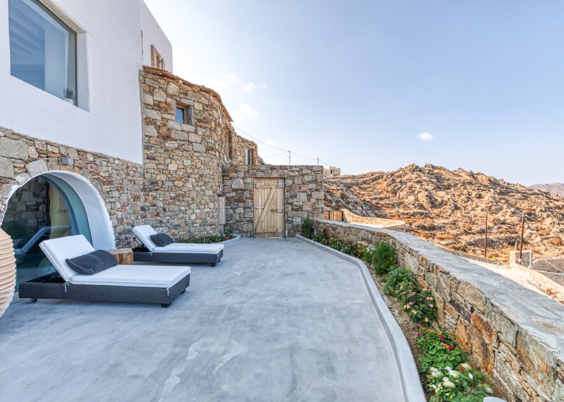 Sunbathe in front of the infinity pool, enjoy the sunrise and the views of Kalo Livadi beach.