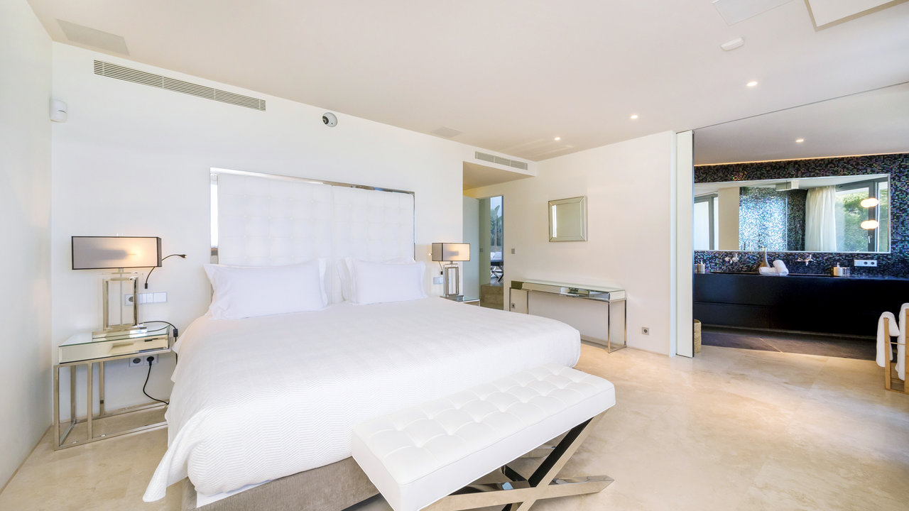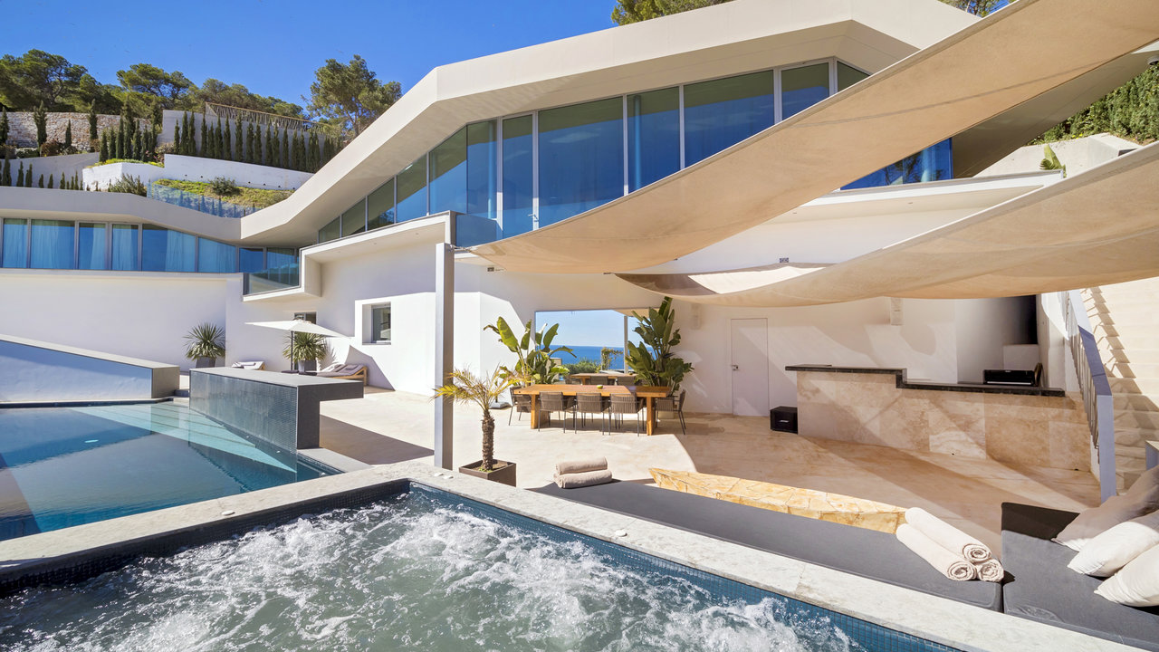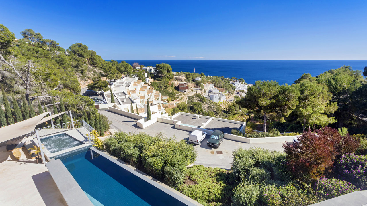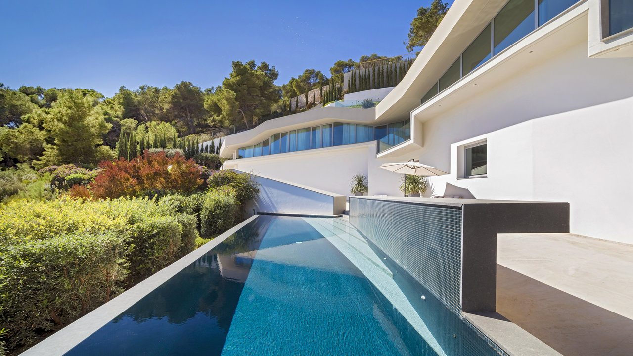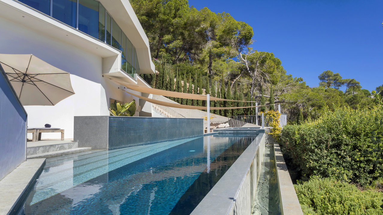 Villa Aster is located just a few kilometres away from Ibiza Town, standing on the hillside of the exclusive residential area of Roca Llisa nestled in the lush green countryside. The luxurious property features outstanding architecture with an impressive minimalist linear design.