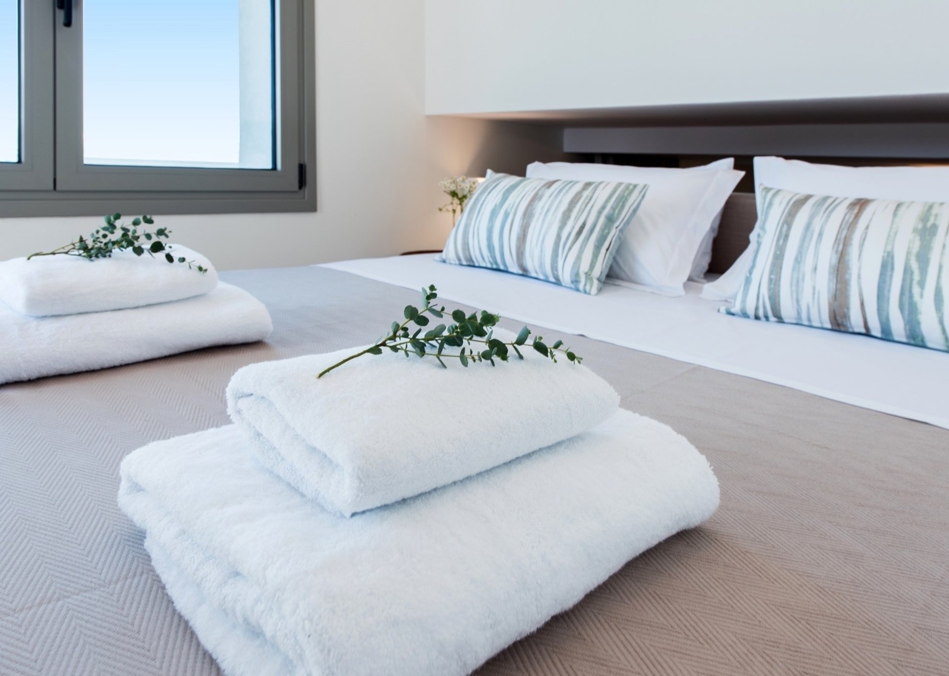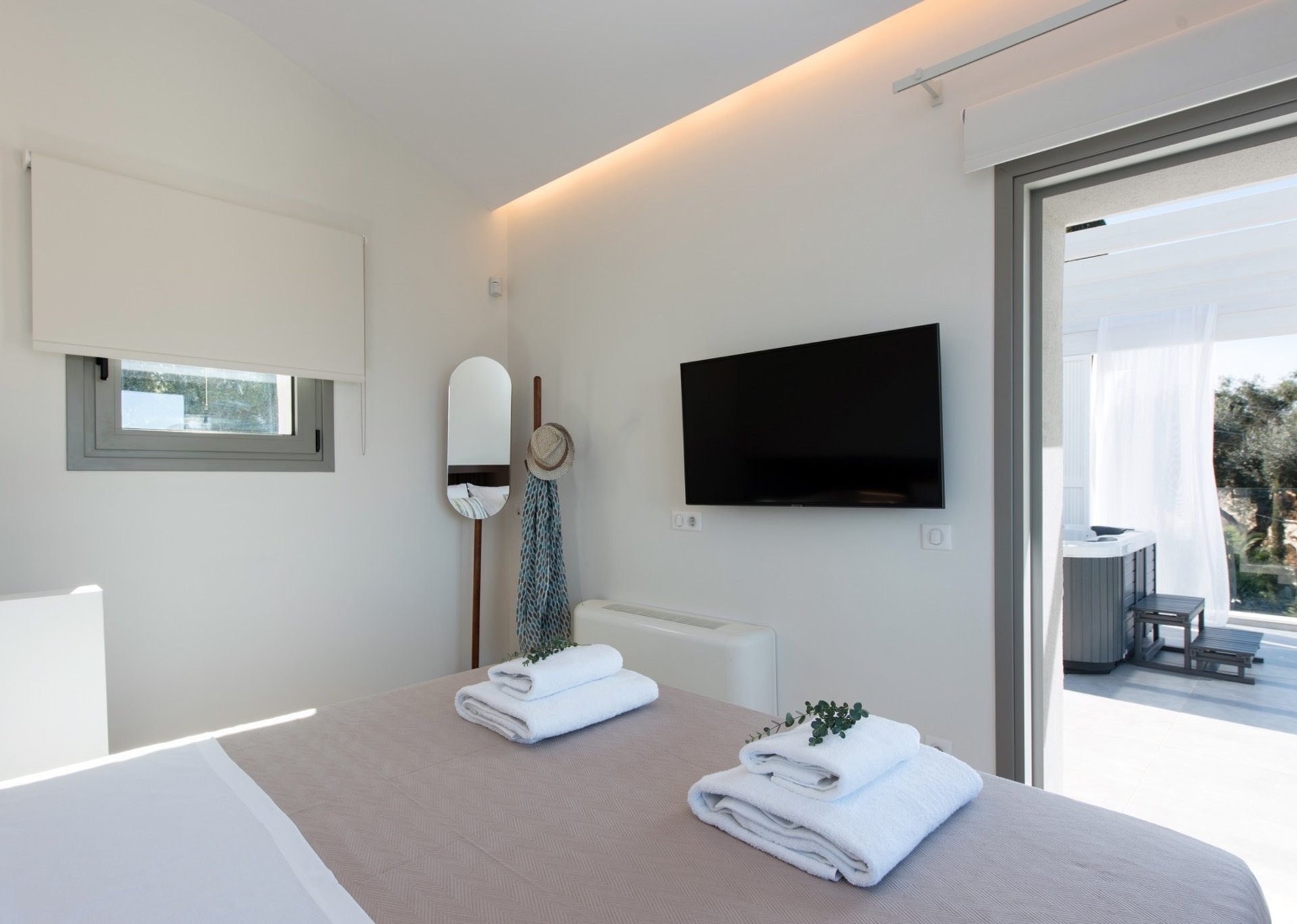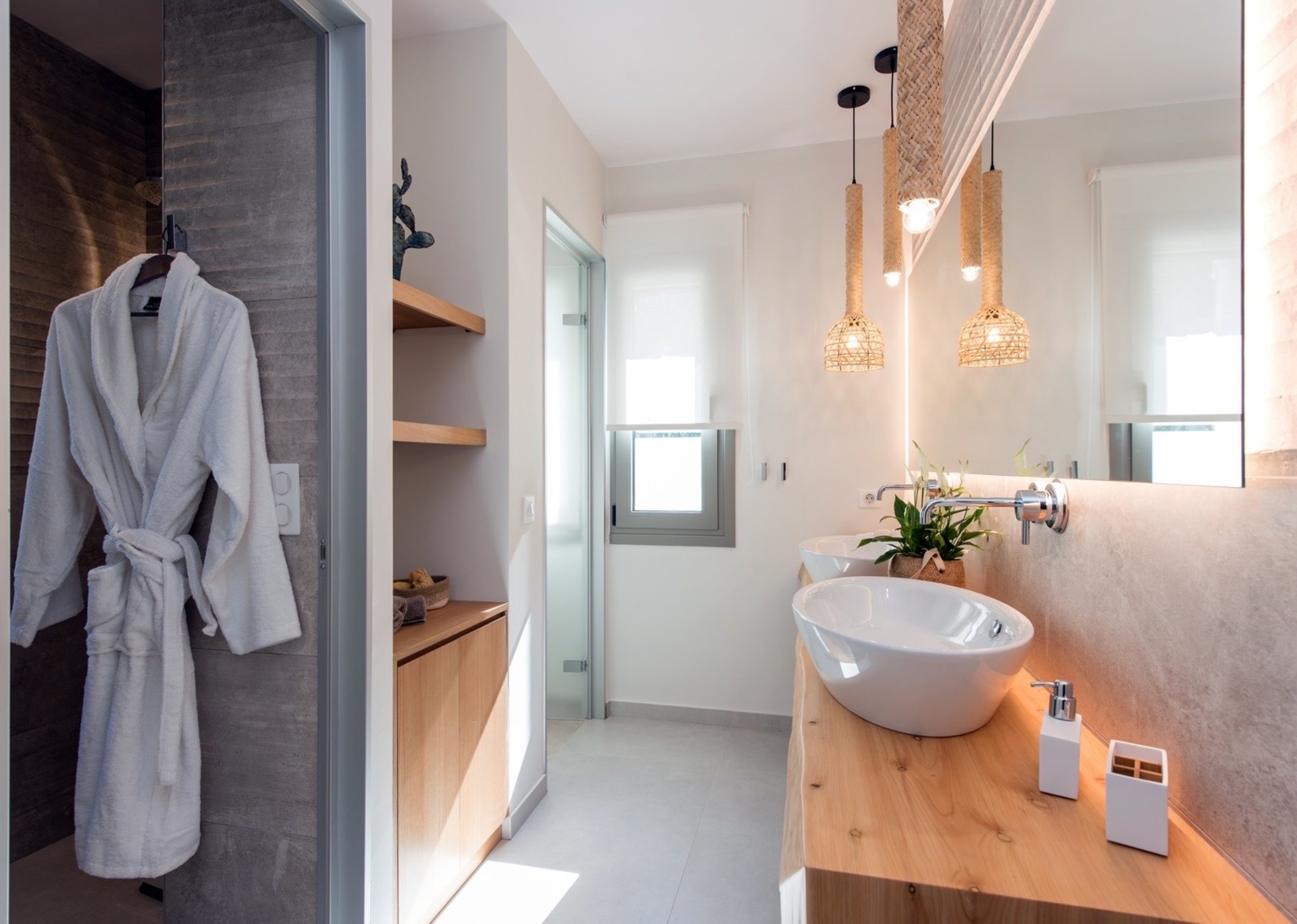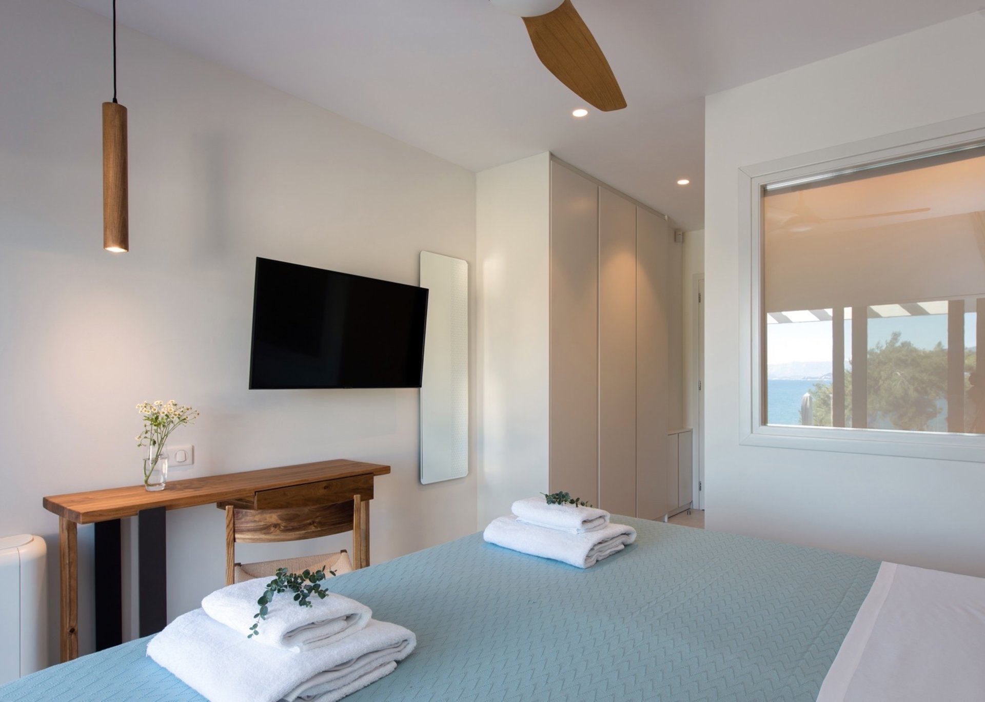 On the first level, guests can enjoy the spectacular sea views from the master bedroom and the large balcony. The bedroom is accompanied by a bathroom that includes a Jacuzzi bathtub. The lower level includes two bedrooms (one double and one twin), two bathrooms, and a WC with amazing views of the pool garden area. The laundry room is also located here.