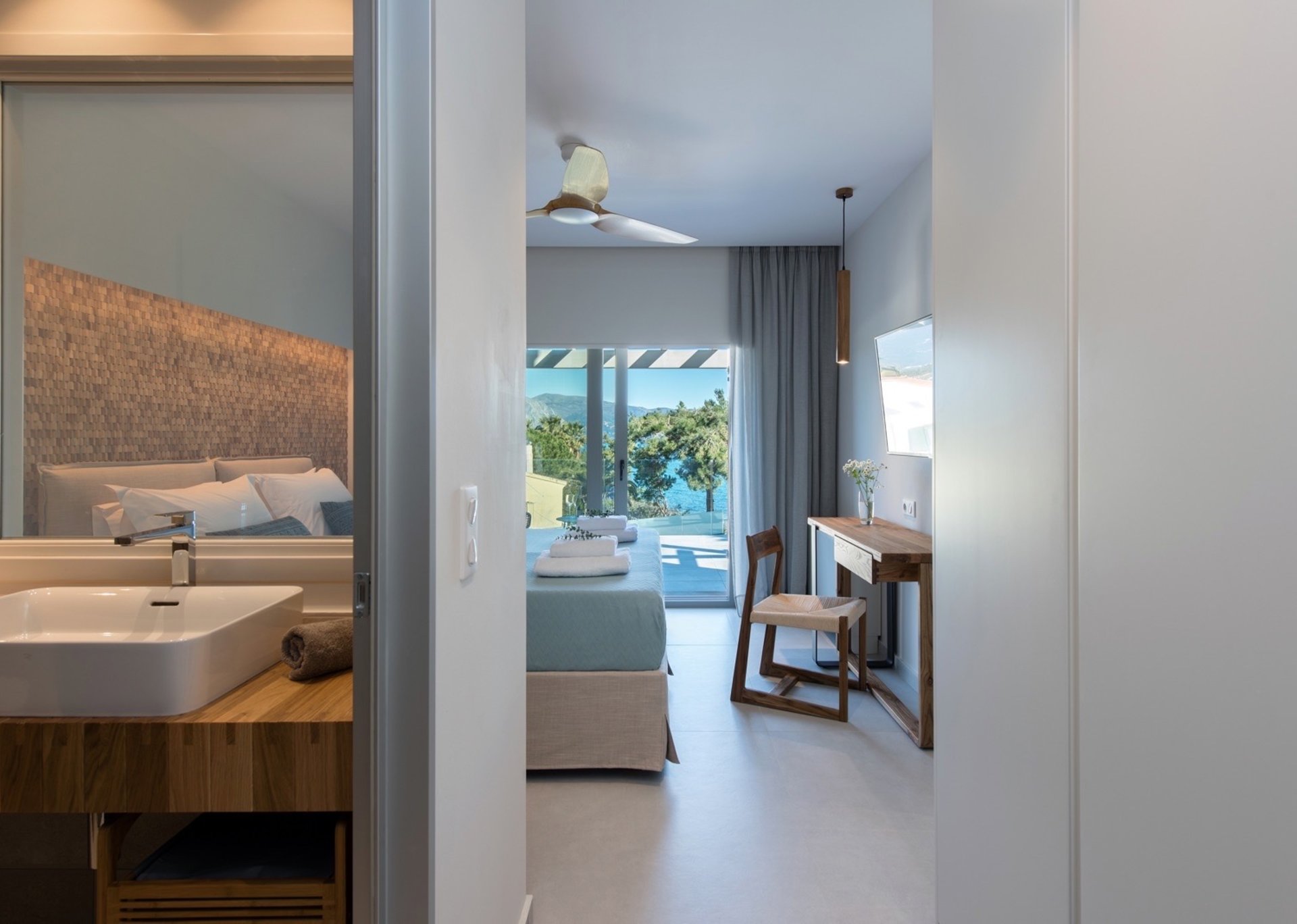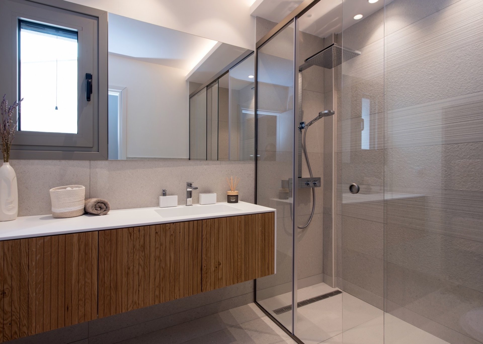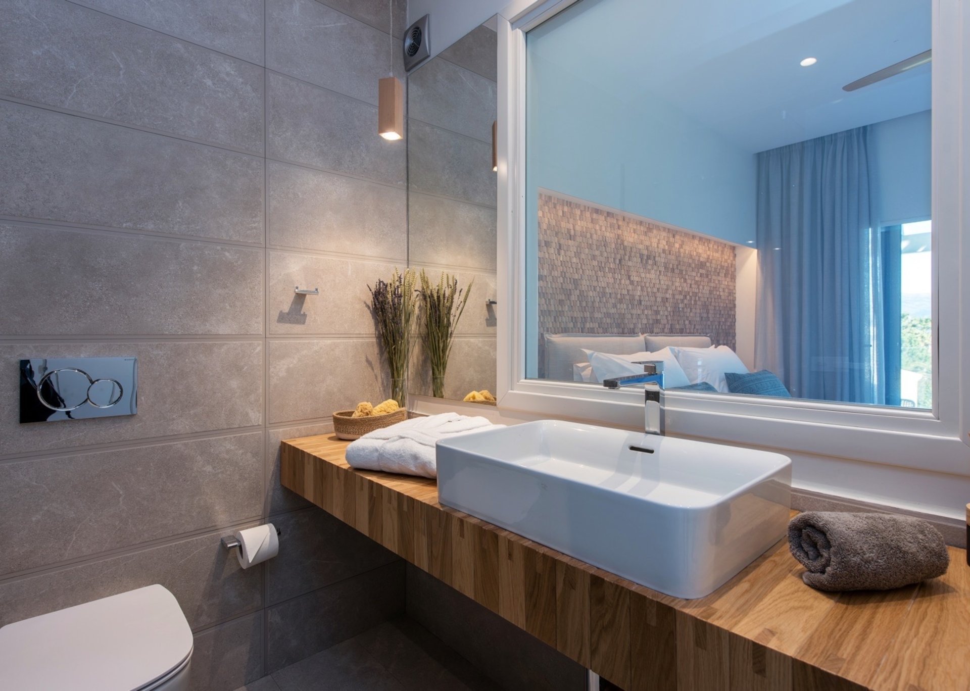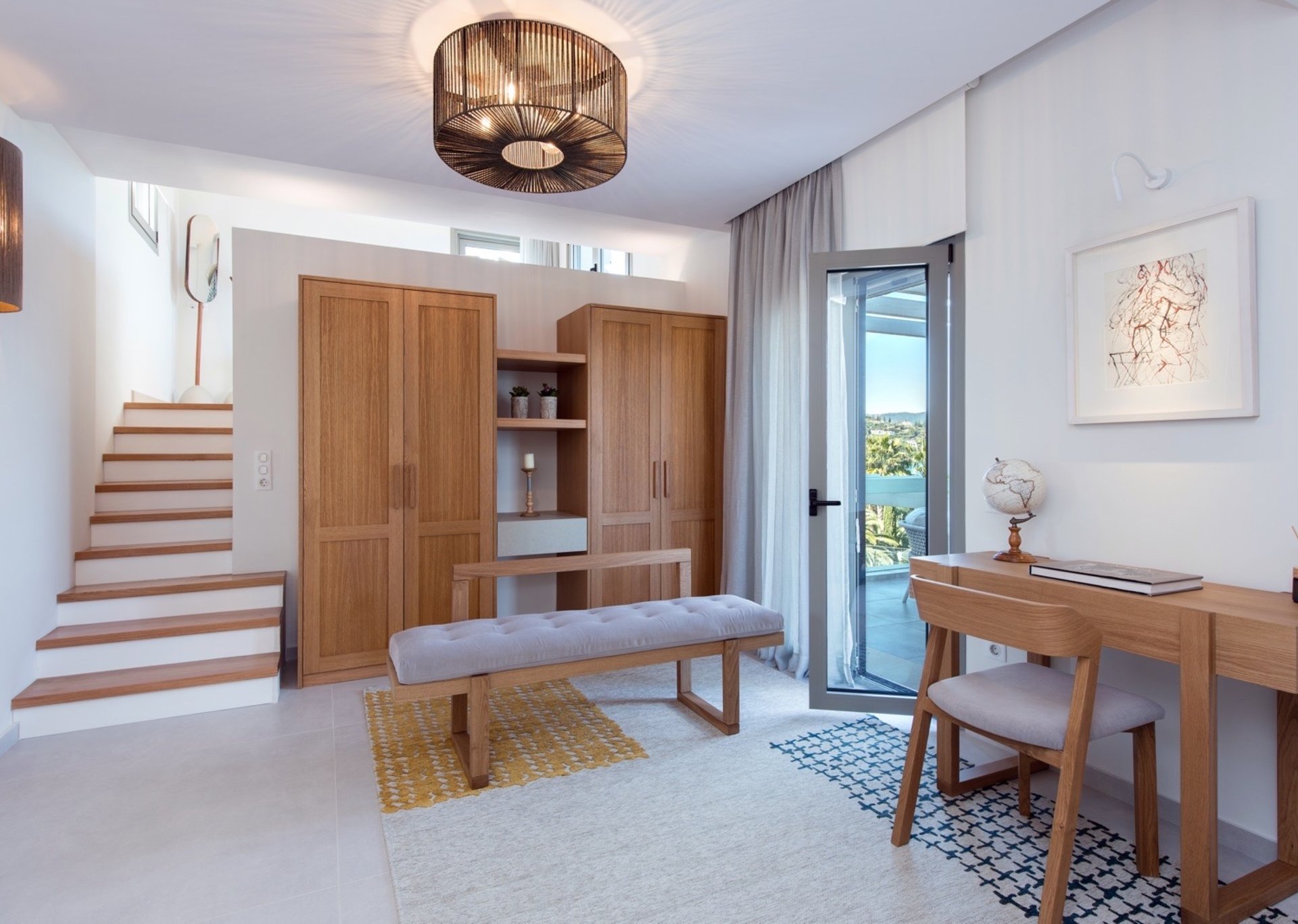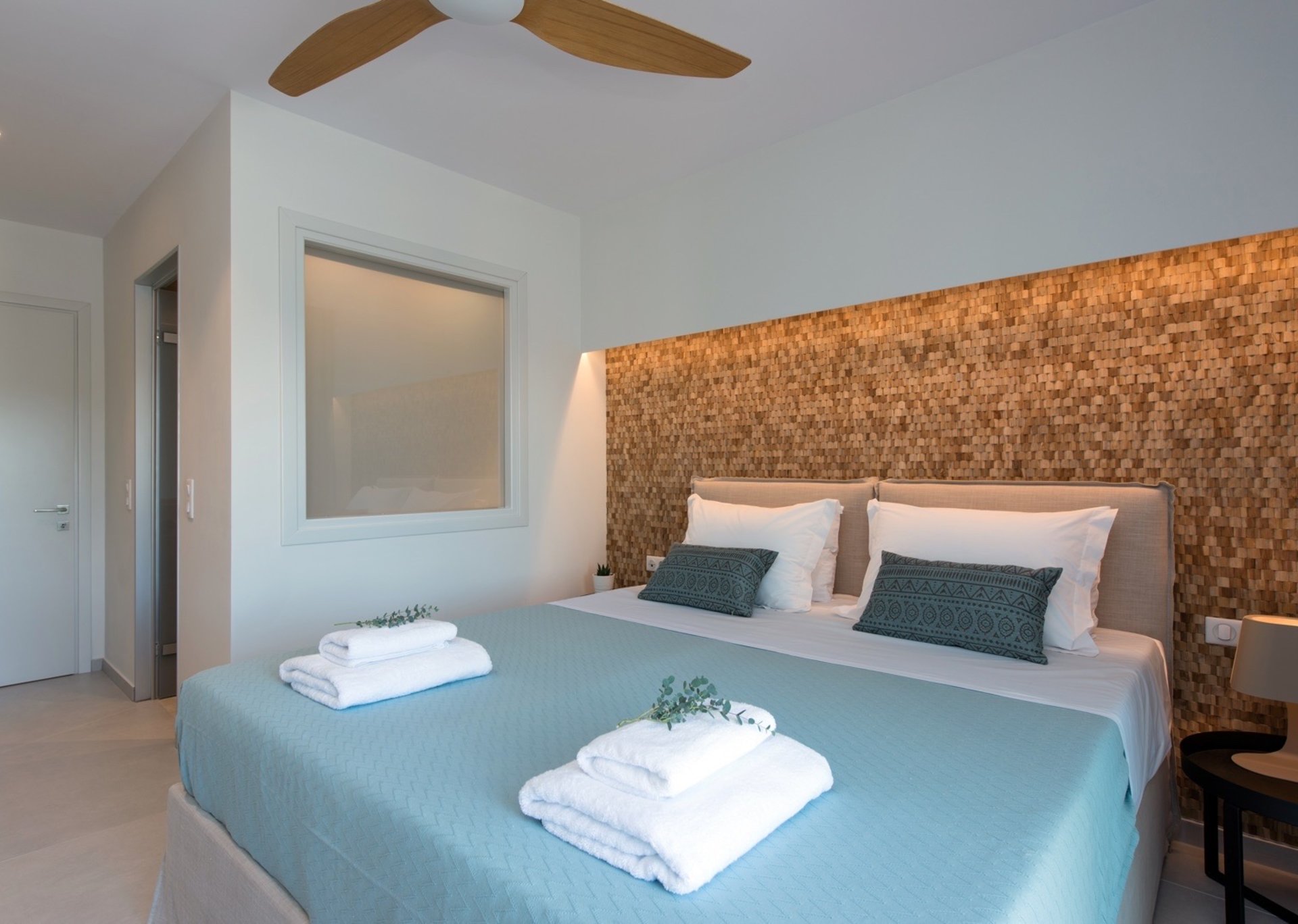 On the first level, guests can enjoy the spectacular sea views from the master bedroom and the large balcony. The bedroom is accompanied by a bathroom that includes a Jacuzzi bathtub. The lower level includes two bedrooms (one double and one twin), two bathrooms, and a WC with amazing views of the pool garden area. The laundry room is also located here.