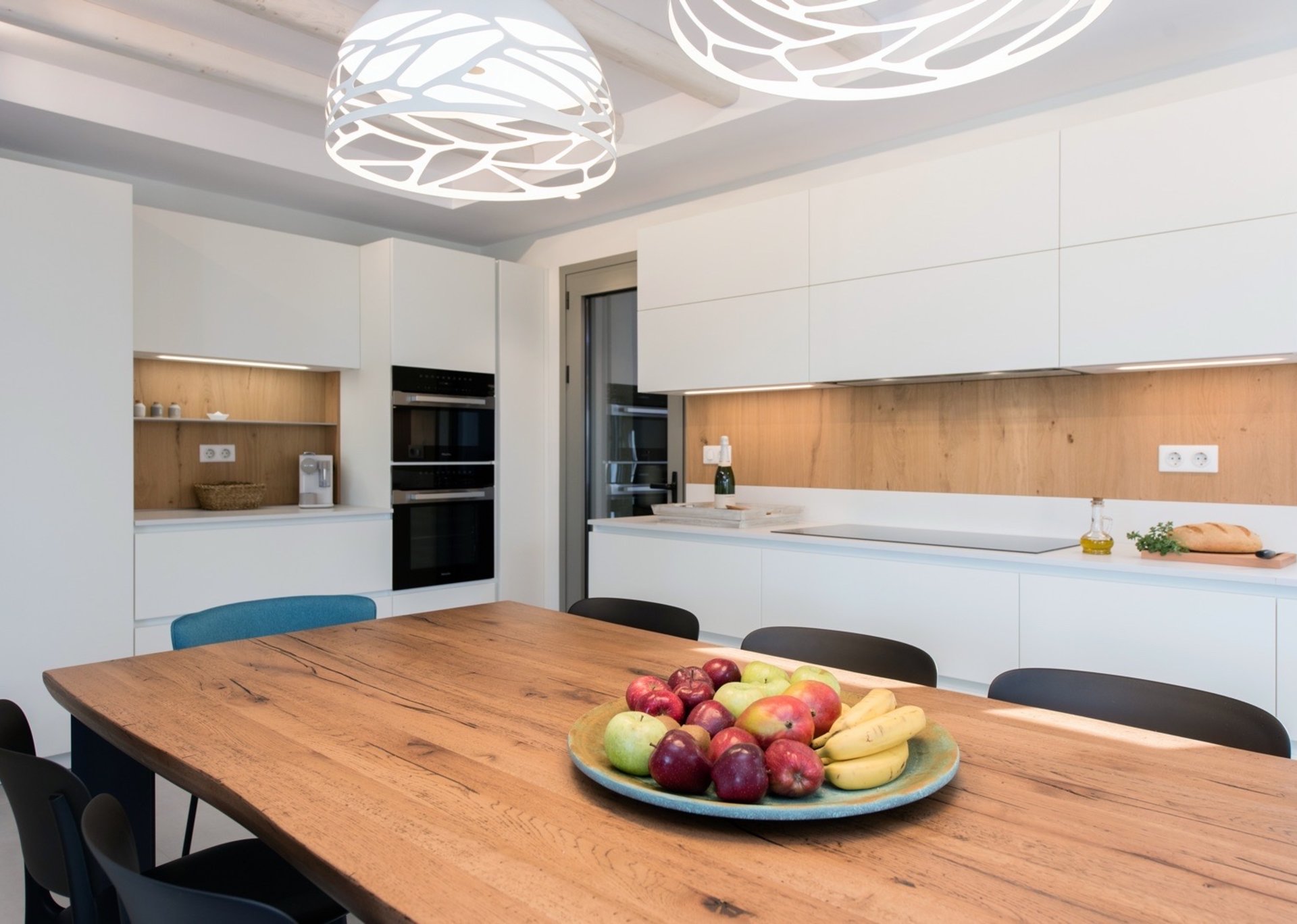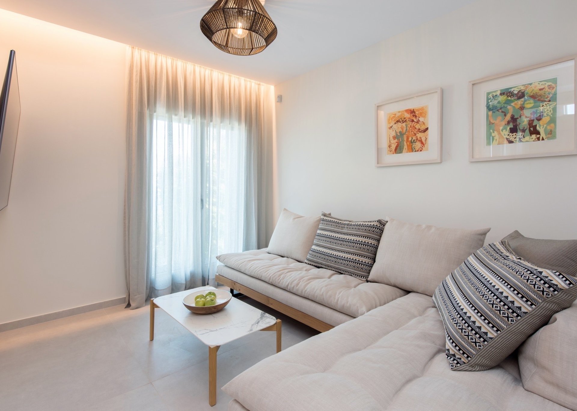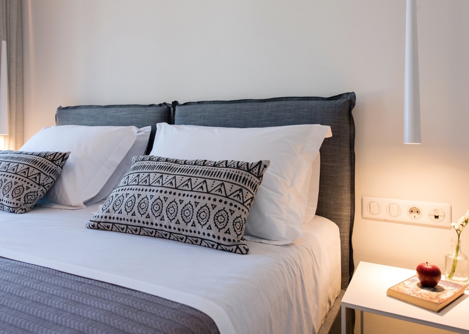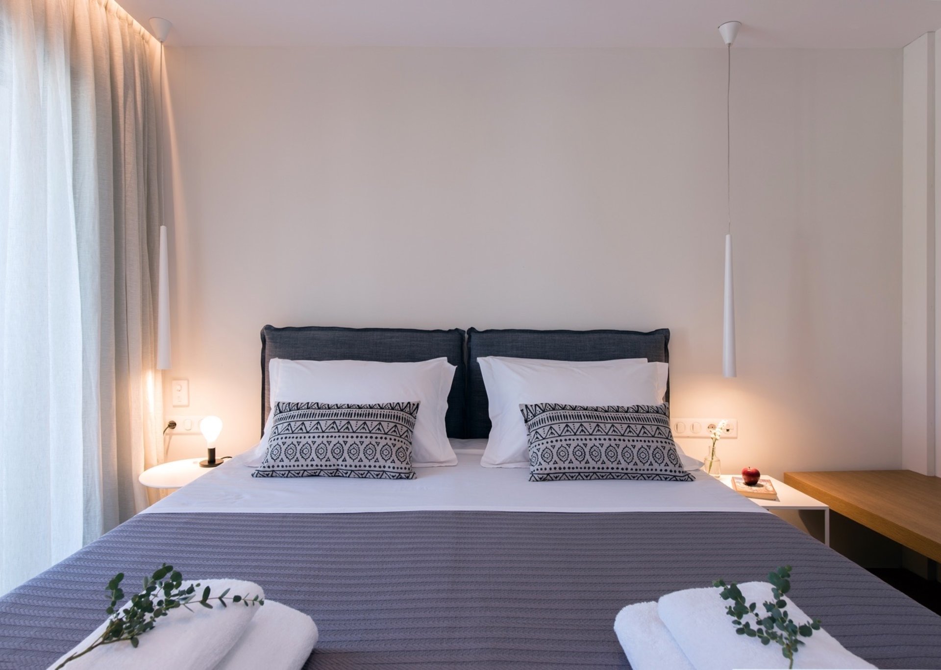 On the first level, guests can enjoy the spectacular sea views from the master bedroom and the large balcony. The bedroom is accompanied by a bathroom that includes a Jacuzzi bathtub. The lower level includes two bedrooms (one double and one twin), two bathrooms, and a WC with amazing views of the pool garden area. The laundry room is also located here.