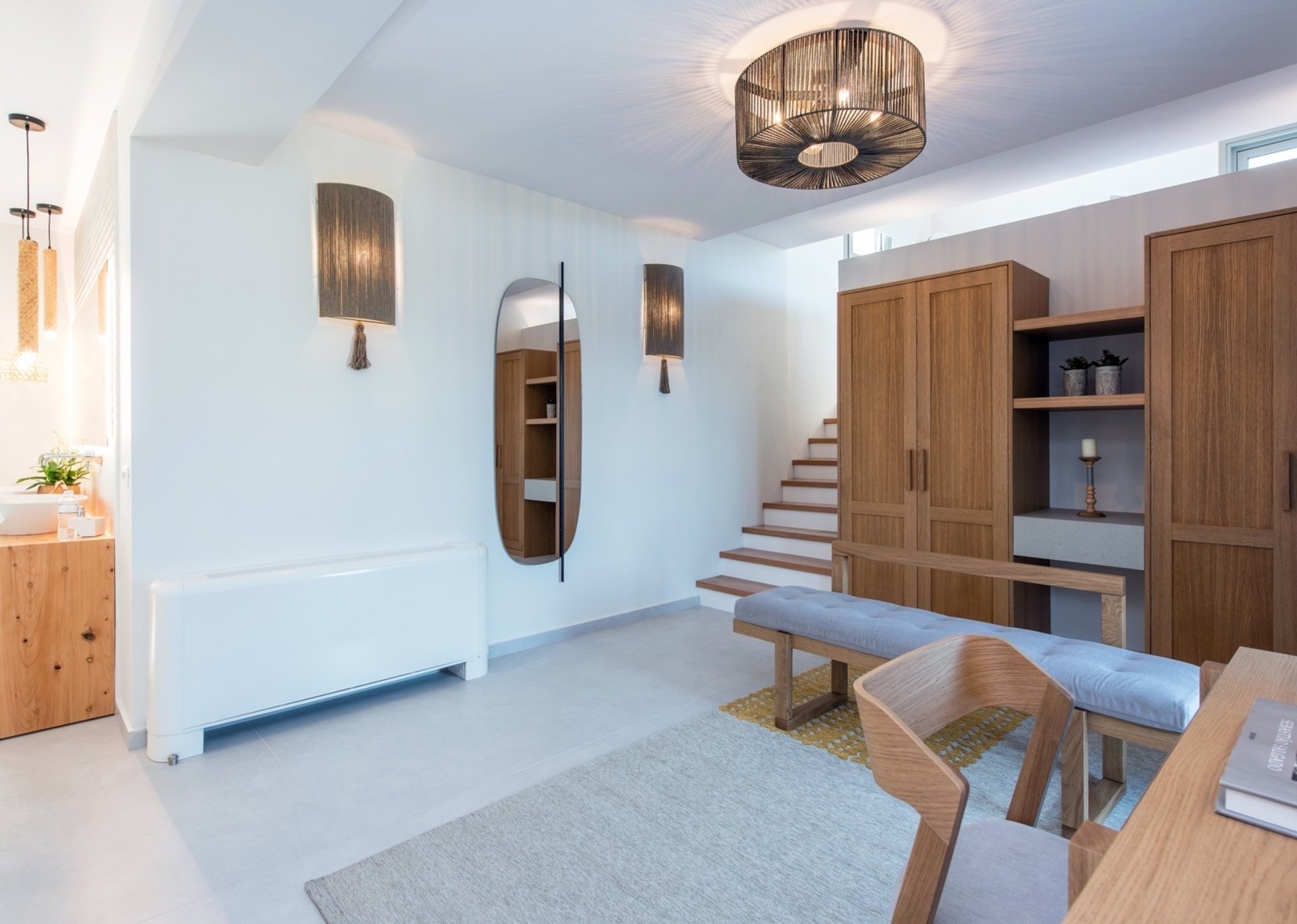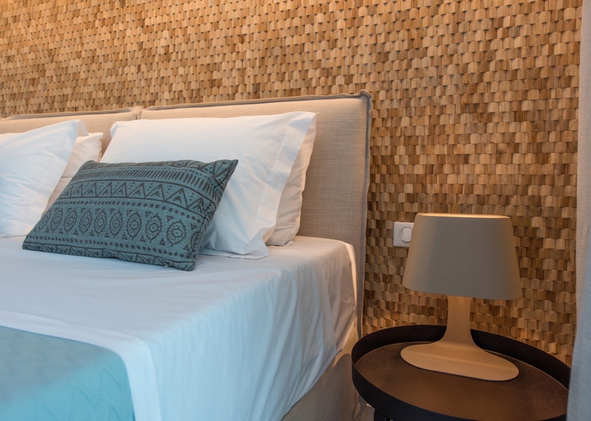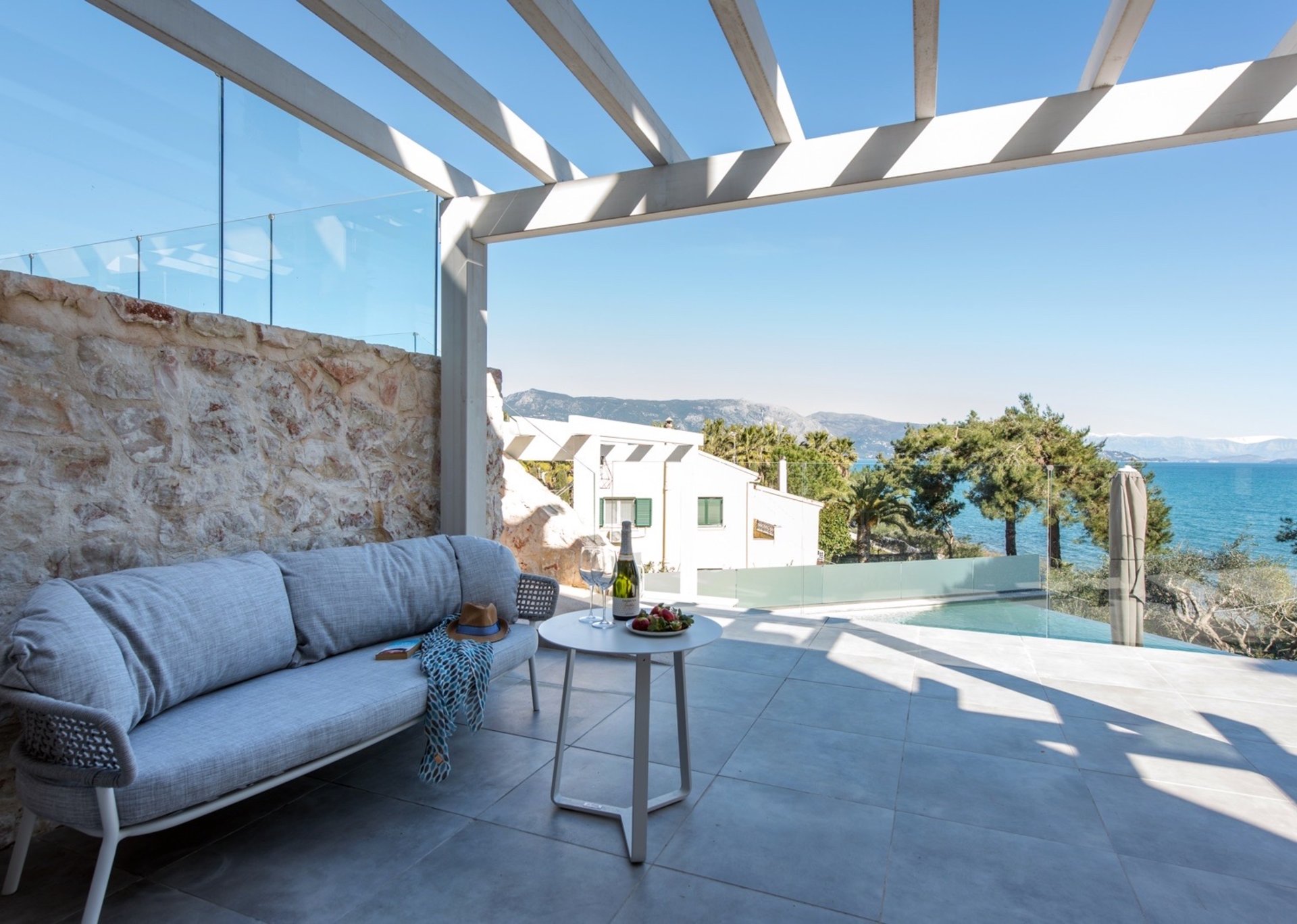 Spread over three levels, Villa Aurelia includes an attached, fully self-contained studio that matches the luxurious style of the main villa, and has the added convenience of its own private entrance off the pool area. The ground floor features a spacious room hosting a large living room, a fully-equipped kitchen, and a wine cellar, all of which offer easy access from the living area.
