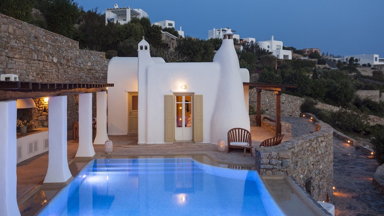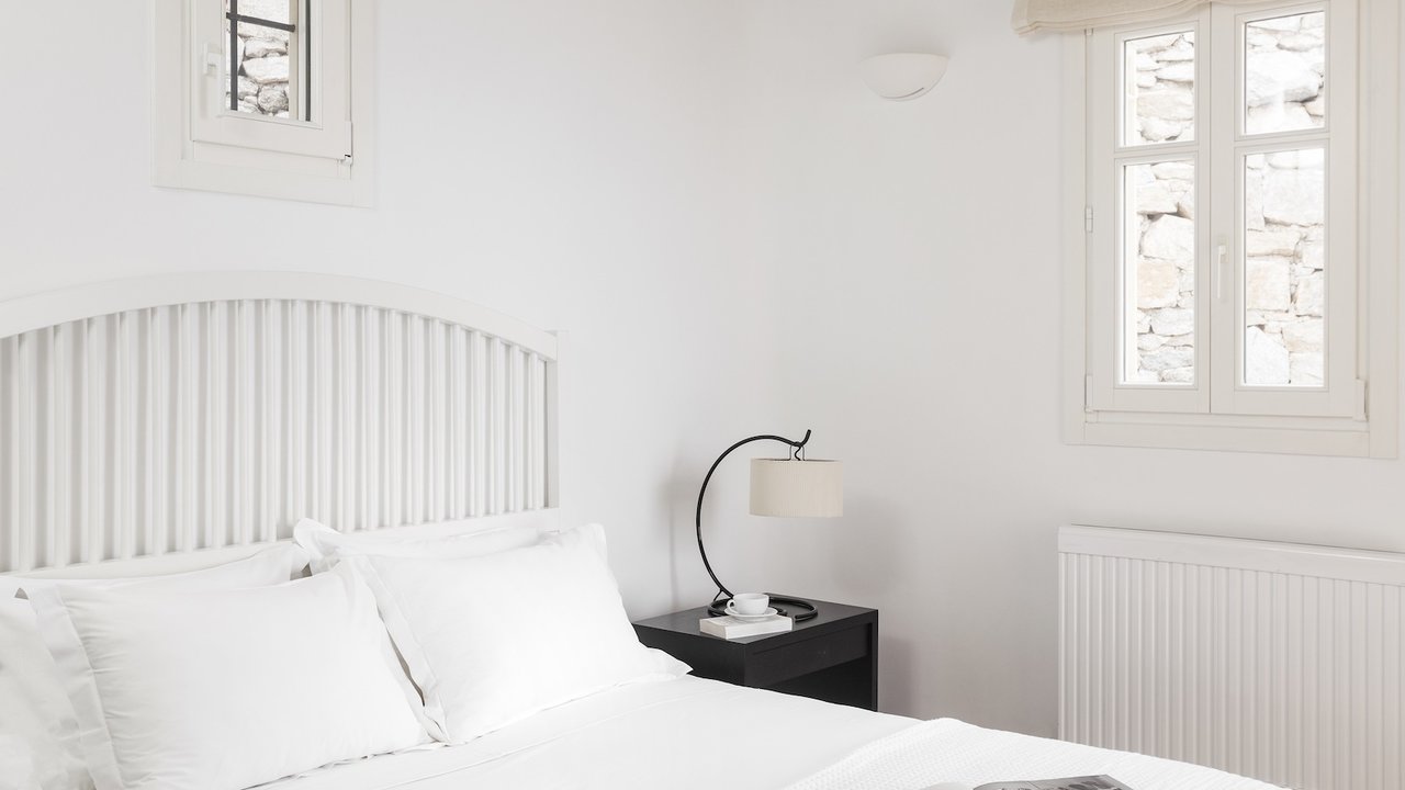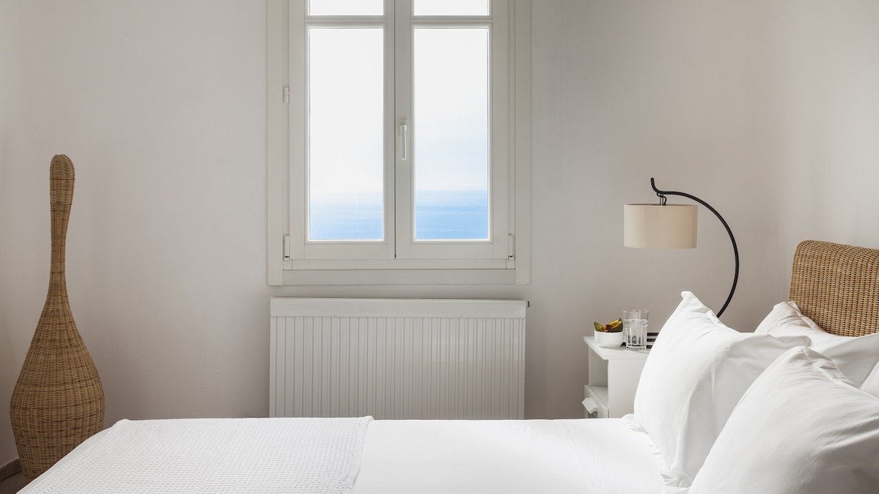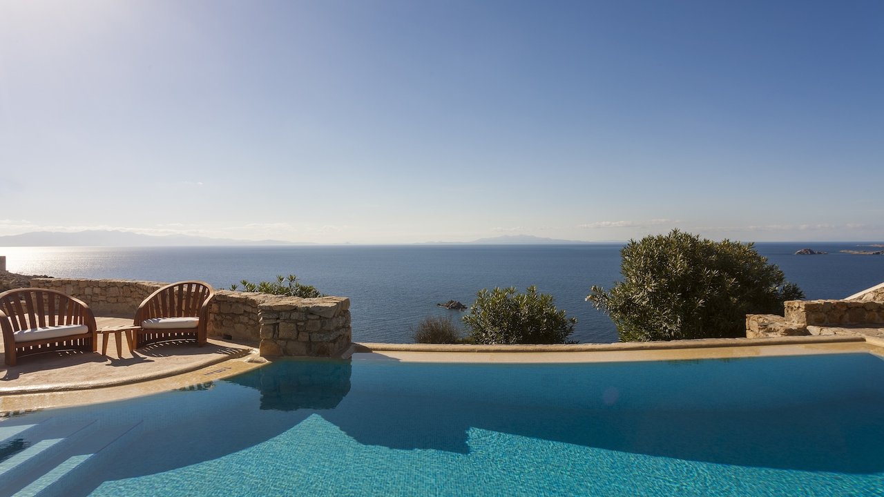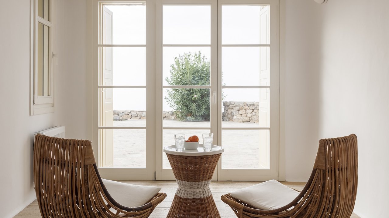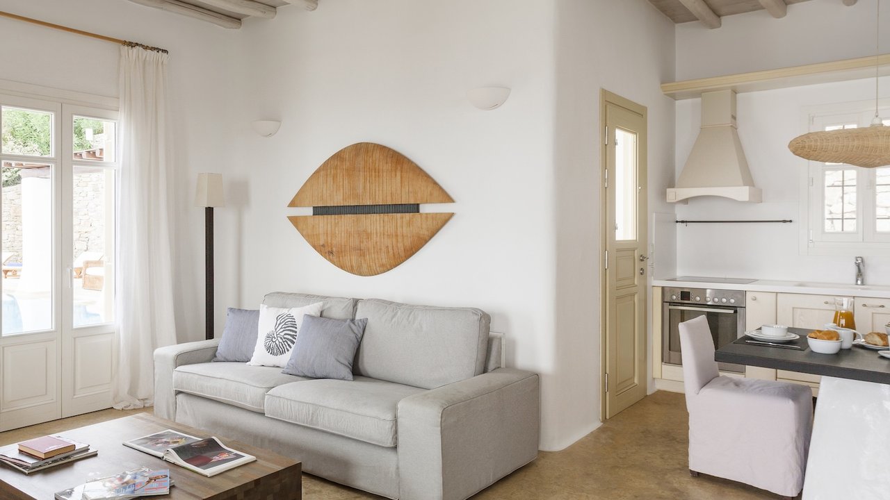 Villa Aventura is perched a top the Mykonos private 11-Villa Resort and enjoys a bird’s eye view of the islands of Delos (where it is alleged Apollo was born) and Rhenea, a majestic drop to the sea and the picture-perfect Mykonos sunset. Villa Aventura boasts an outdoor BBQ and an outdoor dining & lounging area (sunny & shady all day long)- all in front of the 75m2 infinity pool that flows off into the Aegean horizon- and you are still less than a two-minute walk to the sea (still within the resort). Villa Aventura is uniquely ideal for couples, or families with older children vacationing together, who still want some privacy. A main entrance, dining room, living room and kitchen, on the pool level, leads to 2 bedrooms that share a bathroom. Through a separate entrance, on the ground level, is a large bedroom, a kitchenette, living-dining area and a bathroom. The brilliant white interiors and exteriors and the subtle tasteful decorations reflect the Mykonian-elegance the island is known for, so you can totally immerse yourself in the spirit of the island. The refurbished luxury estate has daily, complimentary maid service-so you don’t lift a finger, 24/7 CCTV monitoring at the periphery of the estate- so unauthorized people are detectable, Netflix- to quench your thirst for relaxed adventure, flat screen TVs- so everyone can watch, back-up generators- to face the frequent local electric shortages, a desalination plant- so you can ignore the frequent local water shortages, and a 24/7 gate-access control. The pool can be heated for a fee.