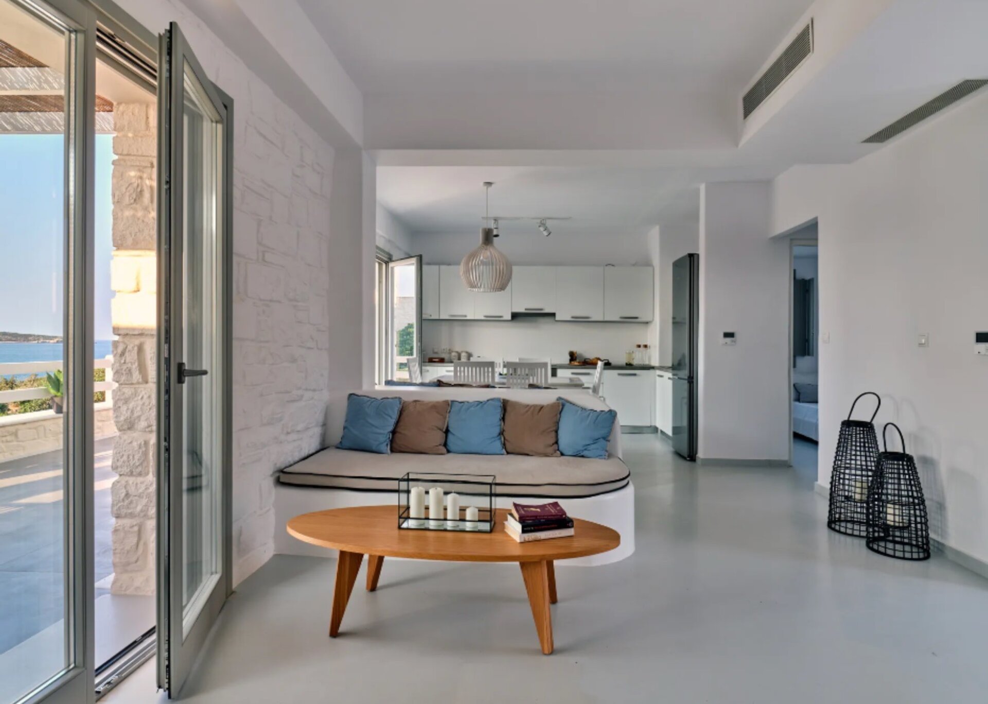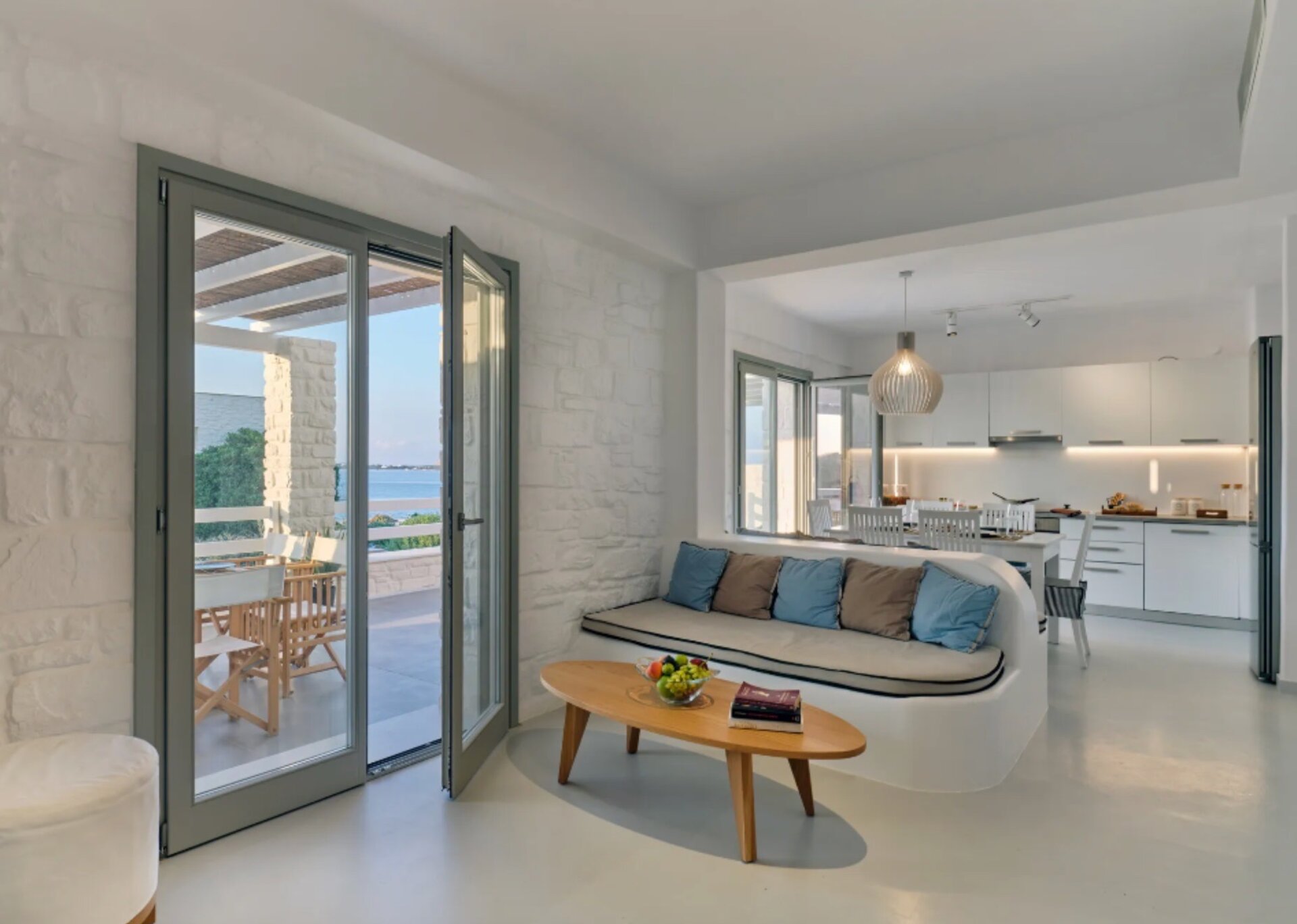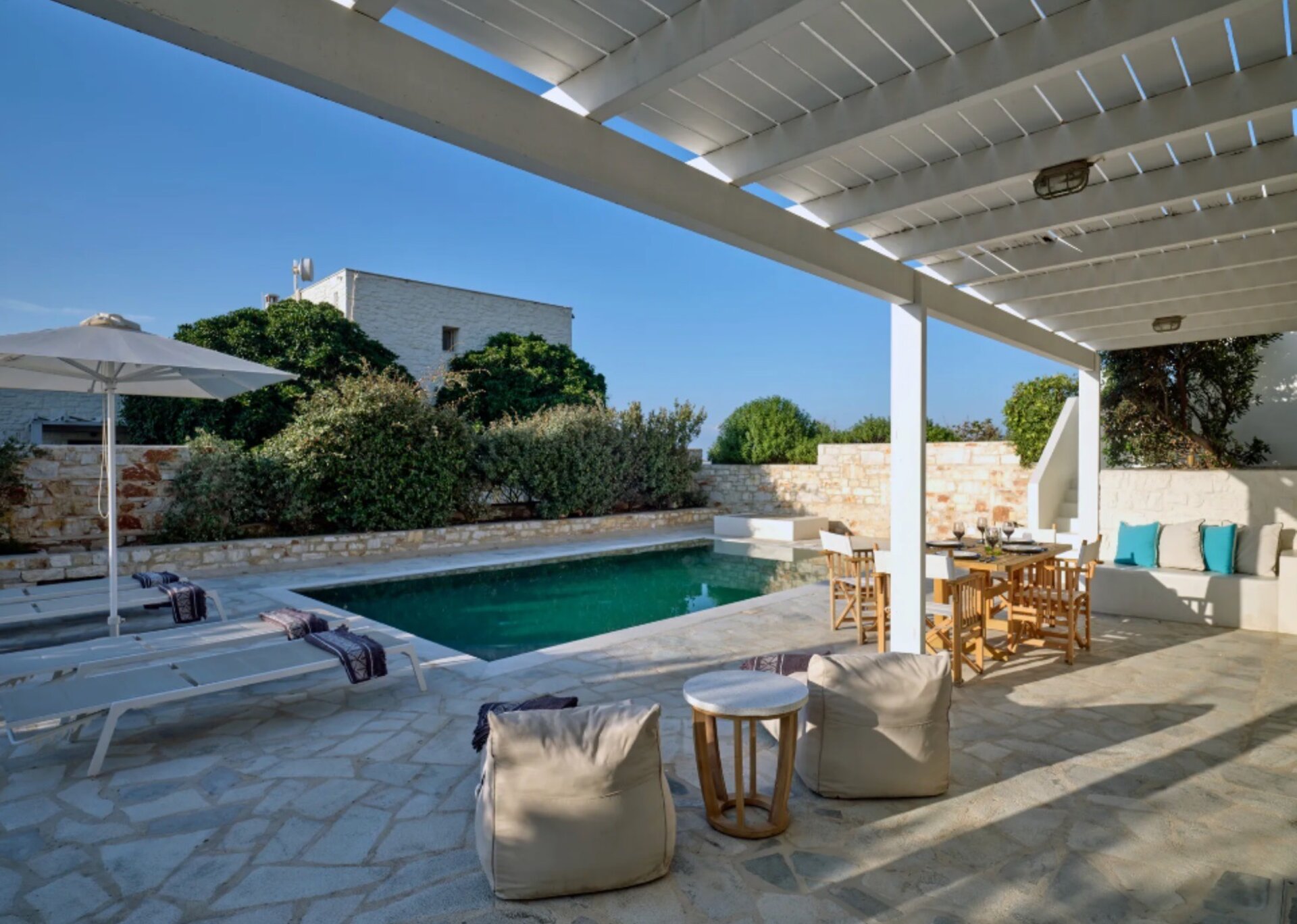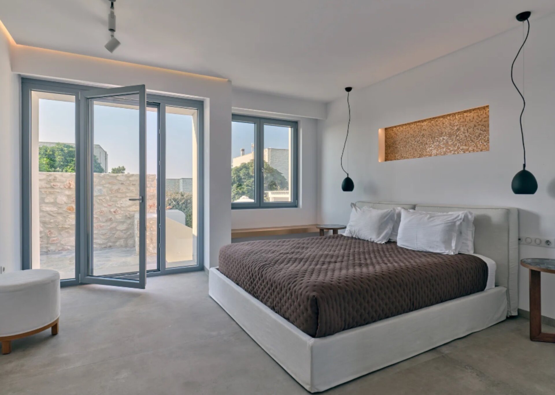 The contemporary Cycladic interior paired with design and pale earth colors are formed to offer the utmost comfort while boasting modern furniture and high-end appliances. Villa Aventus offers 4 master bedrooms and 1 separate guest suite. All are luxuriously appointed with style and glamour, each with high-comfort amenities for optimum relaxation and pampering, ensuring a comfortable stay. All bedrooms are with verandas and balconies, offering sea, pool and garden views. Boasting an expansive outdoors by the poolside with tranquility and mesmerizing sea views, where everything has been noted for guests unforgettable holiday moments. The 120 sq. meters swimming pool surrounded by umbrellas and loungers, enticing guests to swim and to revitalize their senses while enjoying a long day of summer bliss in Paros. The shaded alfresco dining with the long marble table paired with wooden chairs and the BBQ, invites guests for energizing breakfasts and unforgettable dinners by the pool side.