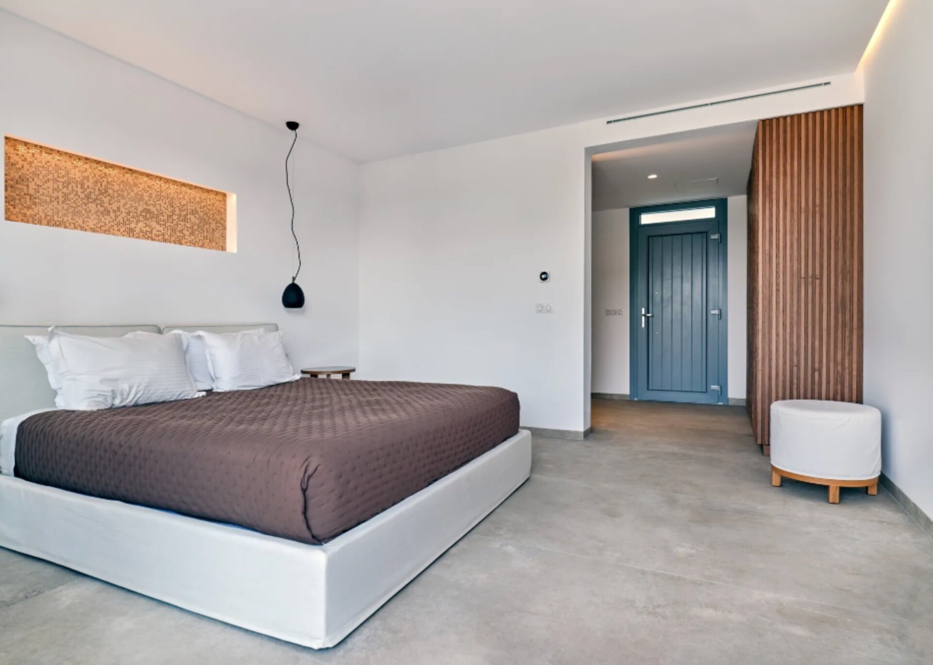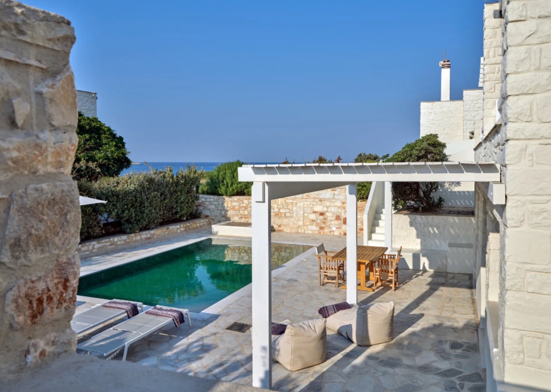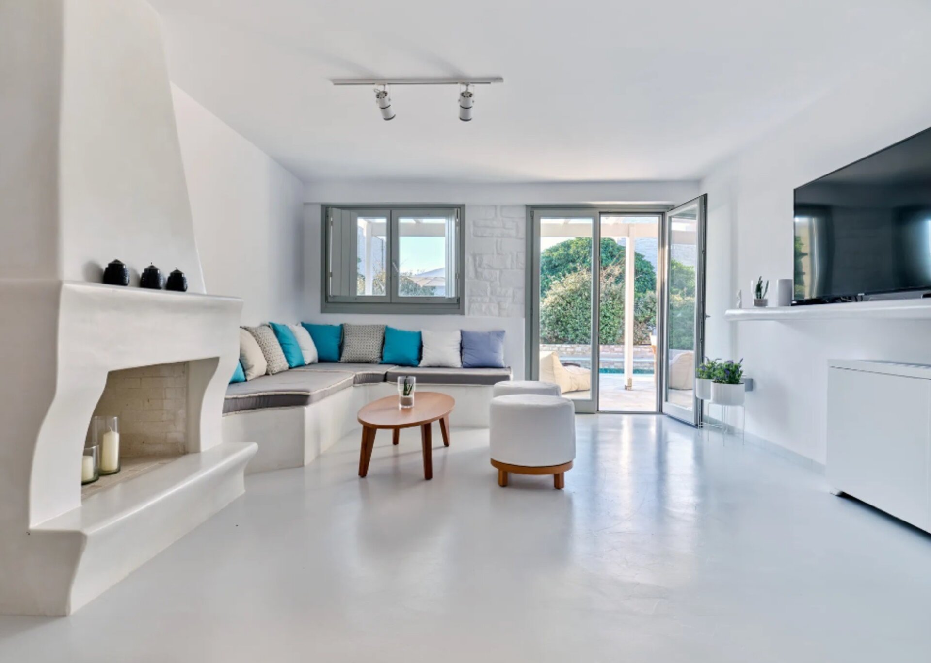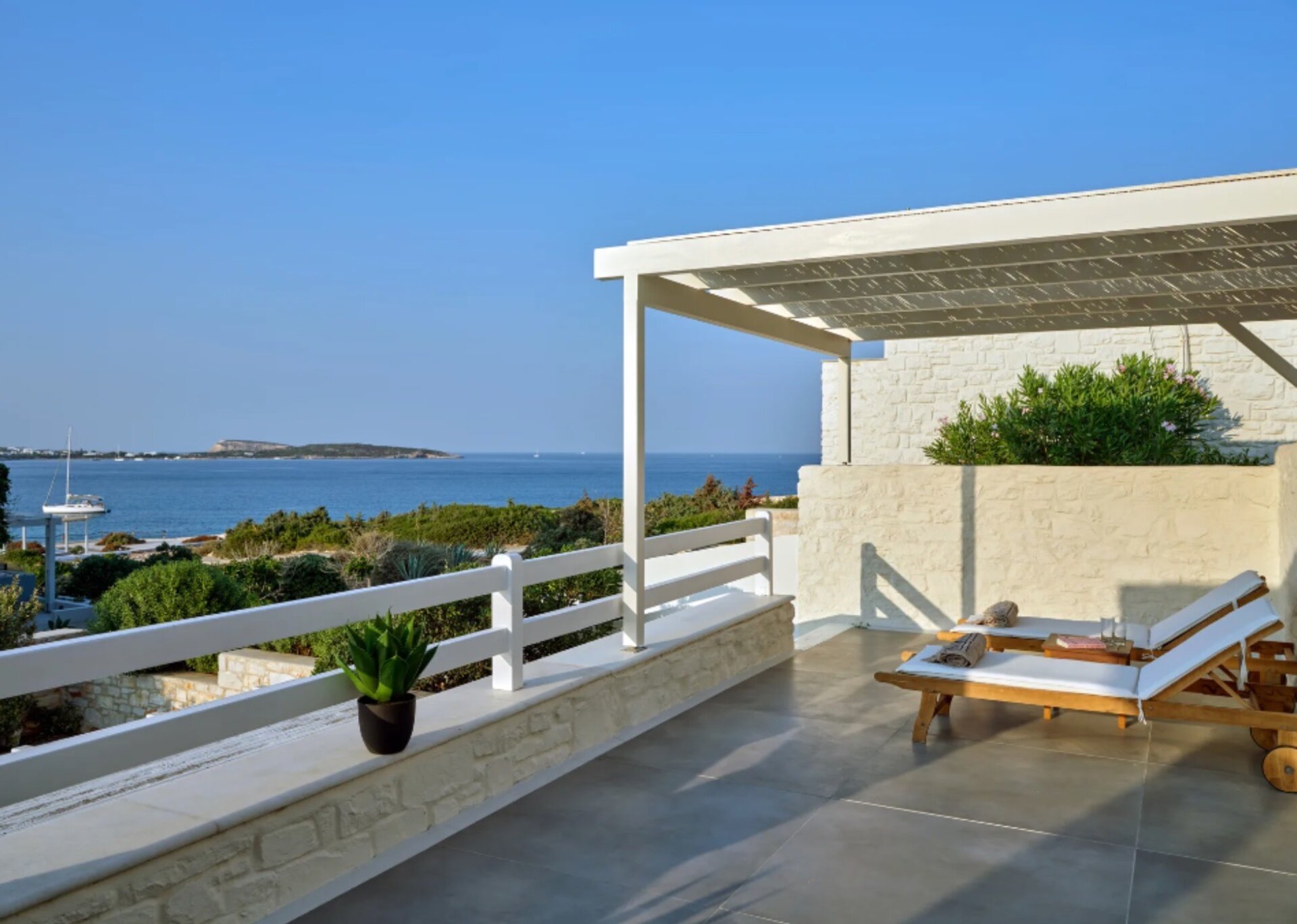The contemporary Cycladic interior paired with design and pale earth colors are formed to offer the utmost comfort while boasting modern furniture and high-end appliances. Villa Aventus offers 4 master bedrooms and 1 separate guest suite. All are luxuriously appointed with style and glamour, each with high-comfort amenities for optimum relaxation and pampering, ensuring a comfortable stay. All bedrooms are with verandas and balconies, offering sea, pool and garden views. Boasting an expansive outdoors by the poolside with tranquility and mesmerizing sea views, where everything has been noted for guests unforgettable holiday moments. The 120 sq. meters swimming pool surrounded by umbrellas and loungers, enticing guests to swim and to revitalize their senses while enjoying a long day of summer bliss in Paros. The shaded alfresco dining with the long marble table paired with wooden chairs and the BBQ, invites guests for energizing breakfasts and unforgettable dinners by the pool side.