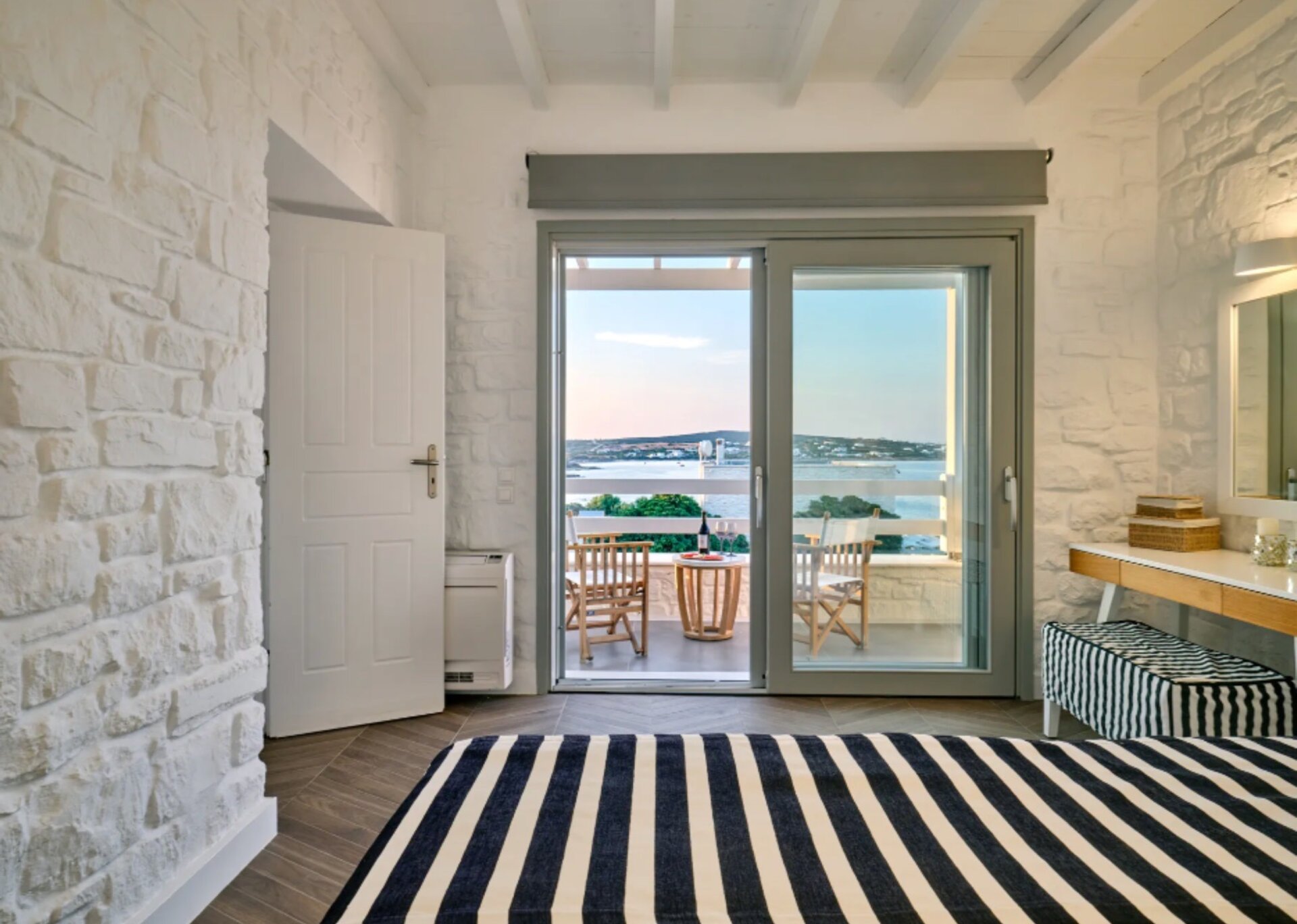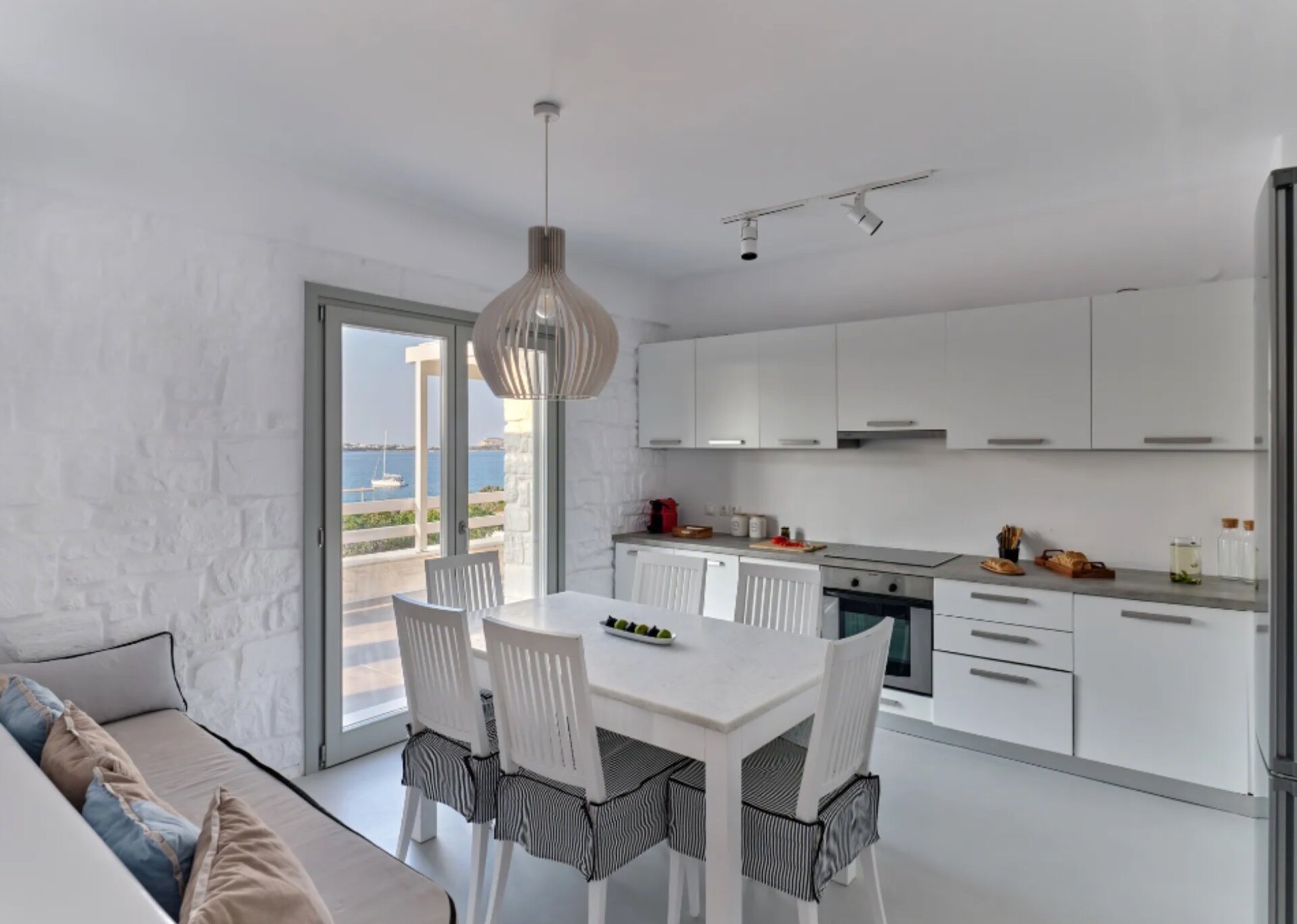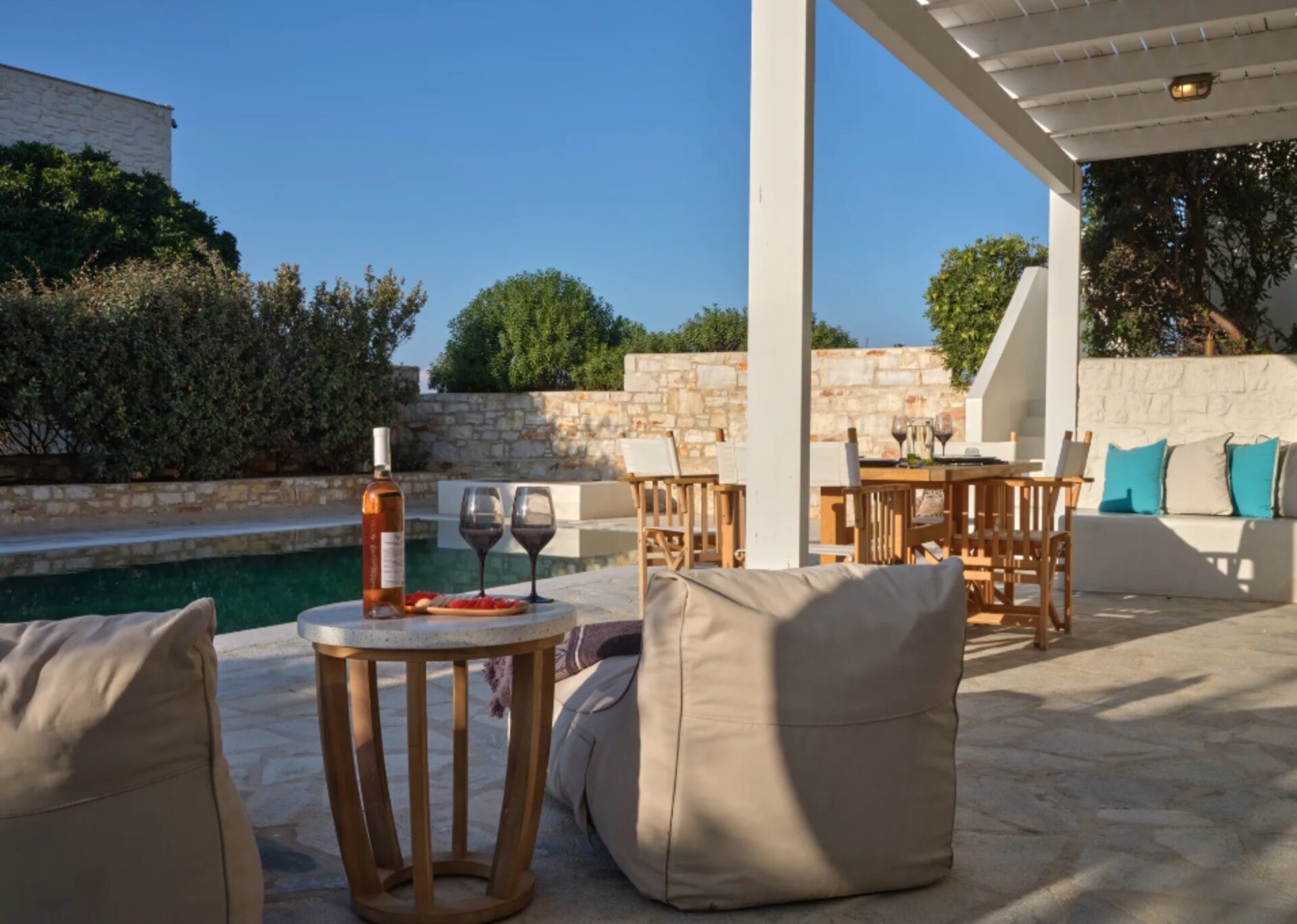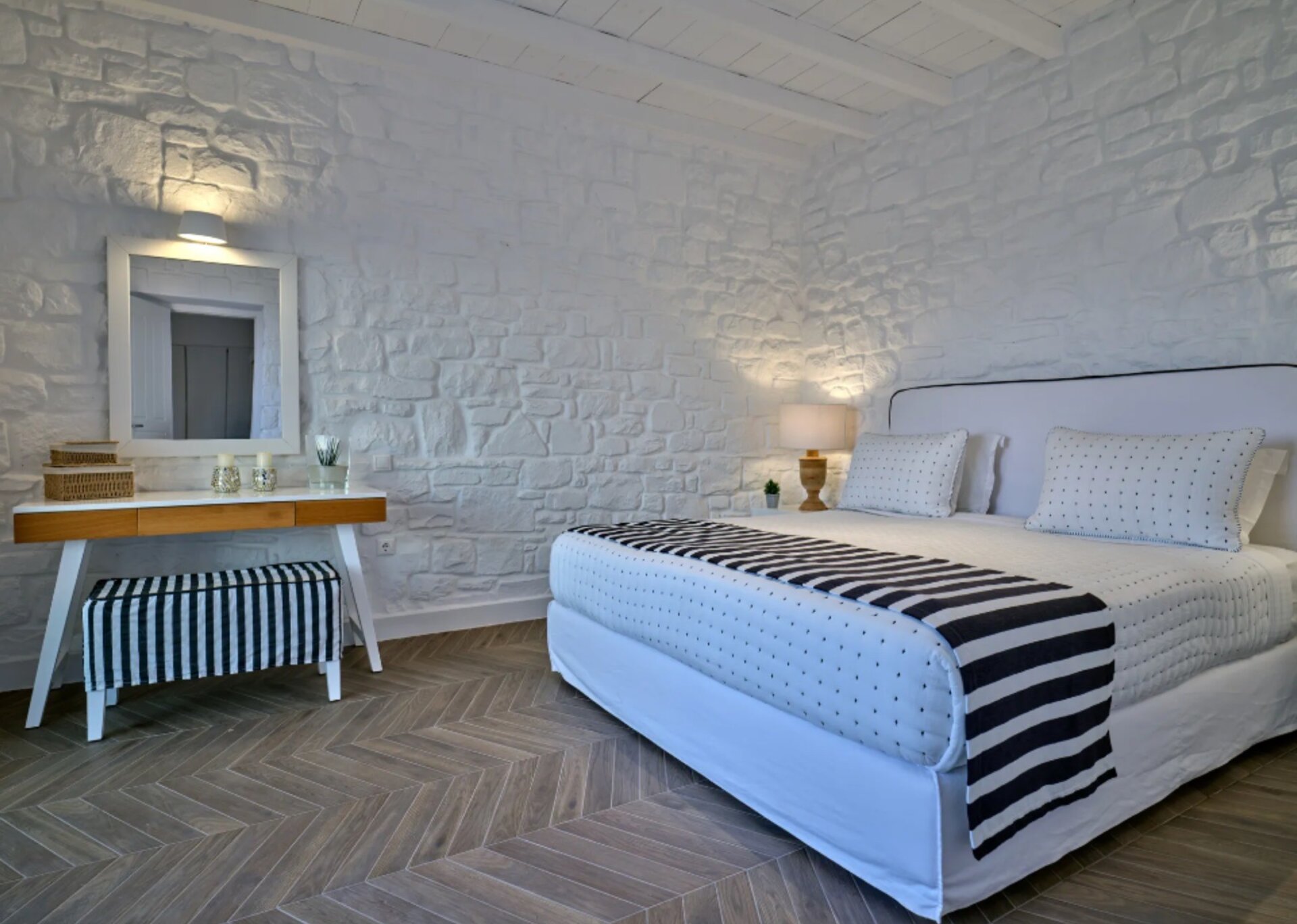 The contemporary Cycladic interior paired with design and pale earth colors are formed to offer the utmost comfort while boasting modern furniture and high-end appliances. Villa Aventus offers 4 master bedrooms and 1 separate guest suite. All are luxuriously appointed with style and glamour, each with high-comfort amenities for optimum relaxation and pampering, ensuring a comfortable stay. All bedrooms are with verandas and balconies, offering sea, pool and garden views. Boasting an expansive outdoors by the poolside with tranquility and mesmerizing sea views, where everything has been noted for guests unforgettable holiday moments. The 120 sq. meters swimming pool surrounded by umbrellas and loungers, enticing guests to swim and to revitalize their senses while enjoying a long day of summer bliss in Paros. The shaded alfresco dining with the long marble table paired with wooden chairs and the BBQ, invites guests for energizing breakfasts and unforgettable dinners by the pool side.