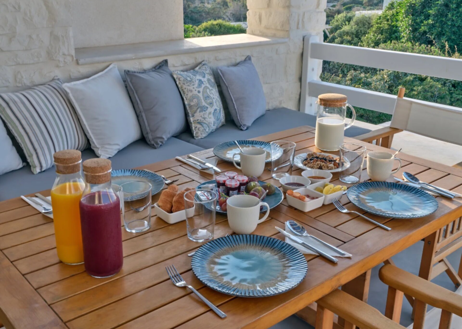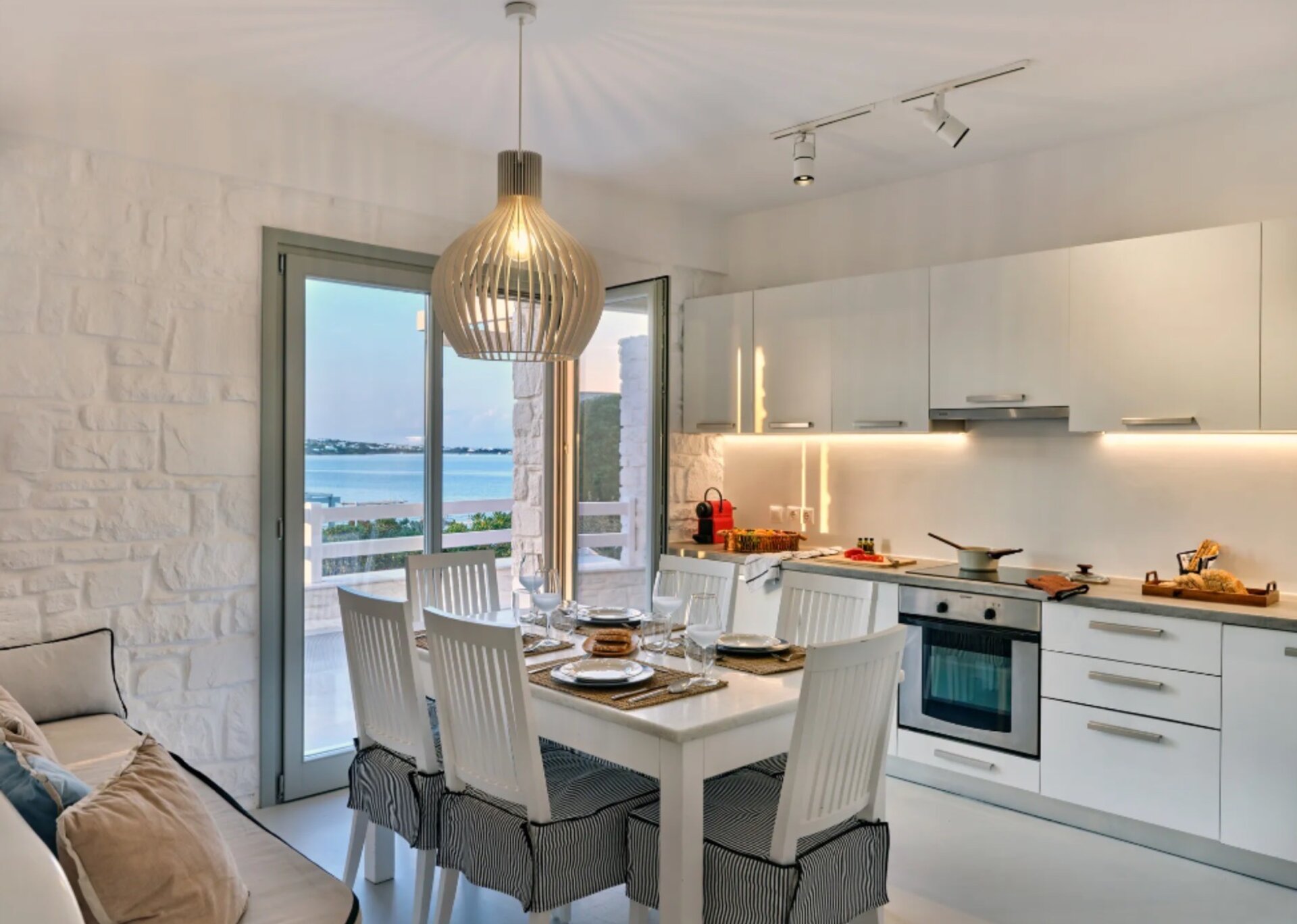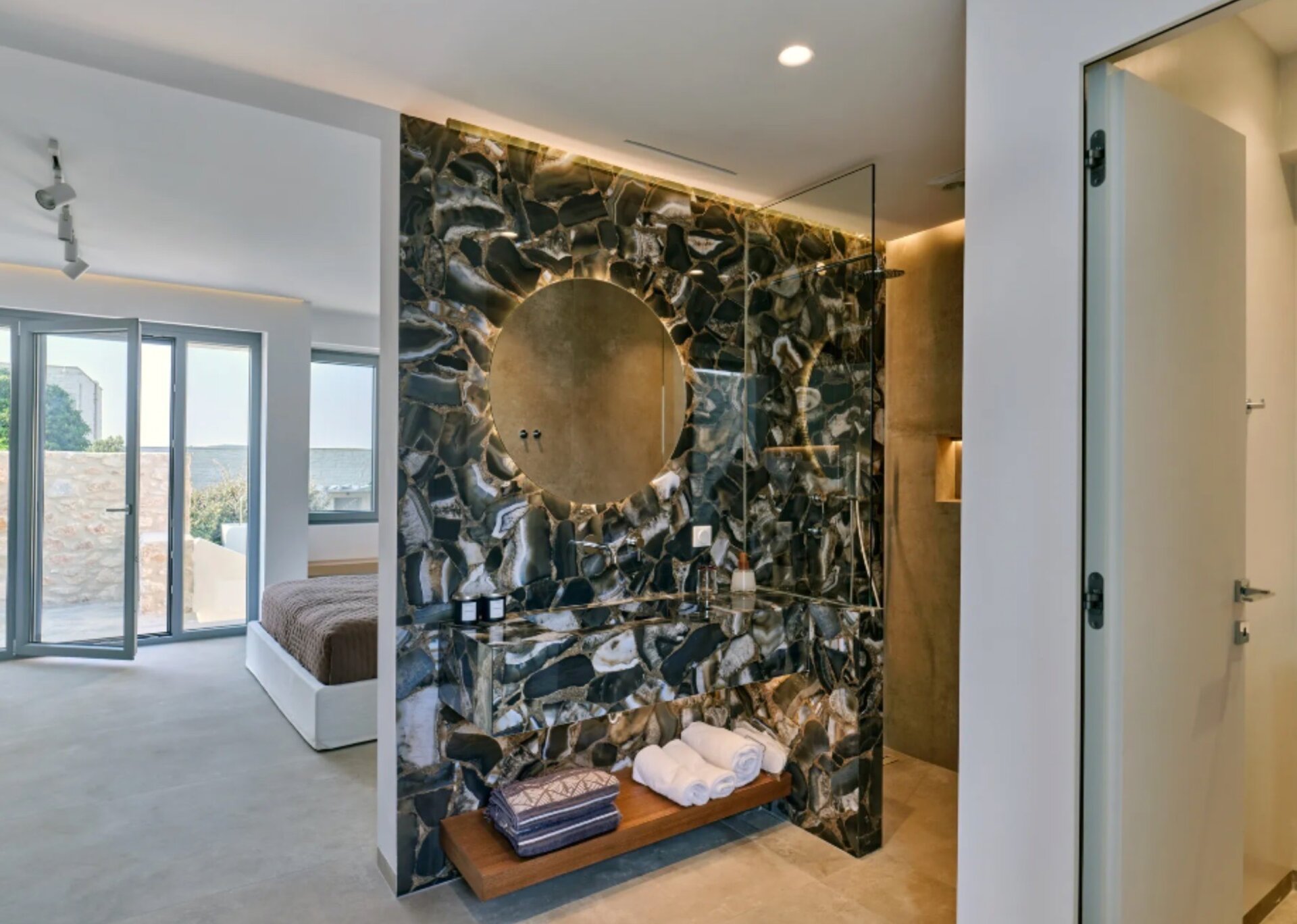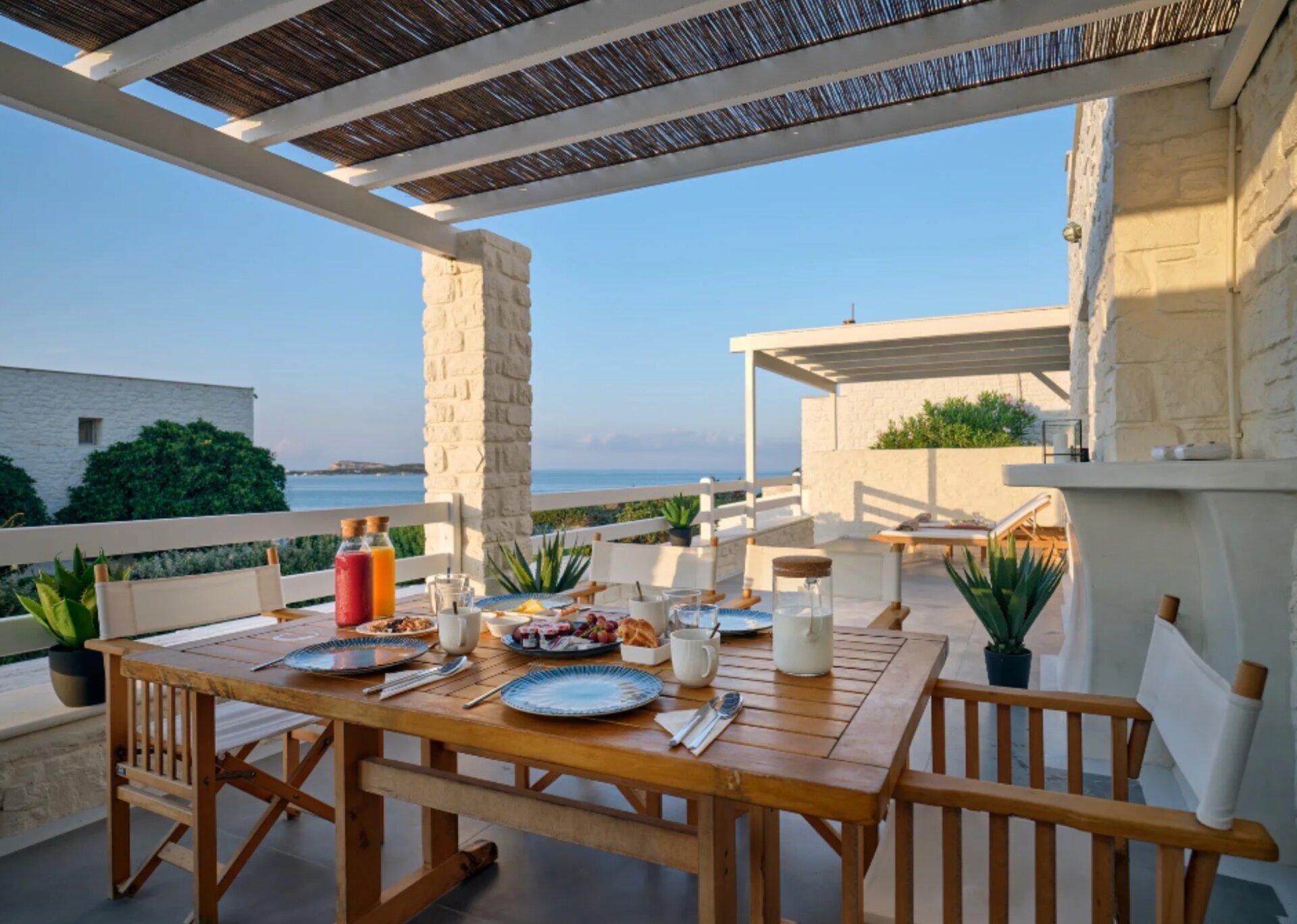 The contemporary Cycladic interior paired with design and pale earth colors are formed to offer the utmost comfort while boasting modern furniture and high-end appliances. Villa Aventus offers 4 master bedrooms and 1 separate guest suite. All are luxuriously appointed with style and glamour, each with high-comfort amenities for optimum relaxation and pampering, ensuring a comfortable stay. All bedrooms are with verandas and balconies, offering sea, pool and garden views. Boasting an expansive outdoors by the poolside with tranquility and mesmerizing sea views, where everything has been noted for guests unforgettable holiday moments. The 120 sq. meters swimming pool surrounded by umbrellas and loungers, enticing guests to swim and to revitalize their senses while enjoying a long day of summer bliss in Paros. The shaded alfresco dining with the long marble table paired with wooden chairs and the BBQ, invites guests for energizing breakfasts and unforgettable dinners by the pool side.