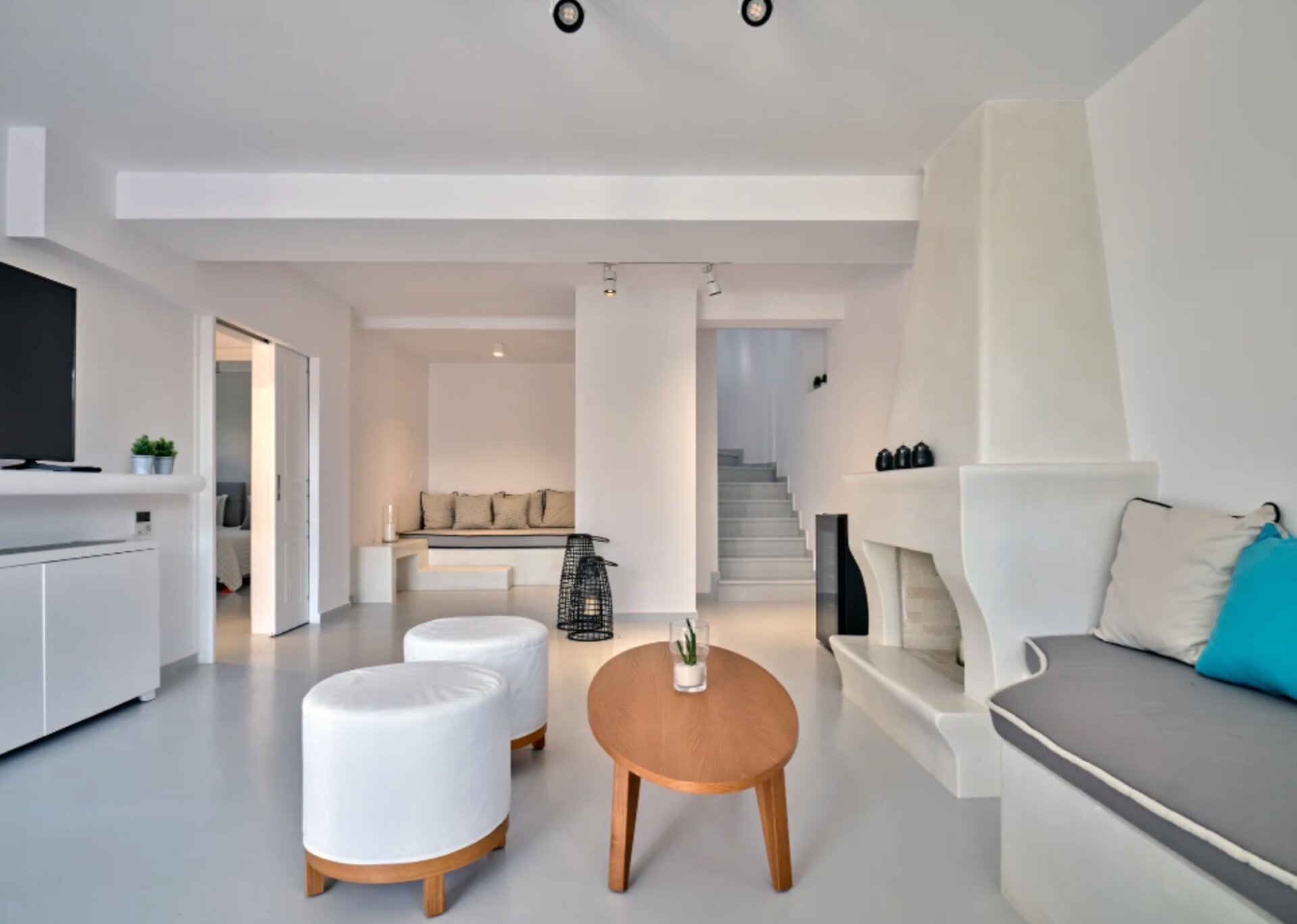 Villa Ambassador is allocating in 3 levels. On entering level, it features the foyer and the comfy living furnished with white low sofas to chill out during your stay. Opposite, is a white fully equipped kitchen connecting directly to the spacious dining offering stunning views to Santa Maria and Naxos. Top design furniture including sofas, armchairs, tables and modern wooden & metal pieces, create a vibrant relaxing atmosphere, while as for home comforts; this villa provides almost everything to make a summer vacation an unforgettable memory.