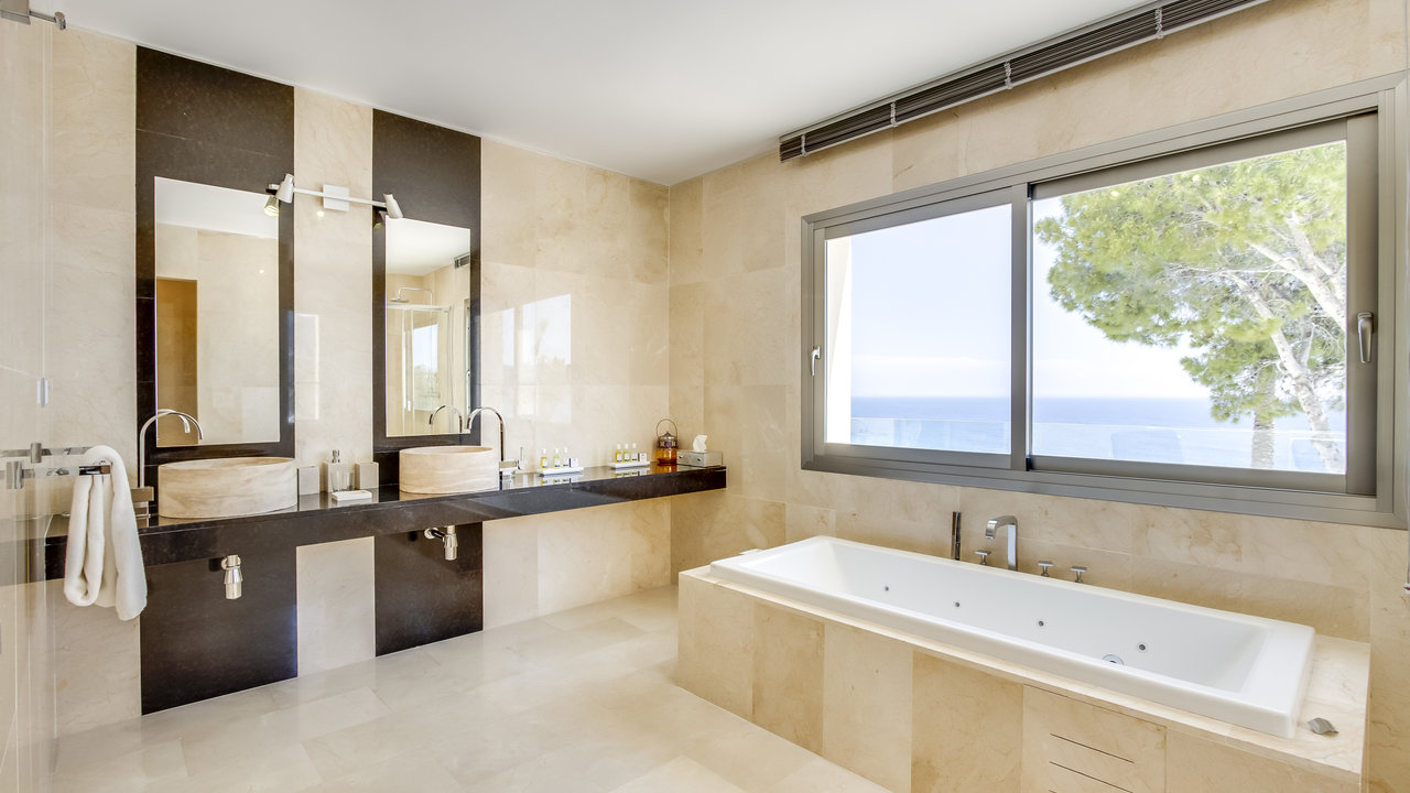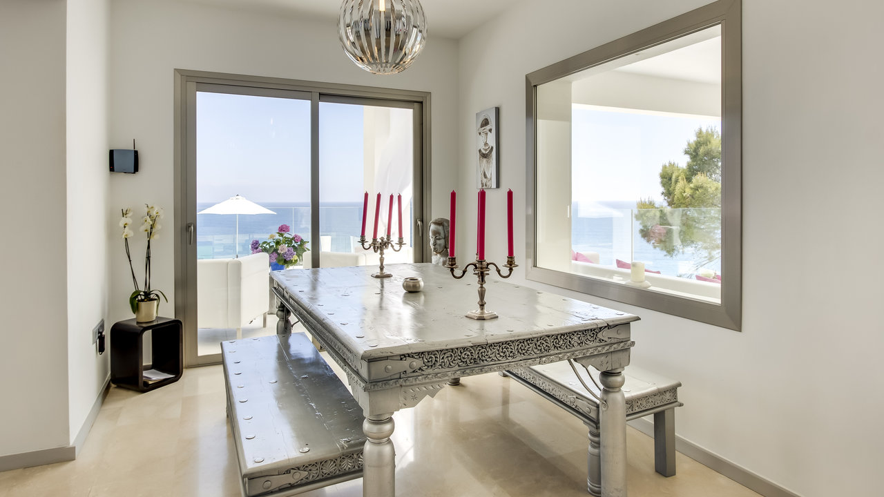 It offers direct sea access via a dock on the rocks just below the premises. The luxurious property’s outdoor spaces encompass a wide terraced area with spacious dining and seating lounges and an infinity pool with amazing views of Formentera island.
