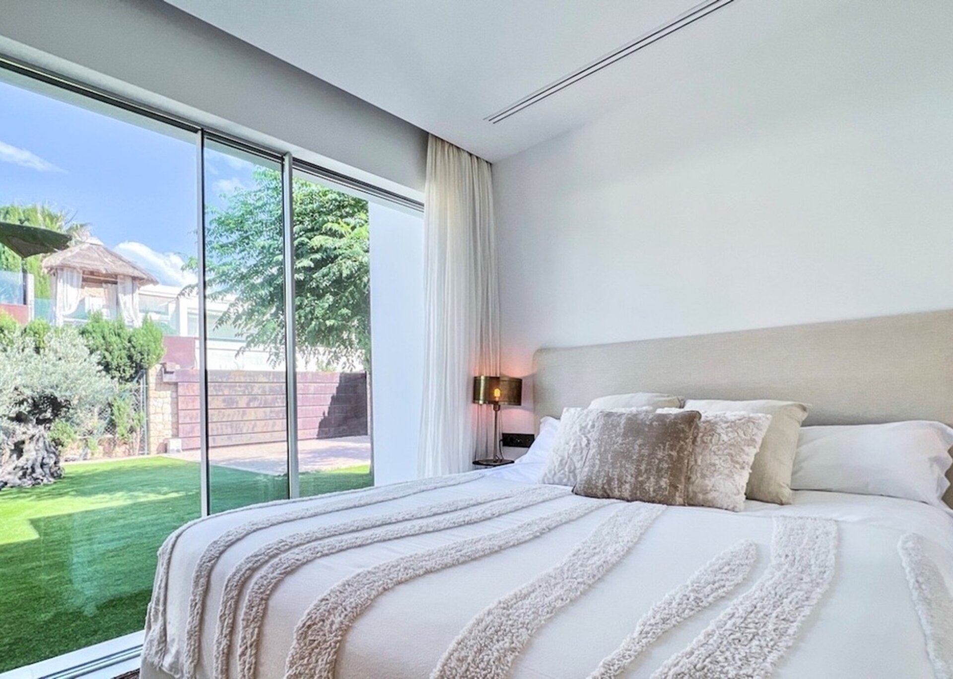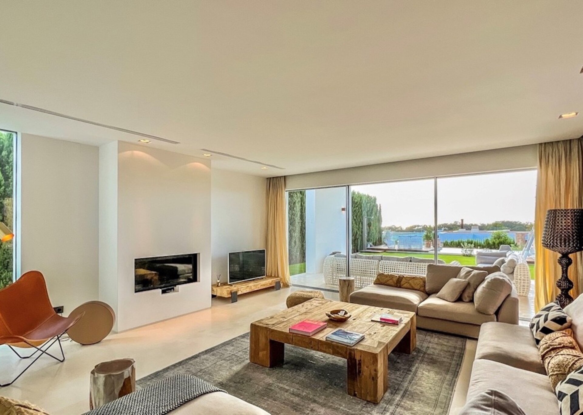 This magnificent property has been meticulously designed to provide utmost comfort and luxury. Every corner of this effortlessly elegant villa is adorned with tasteful furnishings, captivating artworks, and exquisite decorations. The bright and spacious living room features a bespoke fireplace, while the dining room seamlessly connects to the open plan kitchen, complete with state-of-the-art appliances.