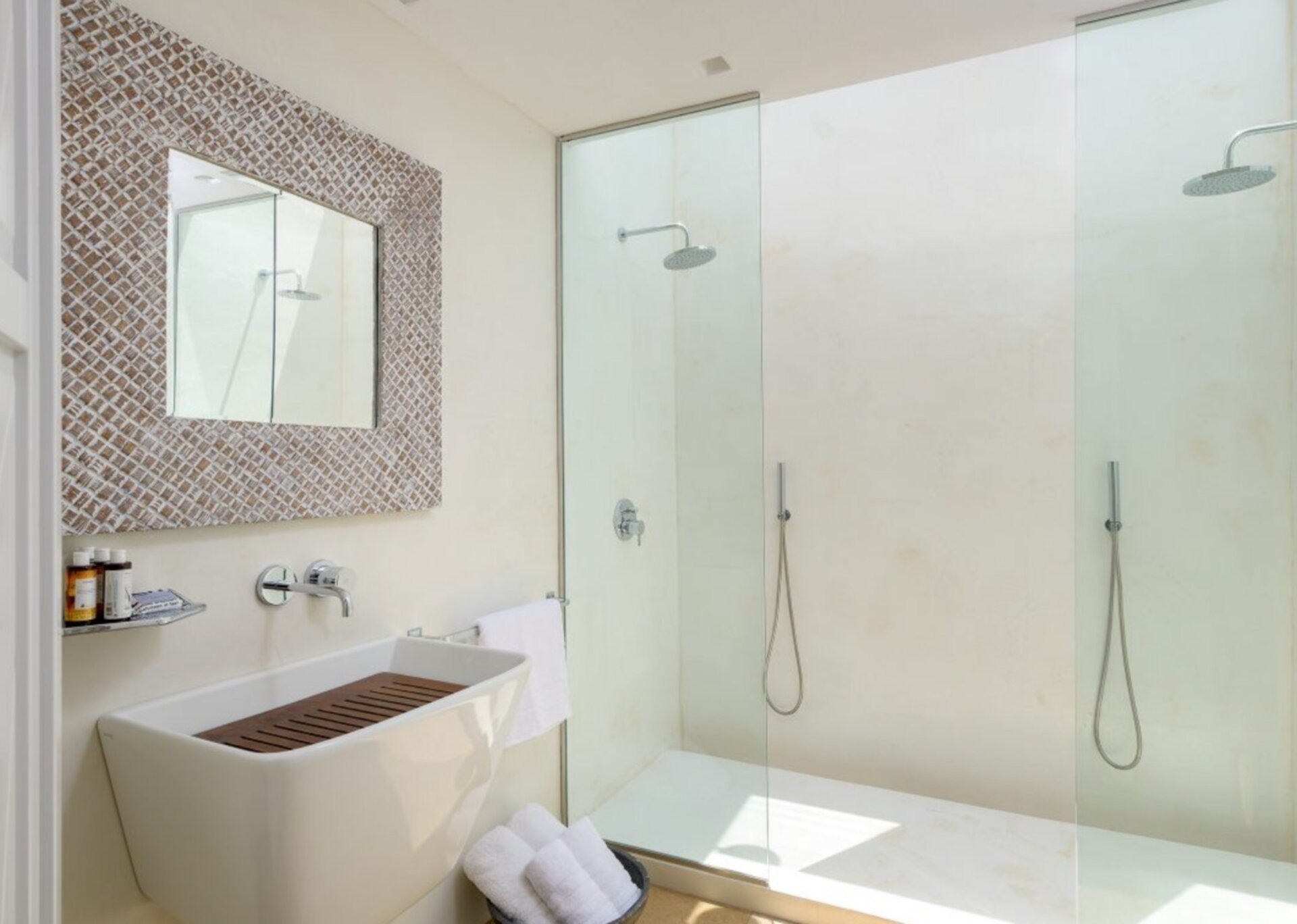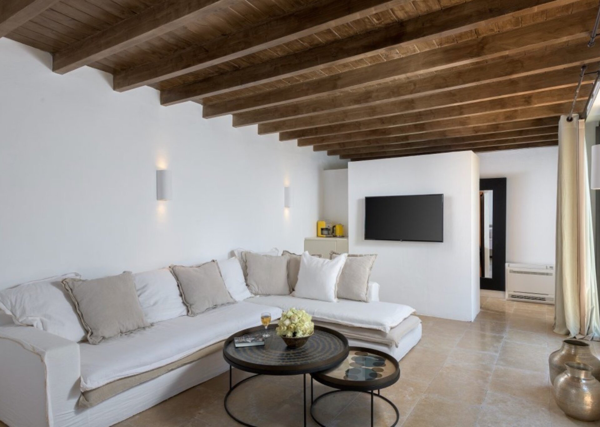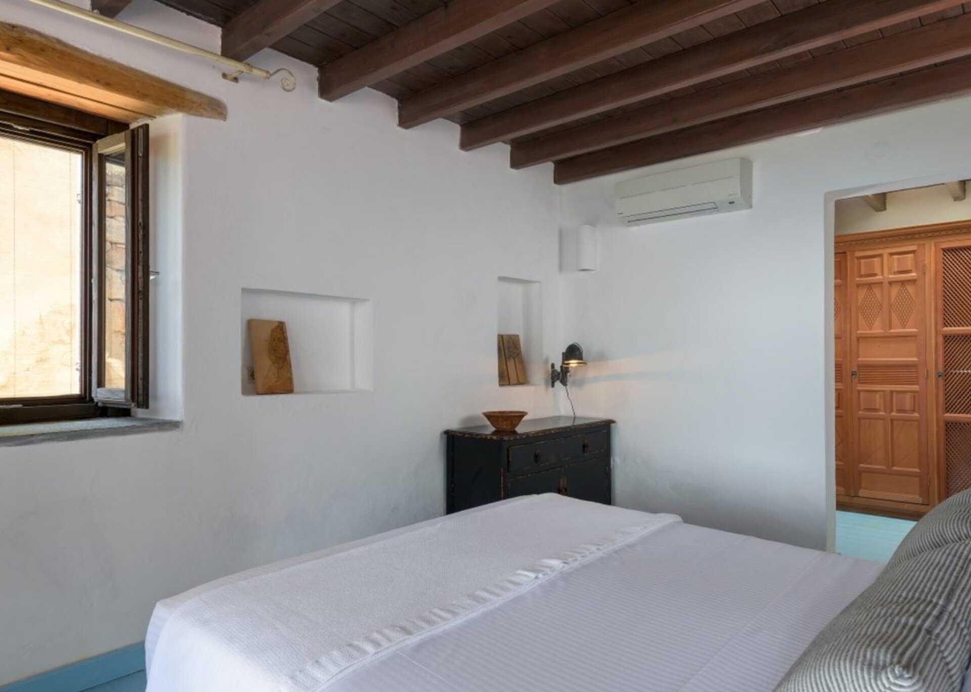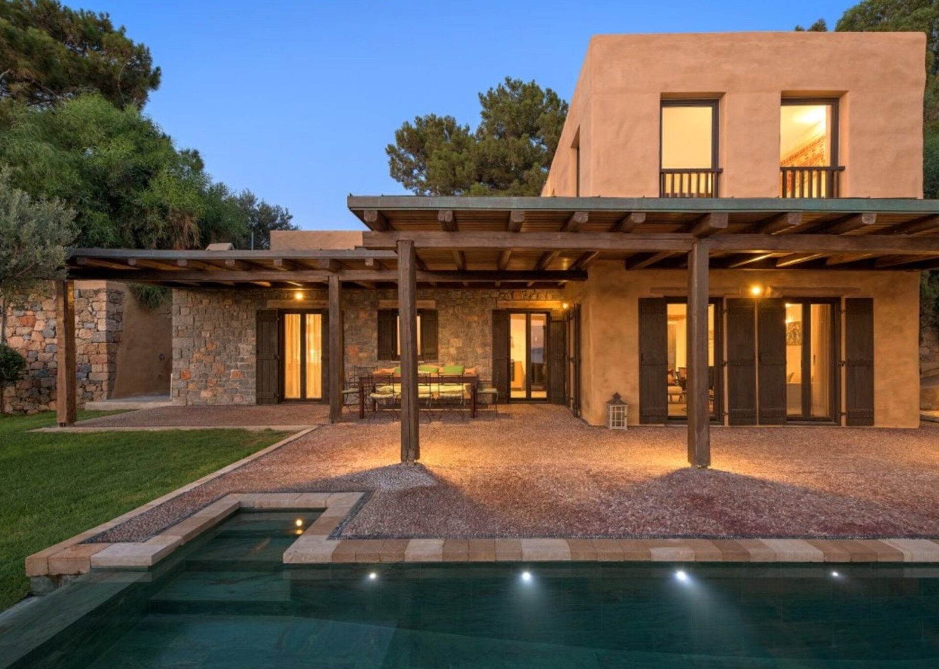 The interior surfaces have been artfully coated and painted with aged limewash. Local shale stone adorns the floors, while aged white marble, reminiscent of mosaic stones, graces the bathroom walls. The outdoor yard is covered with pebbles, adding to its rustic charm. The flat roof presents a remarkable sight with trusses and wooden planks creating beautiful gaps between them. The indoor lighting, with adjustable settings, creates a warm ambiance reminiscent of candlelight.