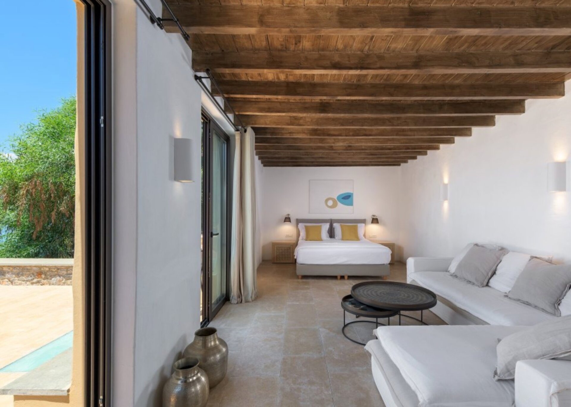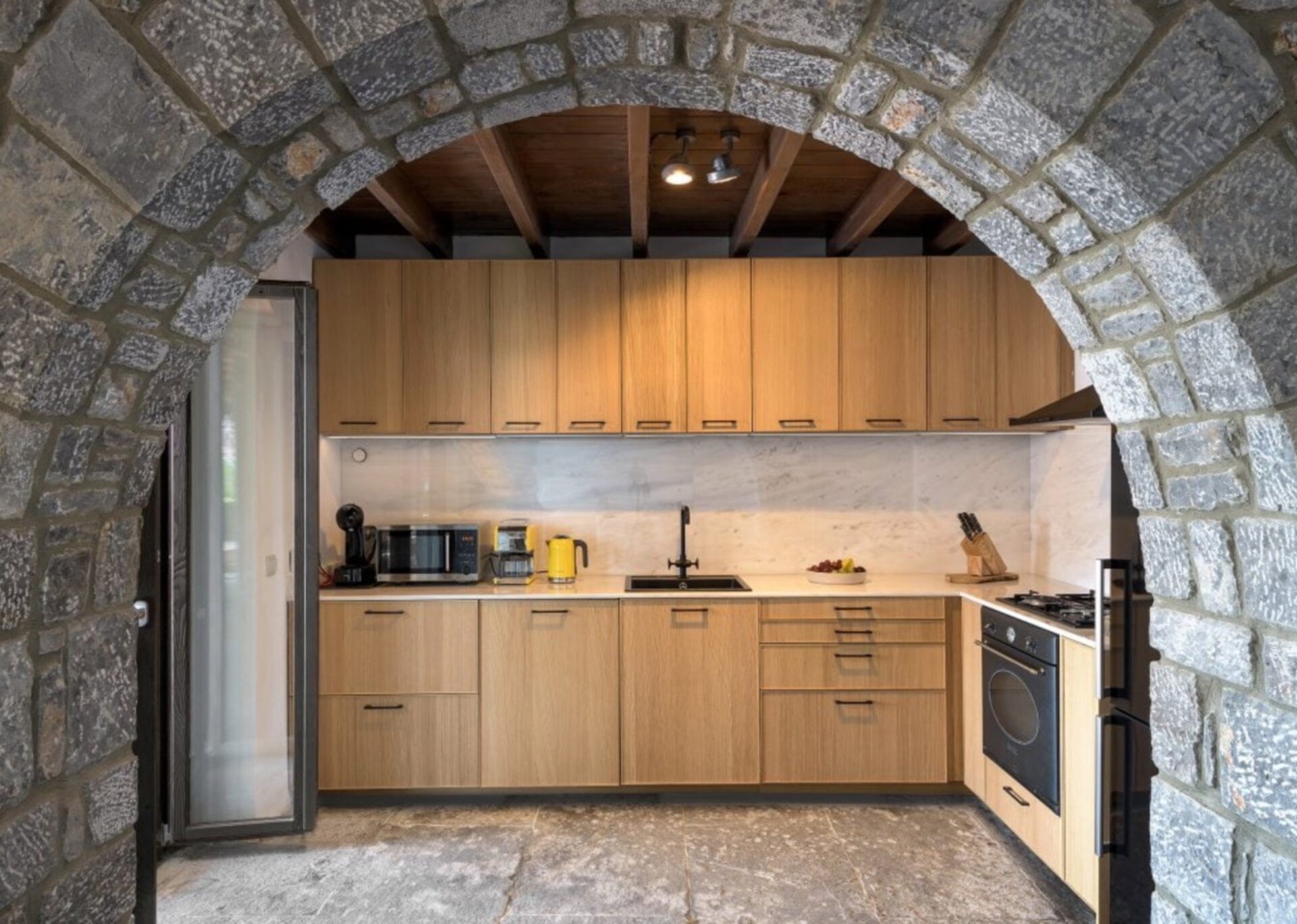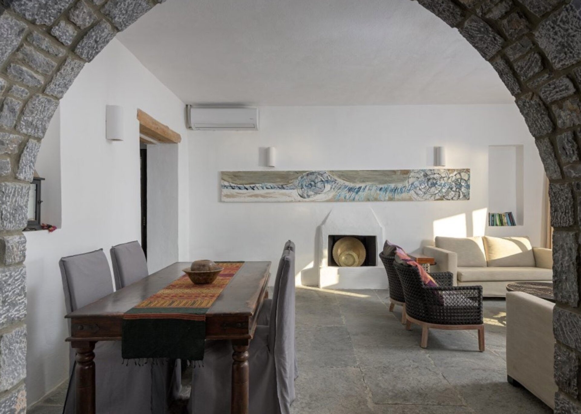 Skylights elegantly connect different areas, creating a delightful interplay of light between rooms. The exterior of the building blends harmoniously with the natural terrain, drawing inspiration from the rustic charm of the area's traditional farmhouses. The use of uncoated local stone (atsakopetra) and coated surfaces using lava and lime adds to its appeal.