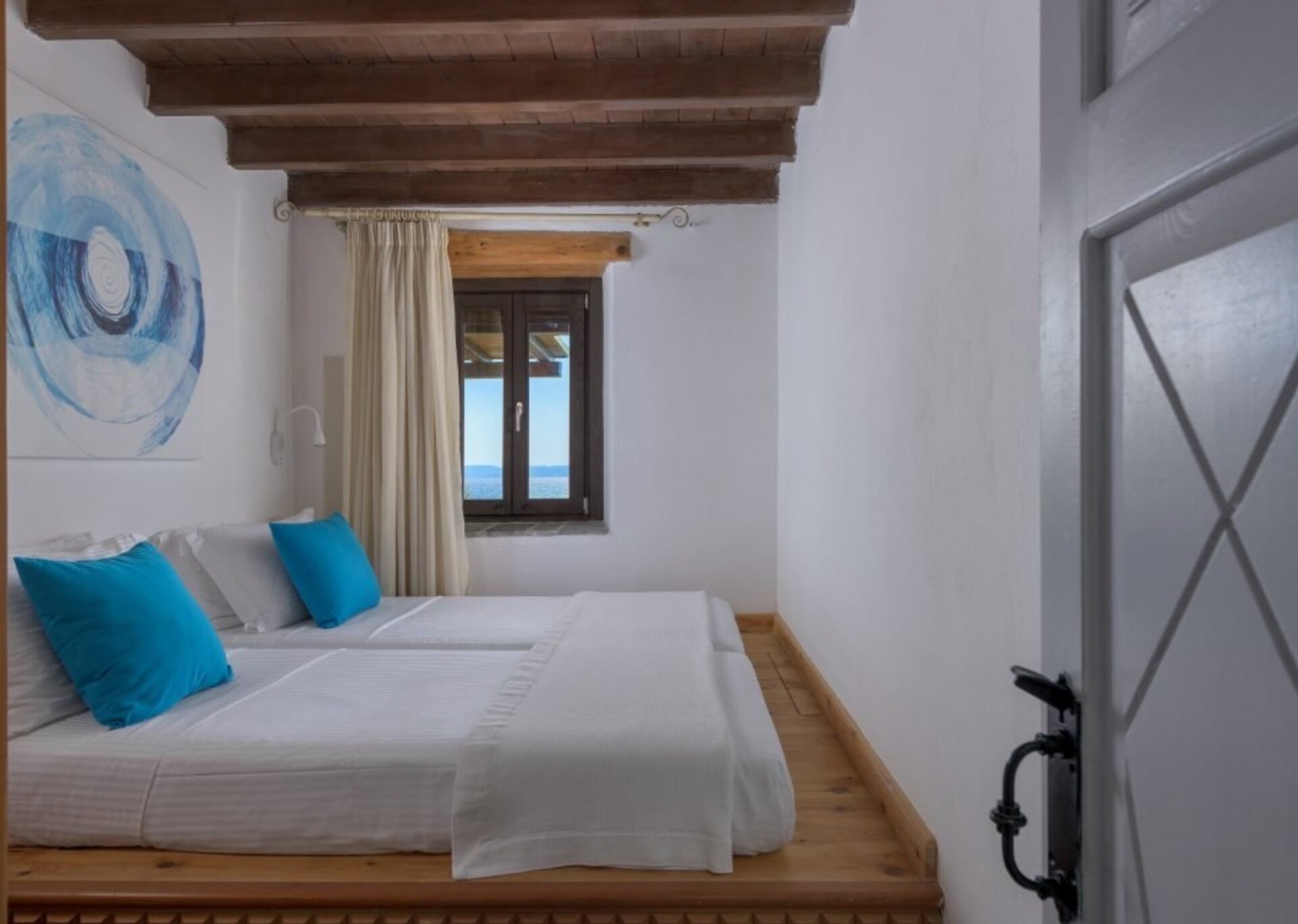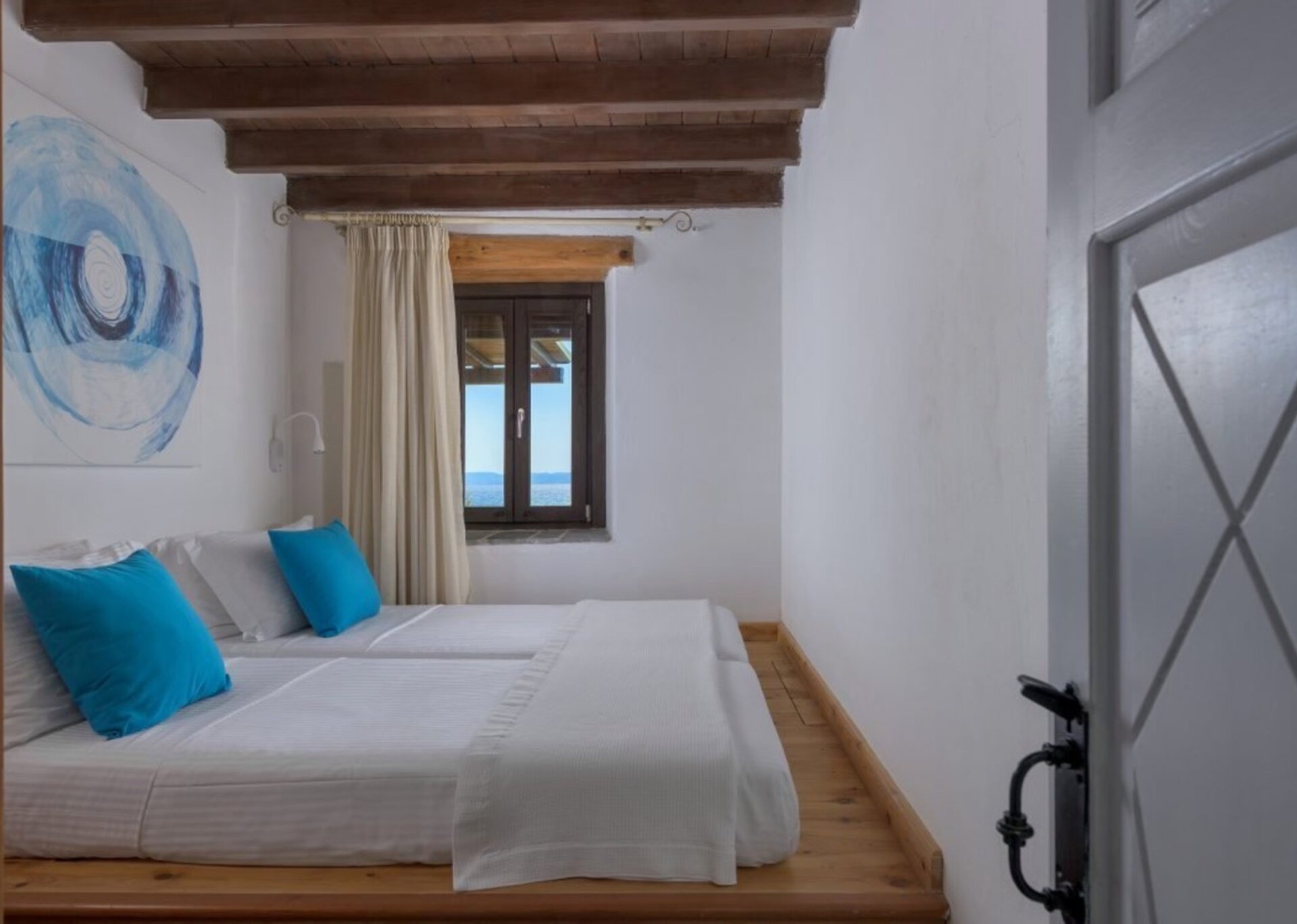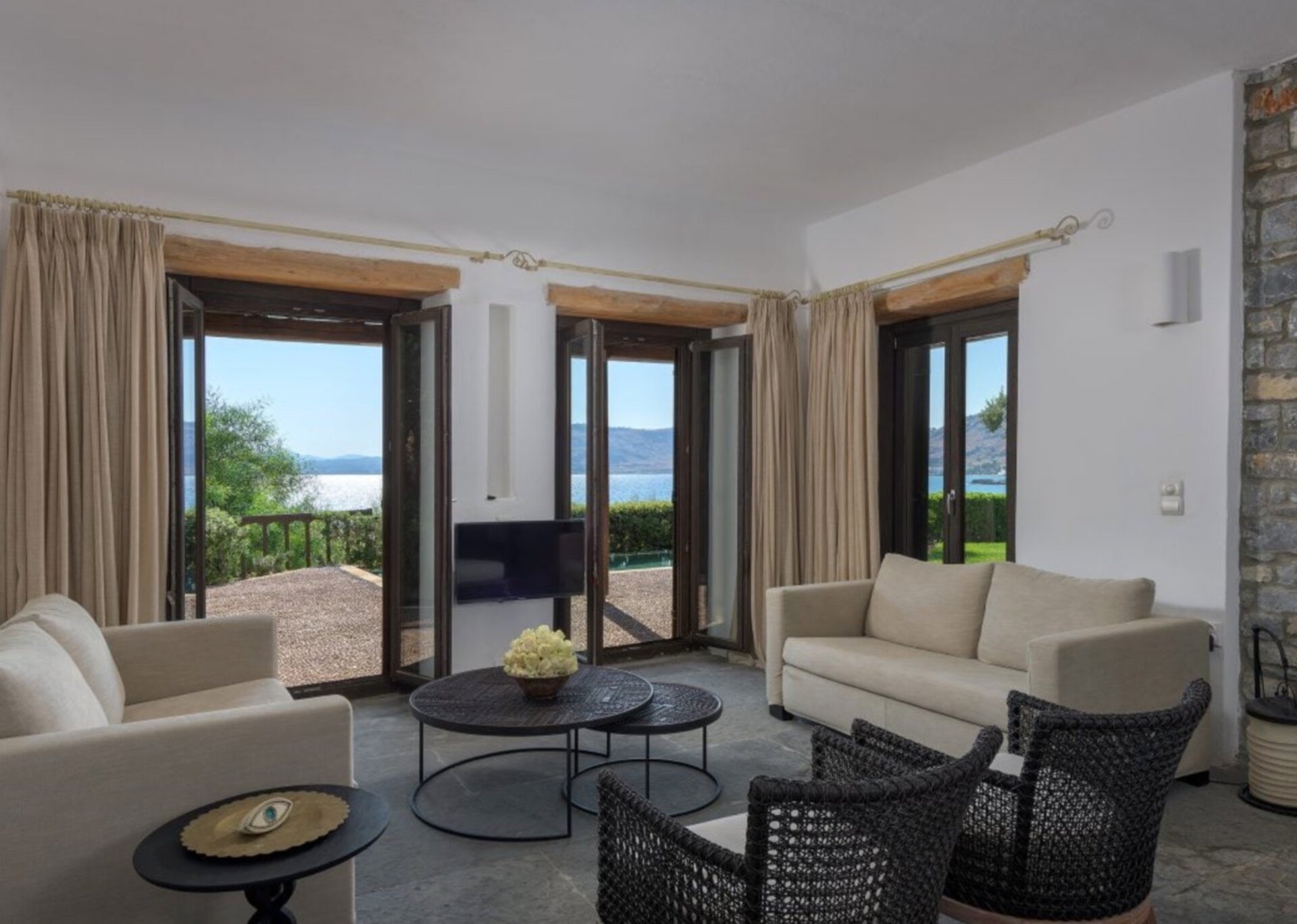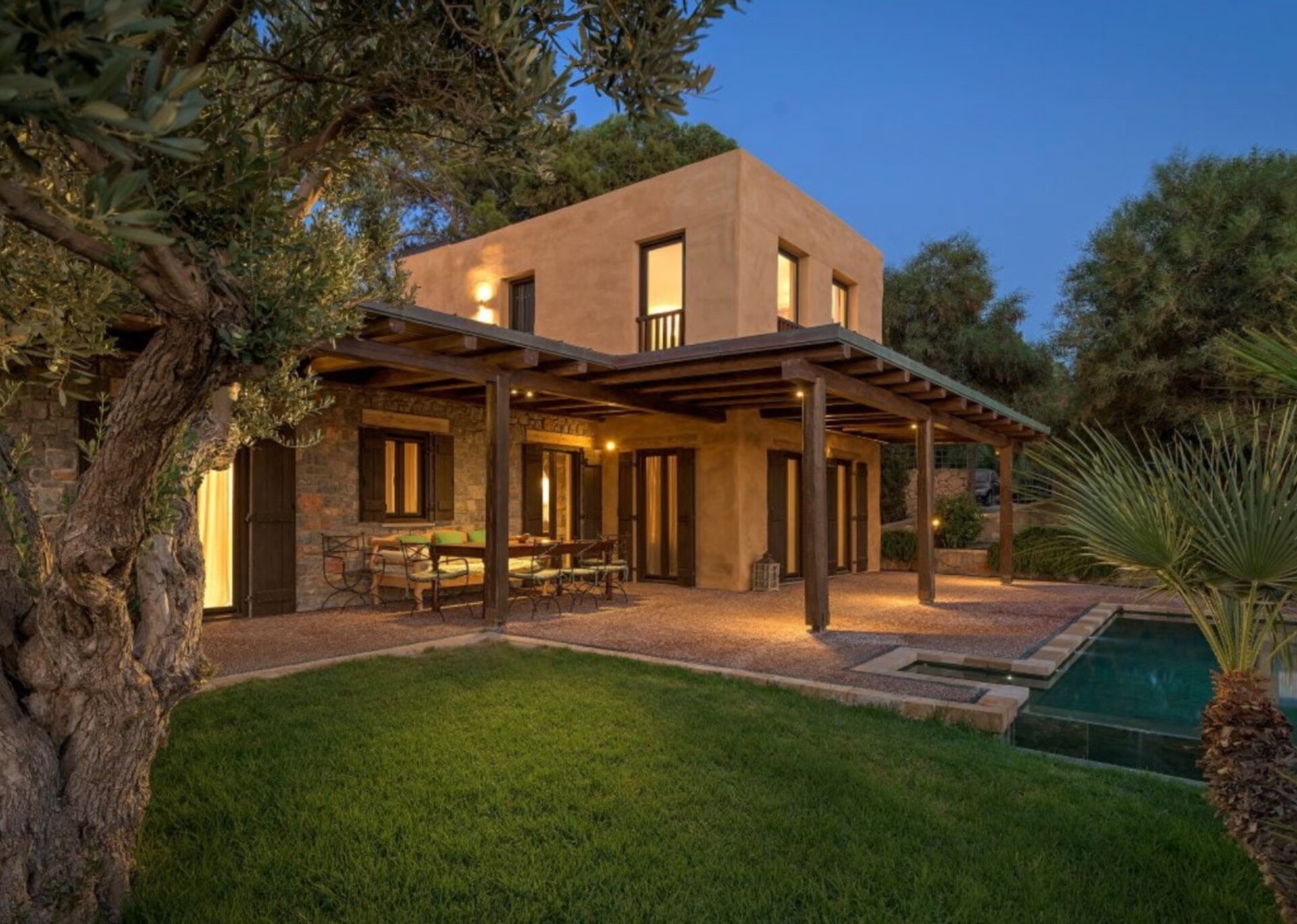 Skylights elegantly connect different areas, creating a delightful interplay of light between rooms. The exterior of the building blends harmoniously with the natural terrain, drawing inspiration from the rustic charm of the area's traditional farmhouses. The use of uncoated local stone (atsakopetra) and coated surfaces using lava and lime adds to its appeal.