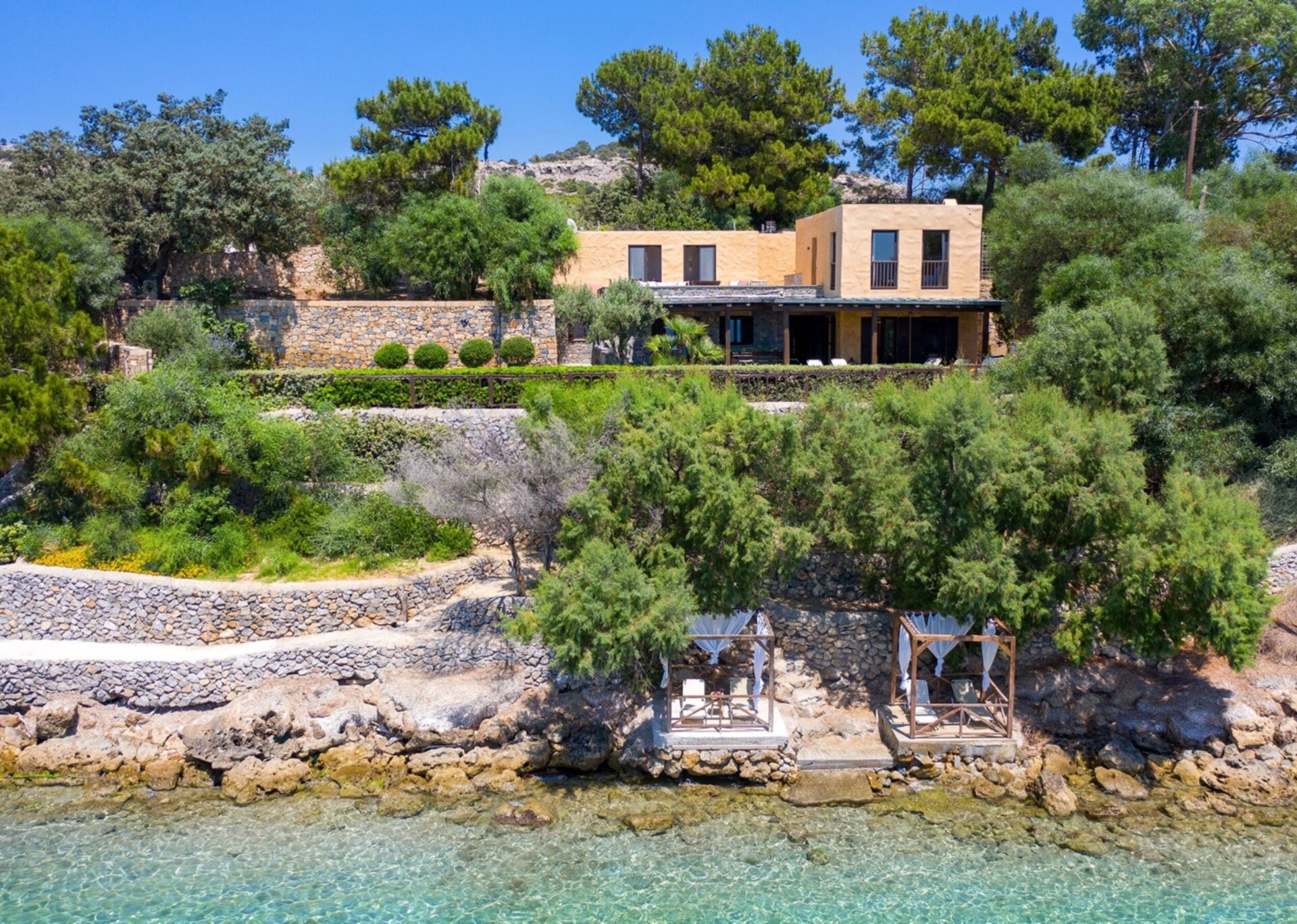 Villa Bante is located on the eastern side of the island in the Pefki area of the Lindos community. Situated just 12 meters above sea level, the plot extends from the western edge, meeting the sea directly. The slopes embrace the natural landscape, defining the boundaries of the property. The unique terrain, along with the long and narrow shape of the land, guided the linear design, offering a breathtaking view.