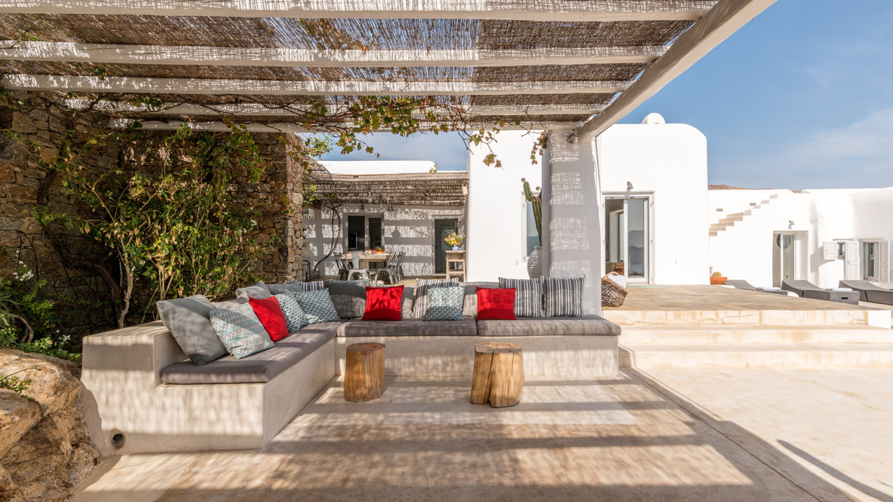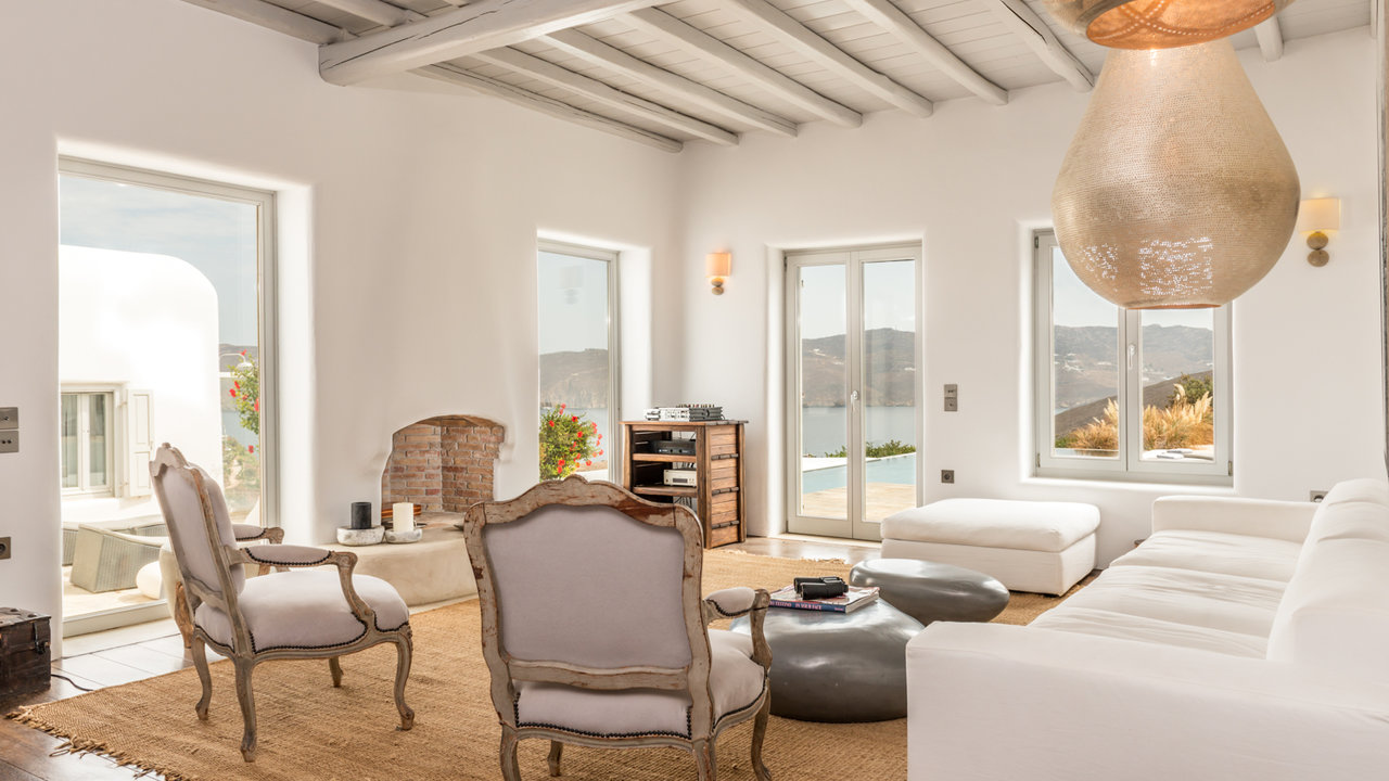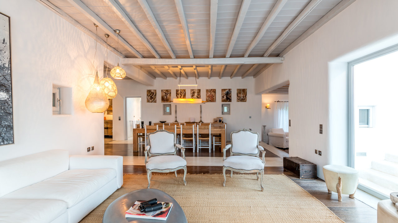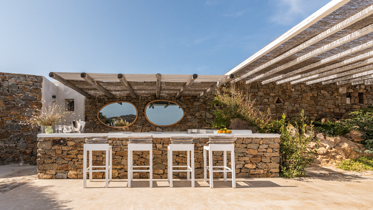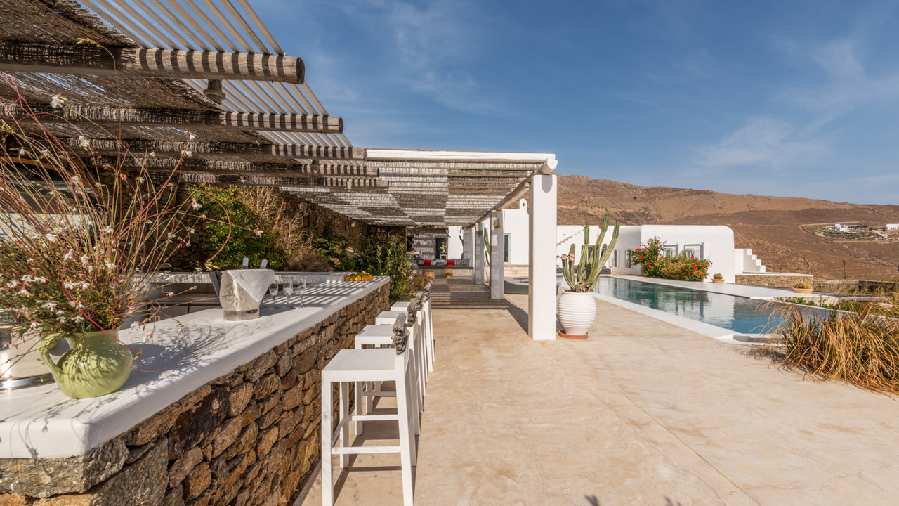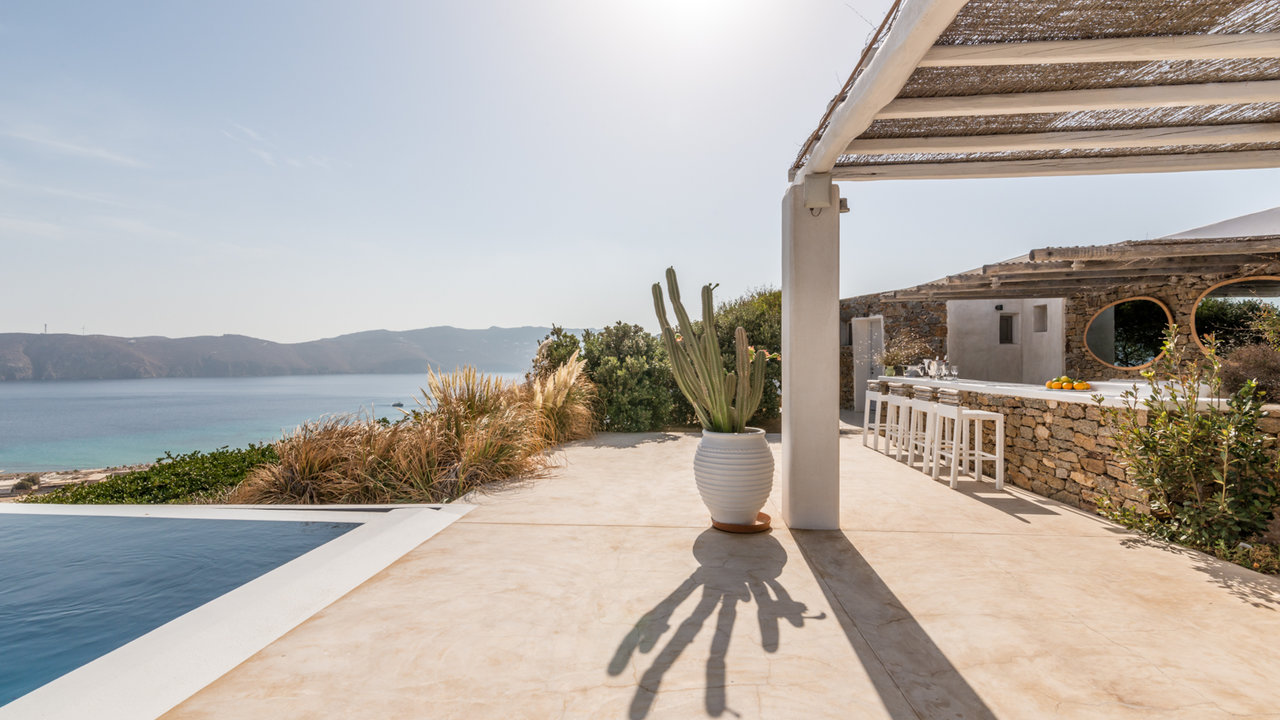Ideally located in Panormos in Mykonos, villa Bellezza is definitely one of the most luxurious destinations in Cyclades. Highlighted by its astonishing sea vistas, its Mykonian ambience and its traditional architecture, villa Bellezza has astounding outer terraces where a private swimming pool with sunbeds are situated to relax and admire the immense sunset views, an outer bar and lounging area where you can capture the luxurious vibe Belezza provides while listening to your favorite playlists from the indoor and outdoor surround sound system and an outer dining area to enjoy an Al-Fresco dinner with your family and friends.