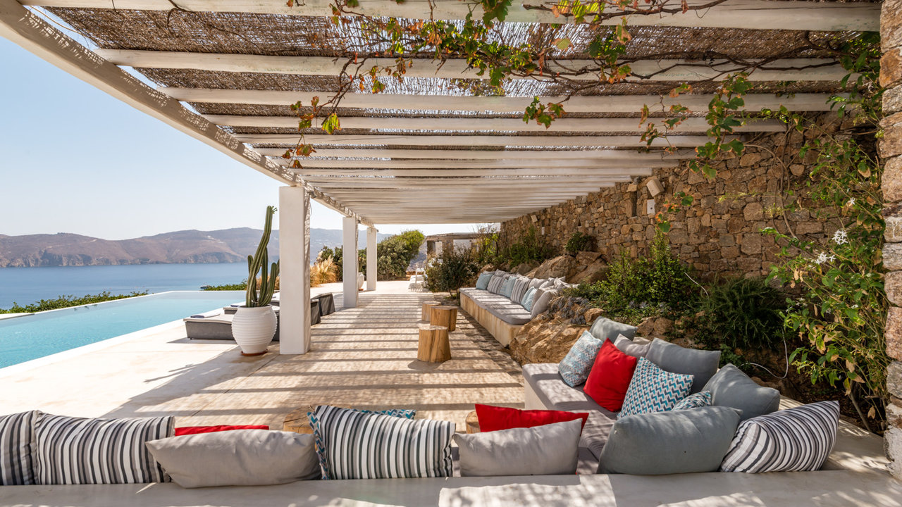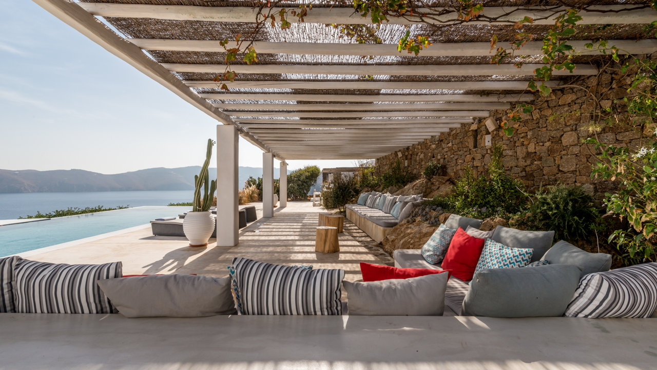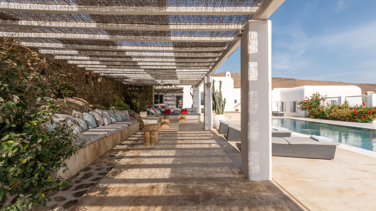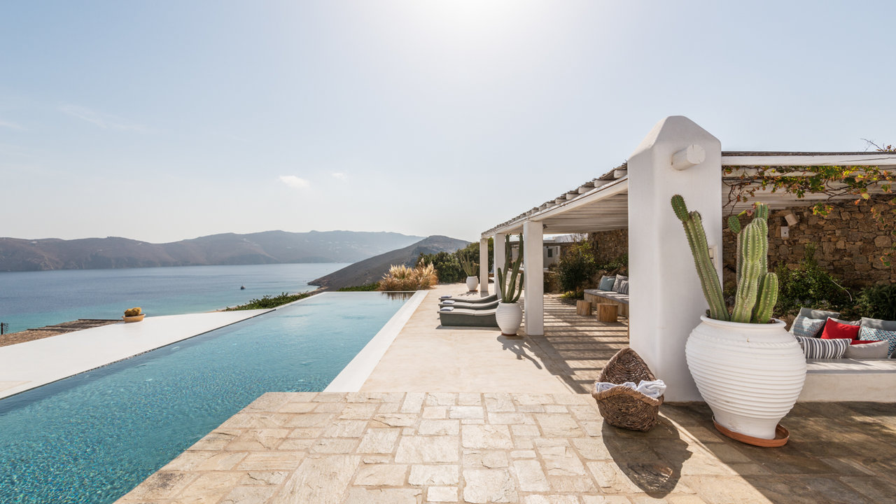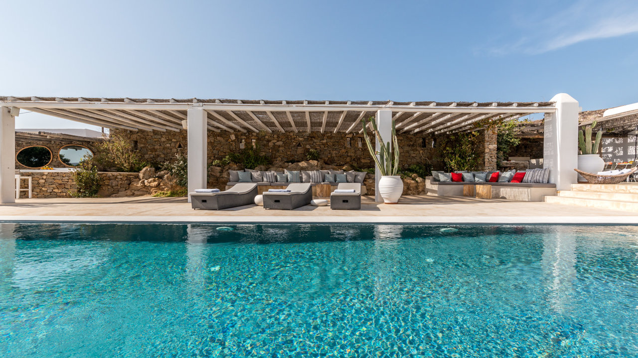 Ideally located in Panormos in Mykonos, villa Bellezza is definitely one of the most luxurious destinations in Cyclades. Highlighted by its astonishing sea vistas, its Mykonian ambience and its traditional architecture, villa Bellezza has astounding outer terraces where a private swimming pool with sunbeds are situated to relax and admire the immense sunset views, an outer bar and lounging area where you can capture the luxurious vibe Belezza provides while listening to your favorite playlists from the indoor and outdoor surround sound system and an outer dining area to enjoy an Al-Fresco dinner with your family and friends.