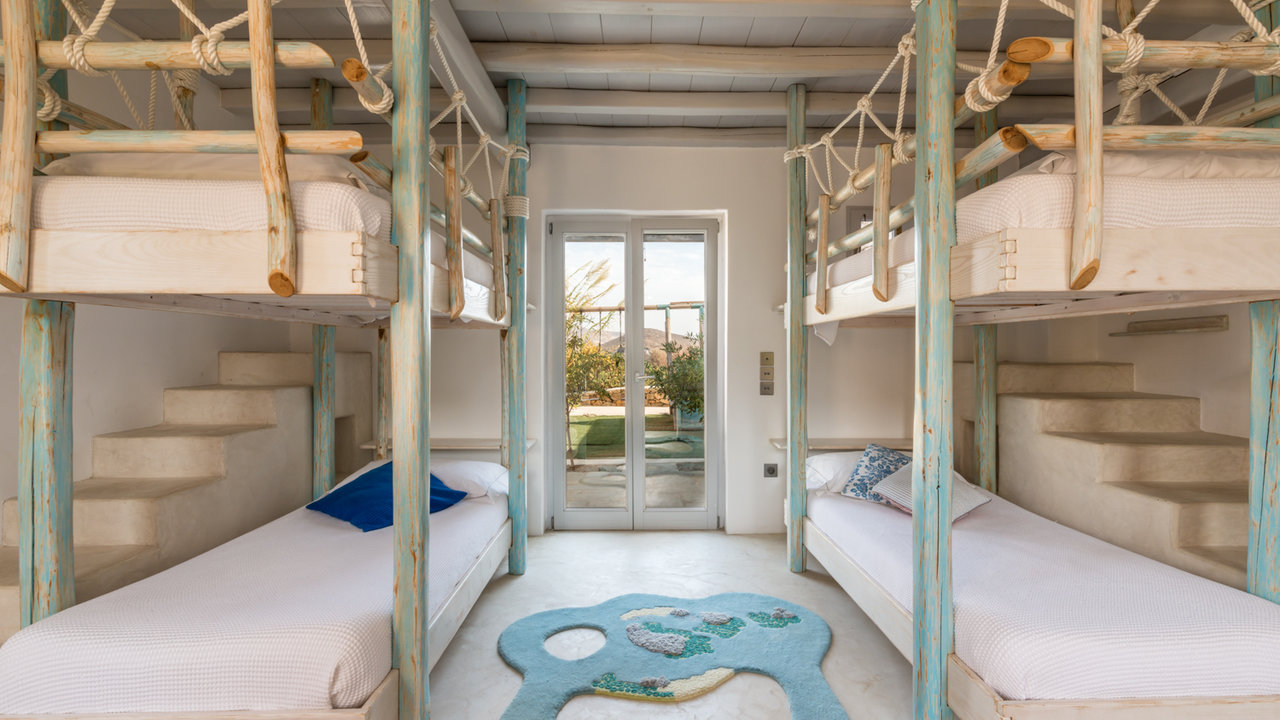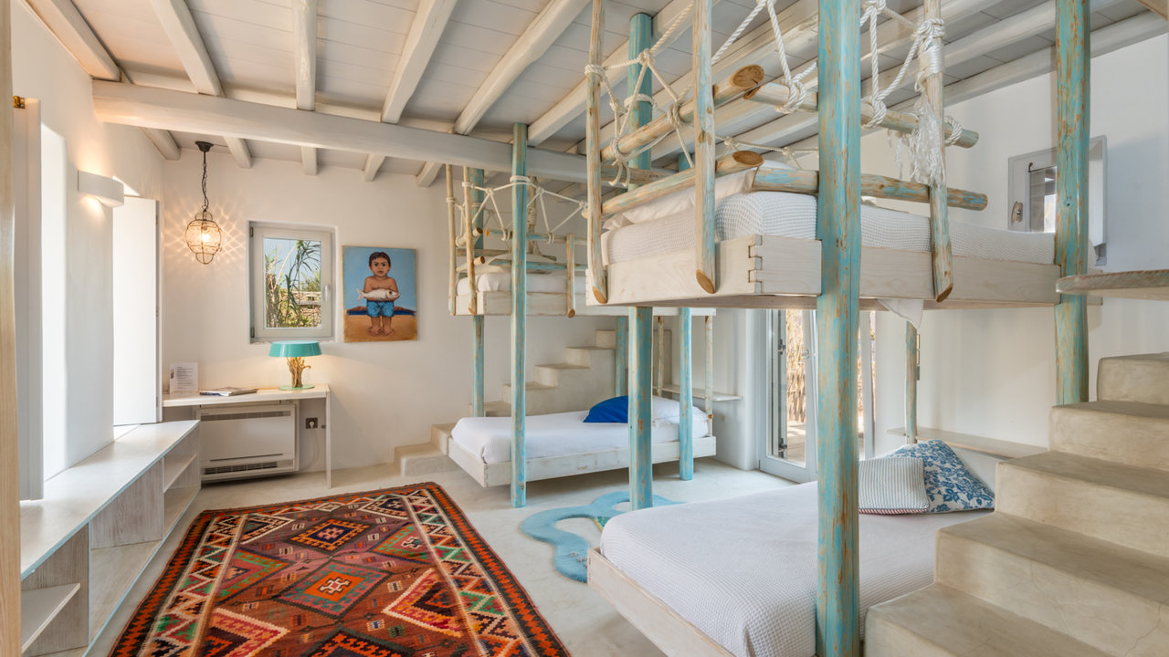 - 1 Twin/Double bedroom and 1 connected bedroom with two sets of bunk beds (4 single beds ideal for children, teenagers or nannies) with shared bathroom and A/C, opens up to garden and playground