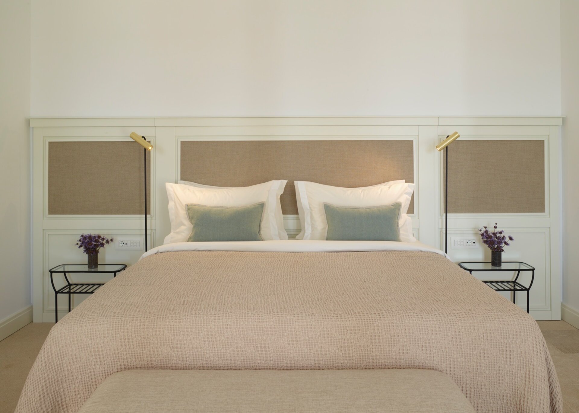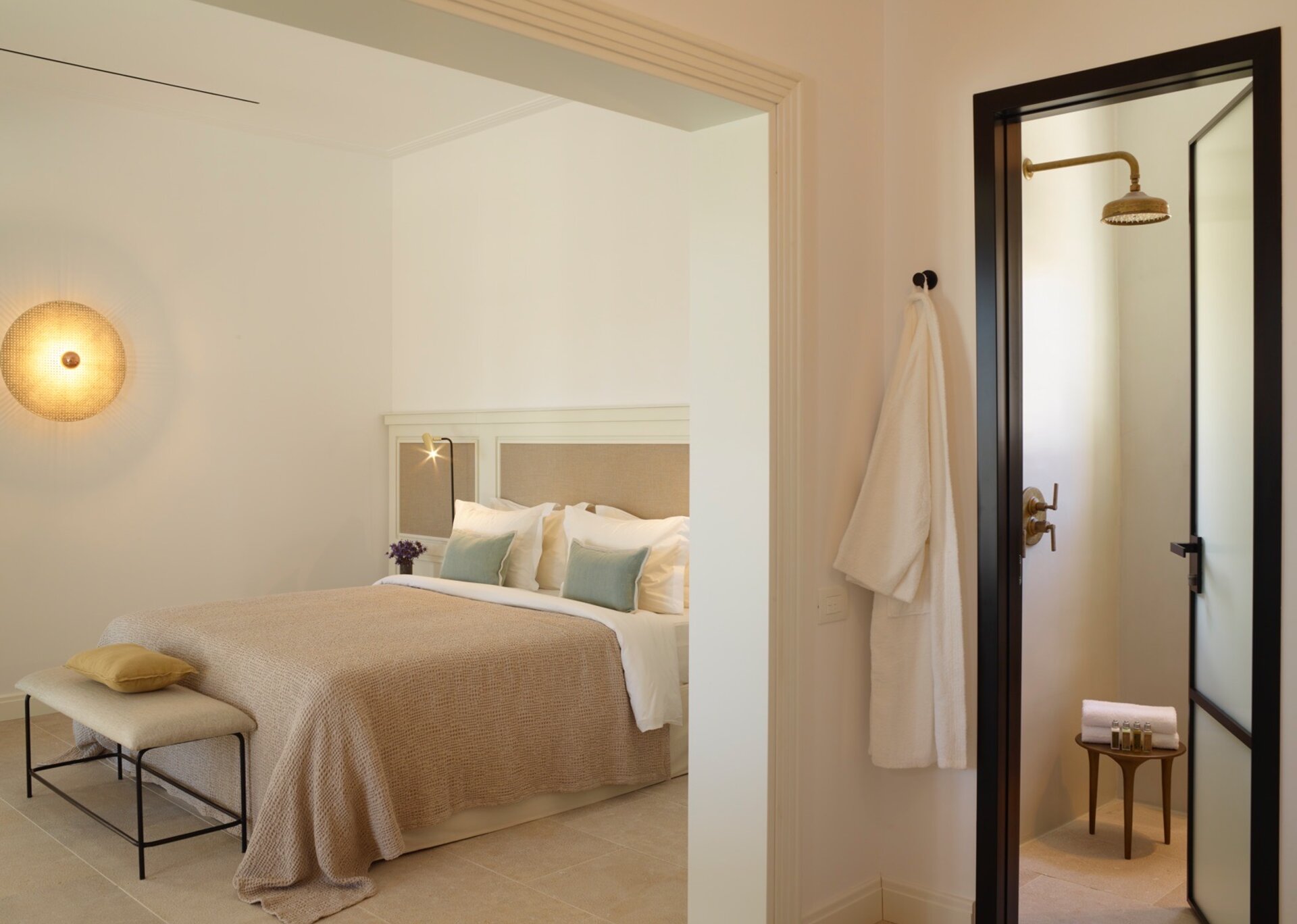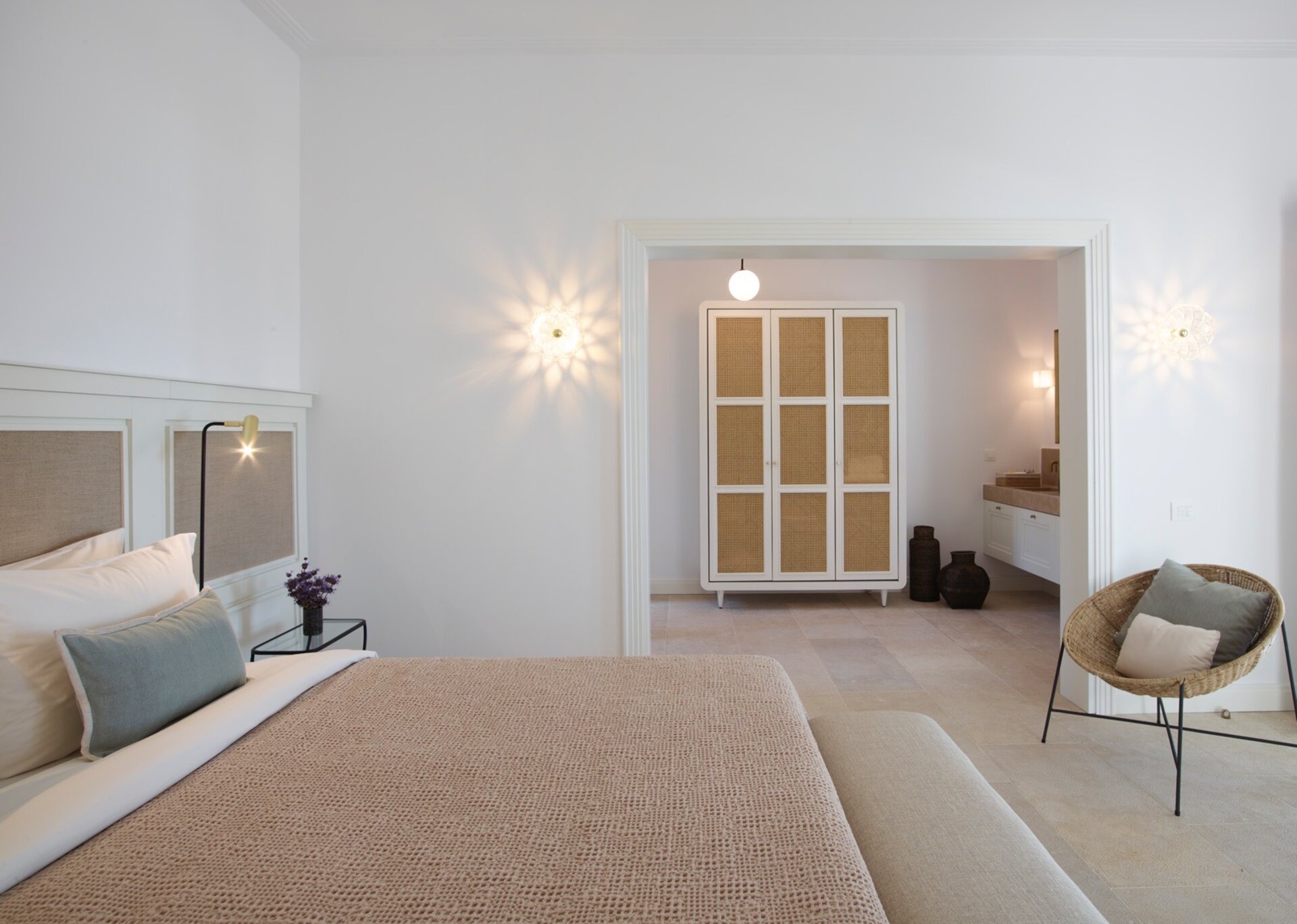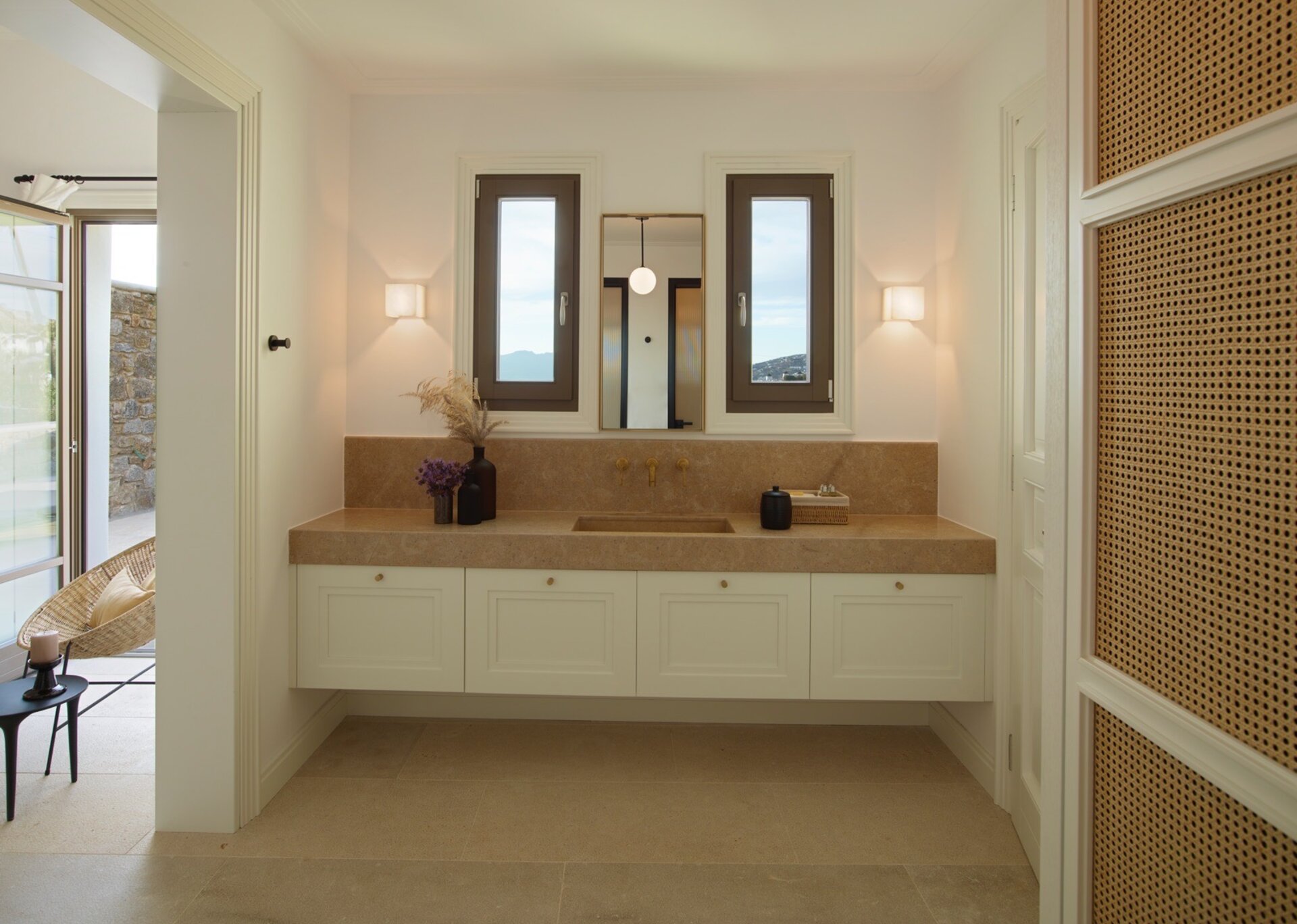 Villa Cannes uses warm neutrals to help create the harmonious atmosphere in understated island style, while fitted with contemporary amenities and beautiful details like marble floors, opulent bathrooms and plush cotton linens. Within, the interconnecting one bedroom suite combines modern amenities, comfortable spaces and touches of elegance, creating an exquisite ambience of privacy. It consists of one large bedroom with a King Size bed and contemporary interiors furnished in a minimal yet warm and inviting design. In the wonderful living spaces a plush sofa invites guests to pop their feet up and rest, looking out through an immense set of terrace doors. The kitchenette is contemporary and has everything you could wish for to prep a delicious quick meal.