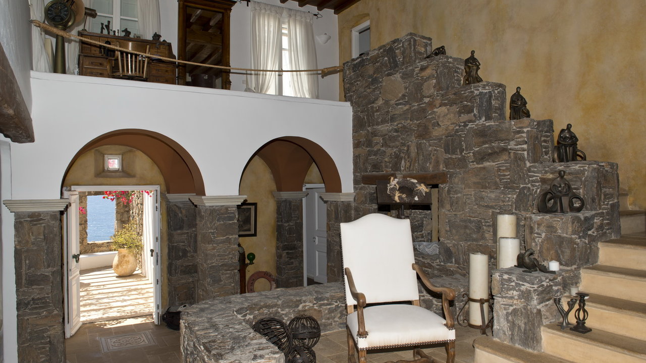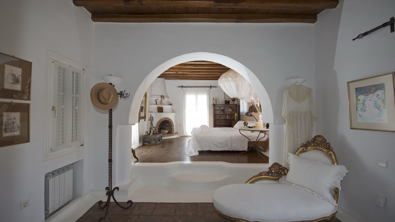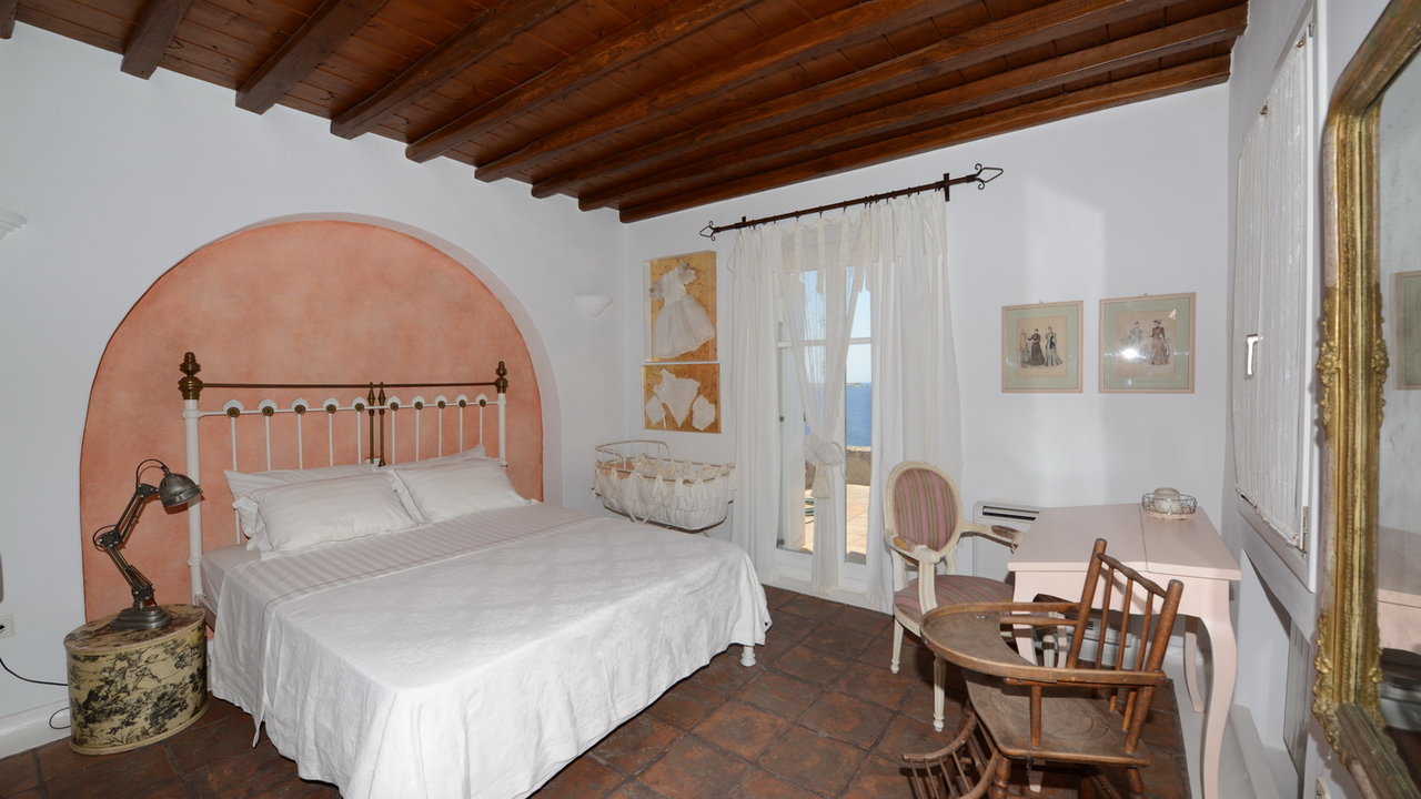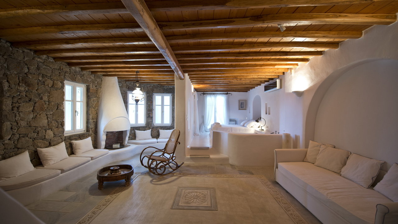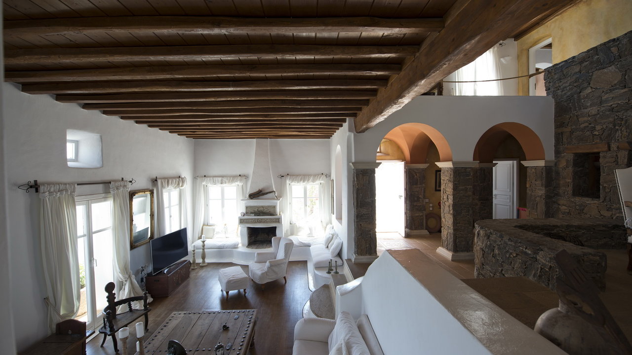 The interior design has a discrete elegant touch, its brightly decorated and furnished only with high class pieces, combined by the traditional Cycladic architecture of the property creates an impressive atmosphere. The inside of the house is luxurious and perfectly captivates the Mykonian spirit. The mood is lavish. There is a wonderfully decorated and cozy living room that offers a stunning fireplace that creates a romantic ambience inside Cassiopeia, while near the living room there is a sumptuous dining area for capturing family moments and enjoy an appropriate meal, prepared in the fully equipped kitchen. The whole estate is full of features and amenities like daily cleaning, alarm main-house, bath amenities, air conditioning, while outside the house there is a parking available to make your life easier. In this residence, 16 people can be comortably accommodated in 7 spacious, fully featured bedrooms.