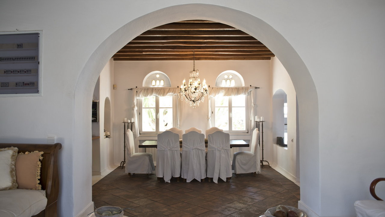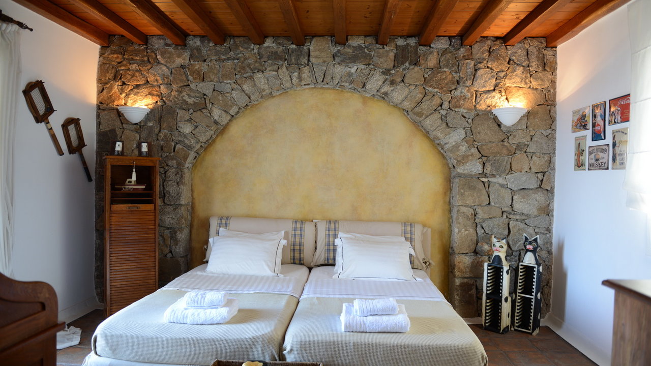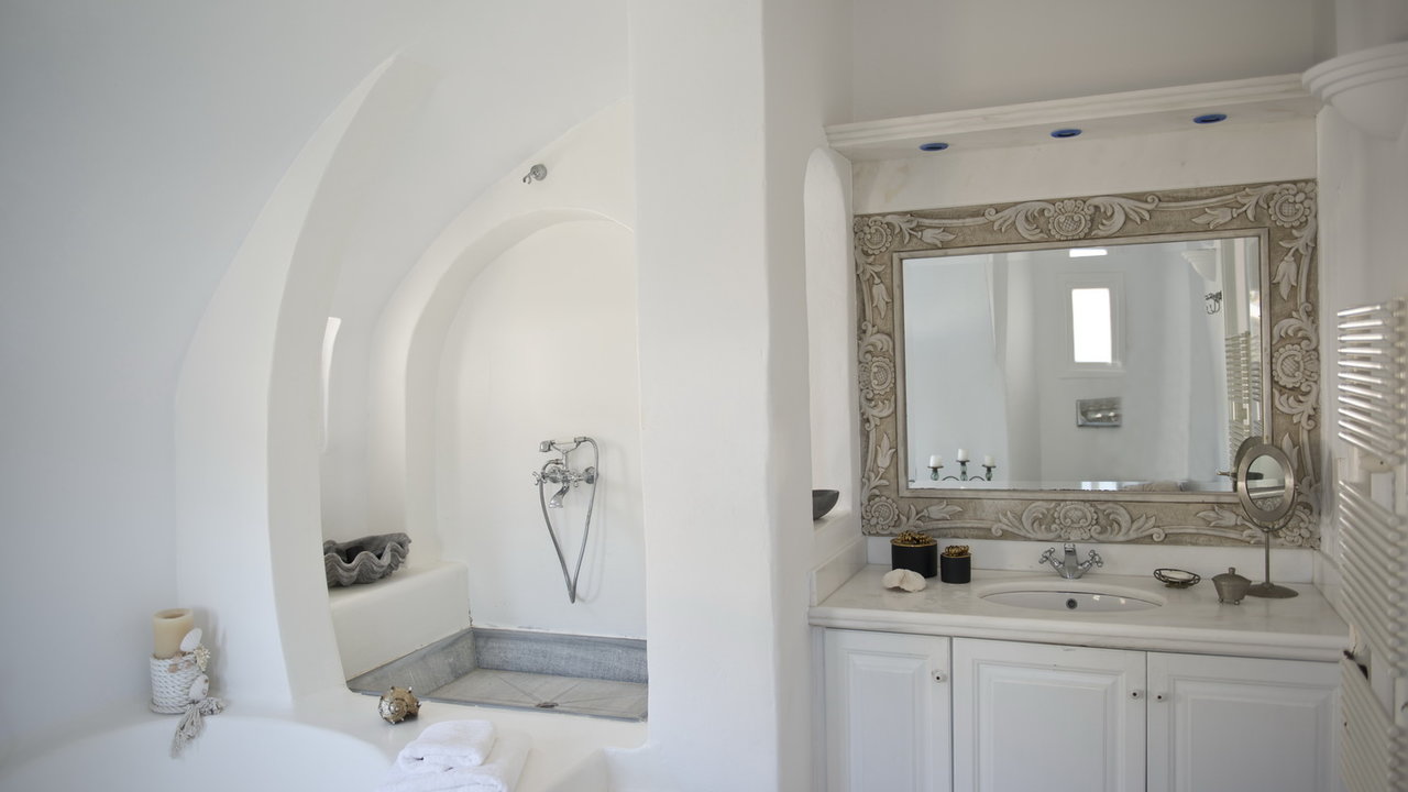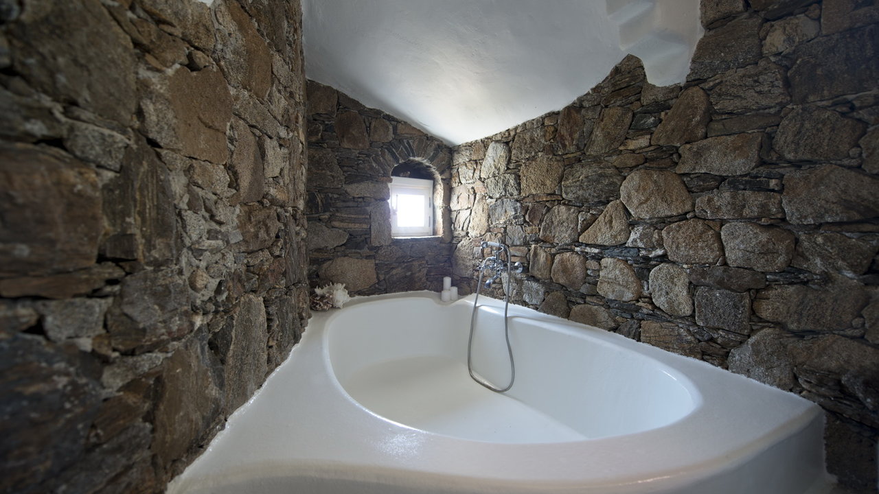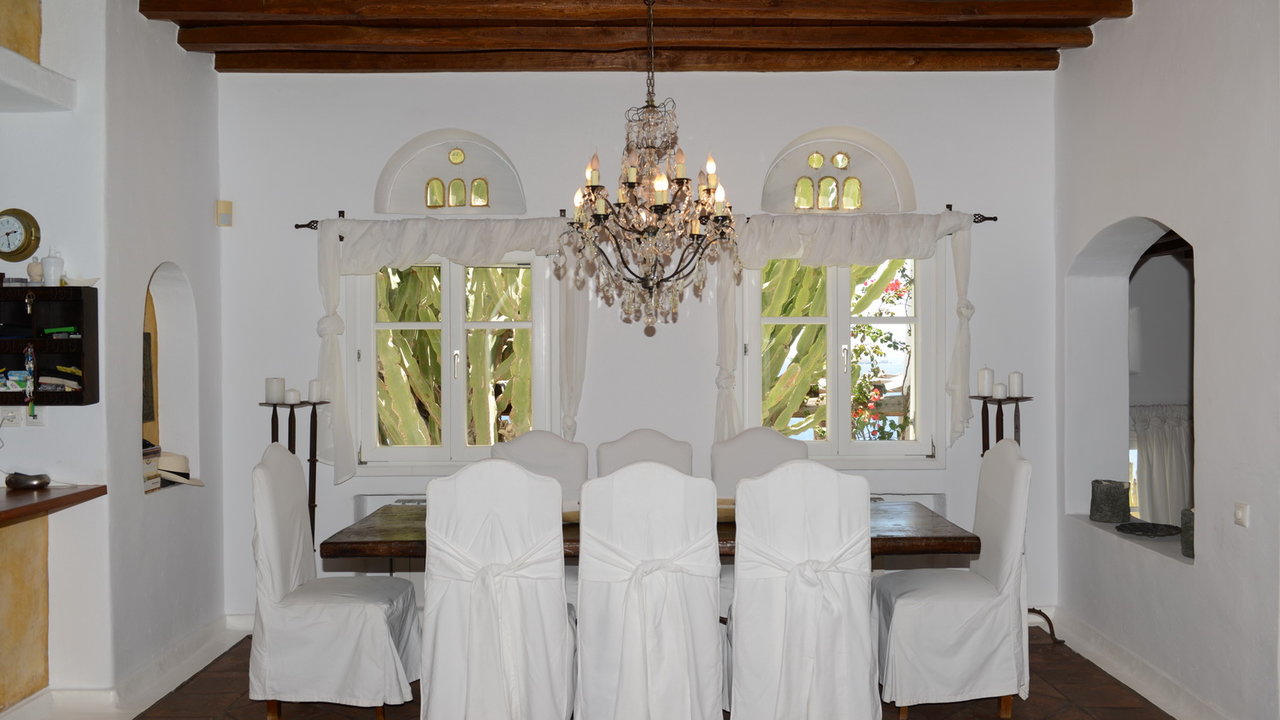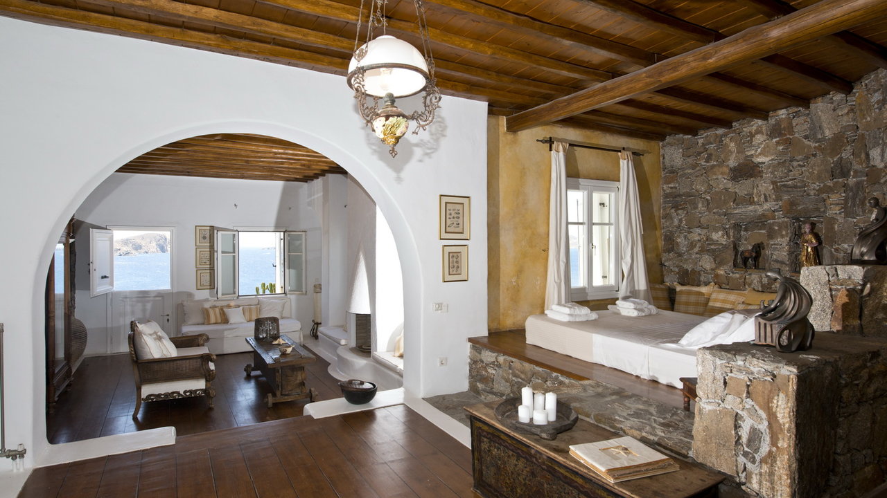 The interior design has a discrete elegant touch, its brightly decorated and furnished only with high class pieces, combined by the traditional Cycladic architecture of the property creates an impressive atmosphere. The inside of the house is luxurious and perfectly captivates the Mykonian spirit. The mood is lavish. There is a wonderfully decorated and cozy living room that offers a stunning fireplace that creates a romantic ambience inside Cassiopeia, while near the living room there is a sumptuous dining area for capturing family moments and enjoy an appropriate meal, prepared in the fully equipped kitchen. The whole estate is full of features and amenities like daily cleaning, alarm main-house, bath amenities, air conditioning, while outside the house there is a parking available to make your life easier. In this residence, 16 people can be comortably accommodated in 7 spacious, fully featured bedrooms.